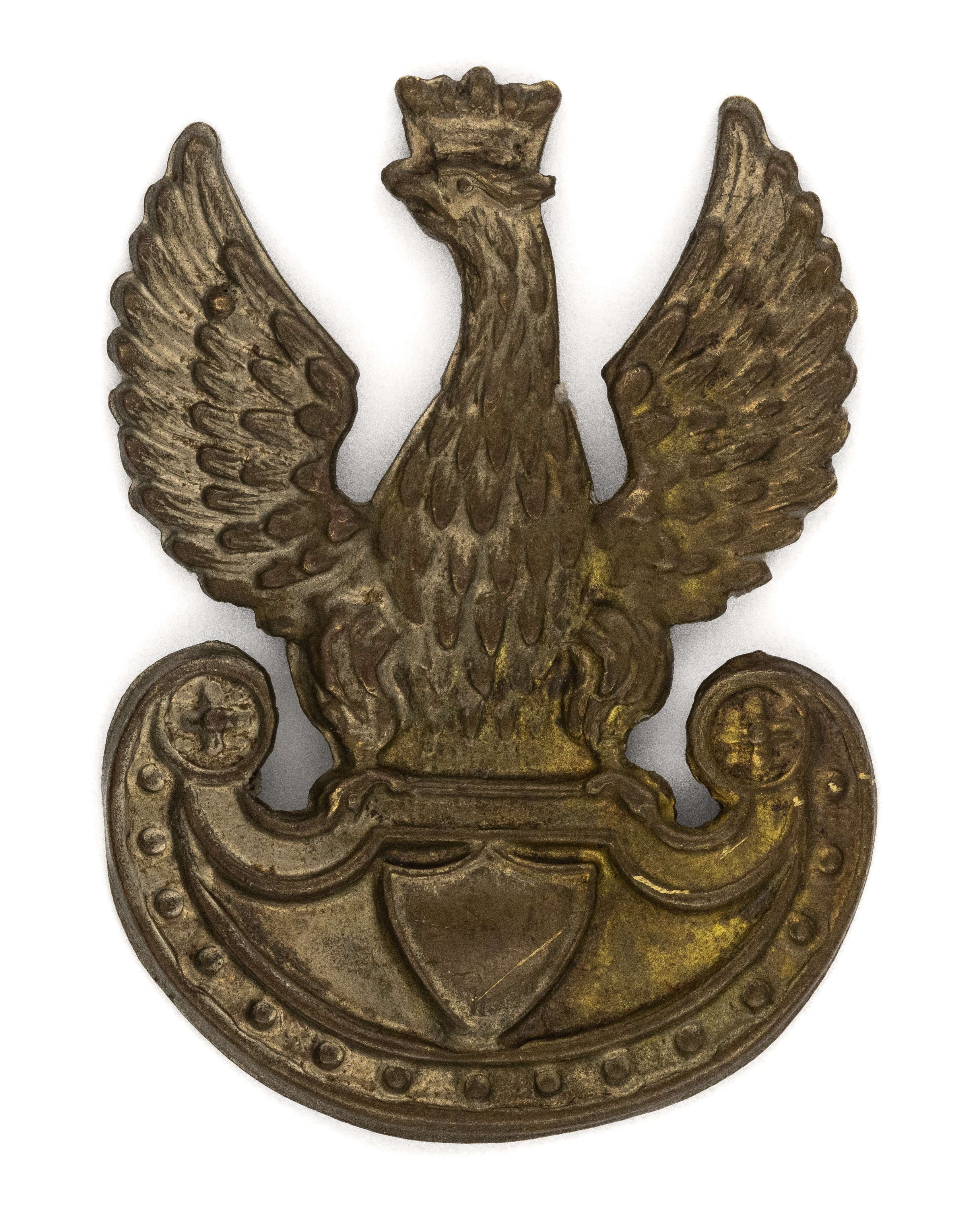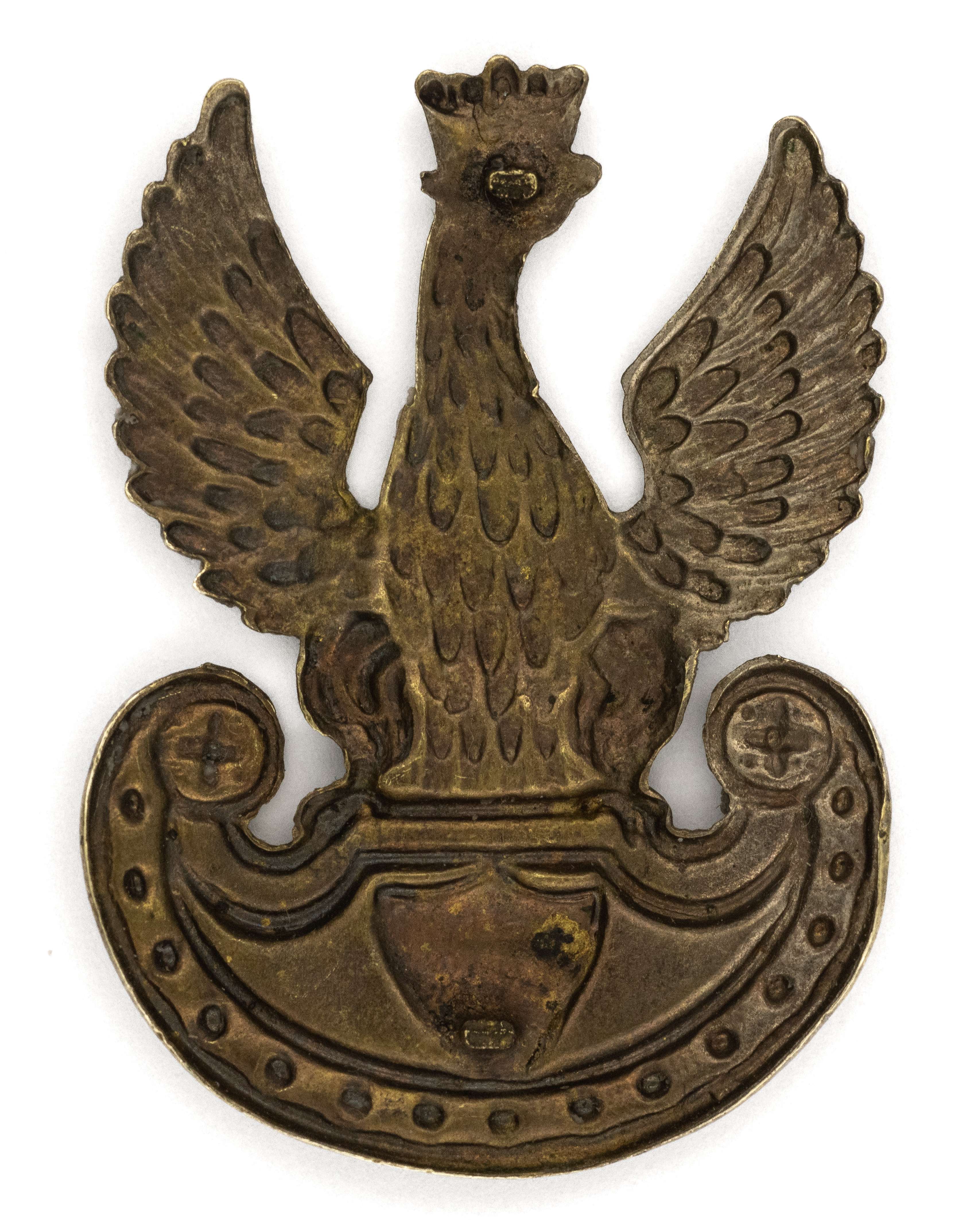 Orzeł wz. 17 Wiedeń 1917/18; 40x29mm. Wykonany z mosiądzu srebrzonego. Rewers z kontrą. Brak oryginalnego mocowania. Lit. Tomasz Zawistowski, Polskie Orły do czapek w latach 1900-17, str. 90, il. 102- jednak w opisywanym egzemplarzu zachowała się korona - rzadki, przejściowy wariant orła!! Stan bardzo dobry.