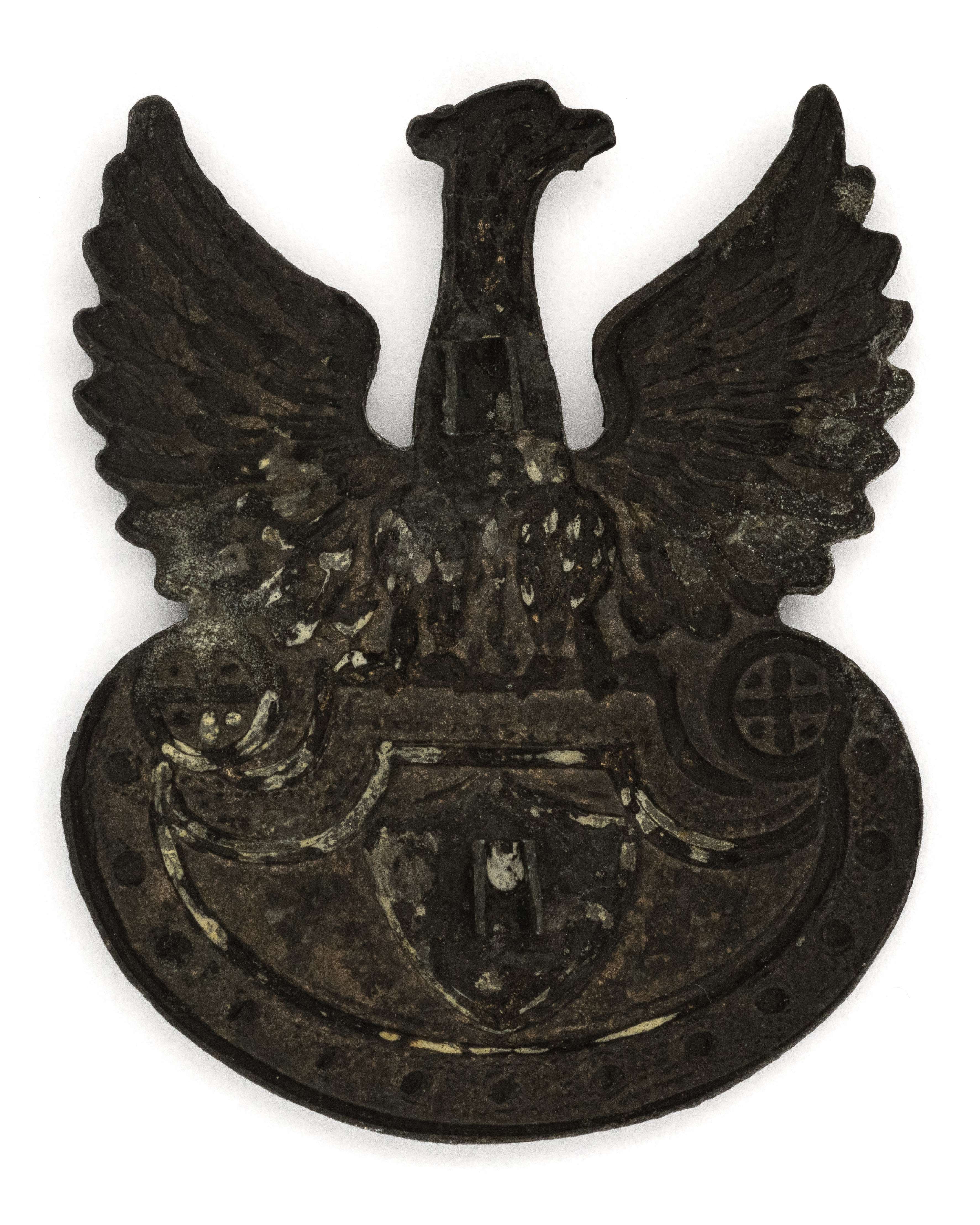 Orzeł wz. 17 z usuniętą koroną; 37x30mm. Wykonany z cynku. Rewers z kontrą. Brak oryginalnego mocowania. Lit. Tomasz Zawistowski, Polskie Orły do czapek w latach 1900-17, str. 208, il. 291. Stan bardzo dobry.