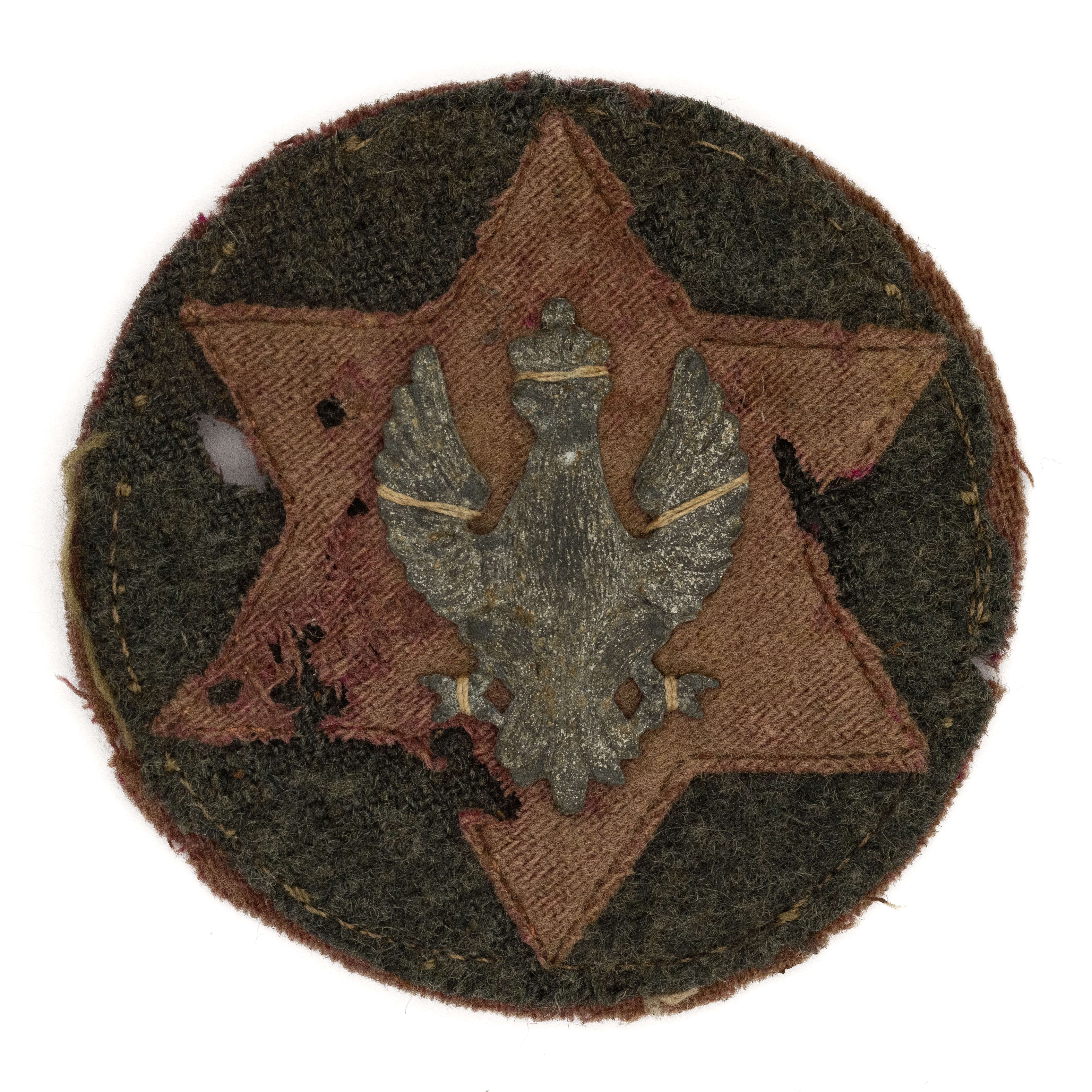 Oznaka naramienna tzw. Gwiazda Beselera; średnica 62 mm, orzeł 24x33 mm - cynk. Wieloczęściowa oznaka - amarantowe sukno (z charakterystycznym owalem na rewersie) na tym naszyte sukno mundurowe, na nim sześcioramienna gwiazda i na niej nałożony orzeł. Oznaki te przeznaczone były do noszenia na rękawie przez żołnierzy Polskiej Siły Zbrojnej. Lit. Tomasz Zawistowski, Polskie Orły do czapek w latach 1900-17, str. 181. il.292. Stan dobry, uszkodzenia przez mole.