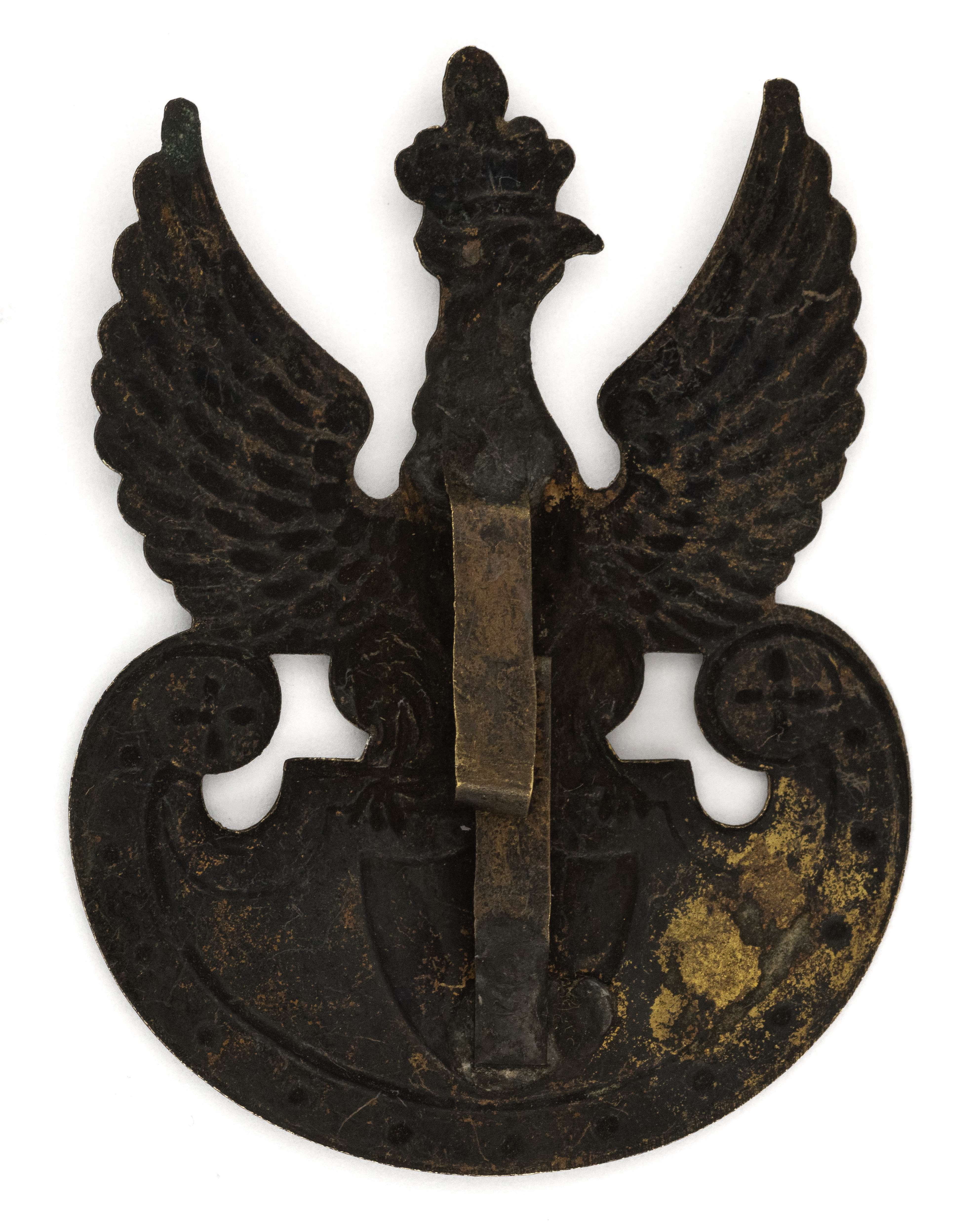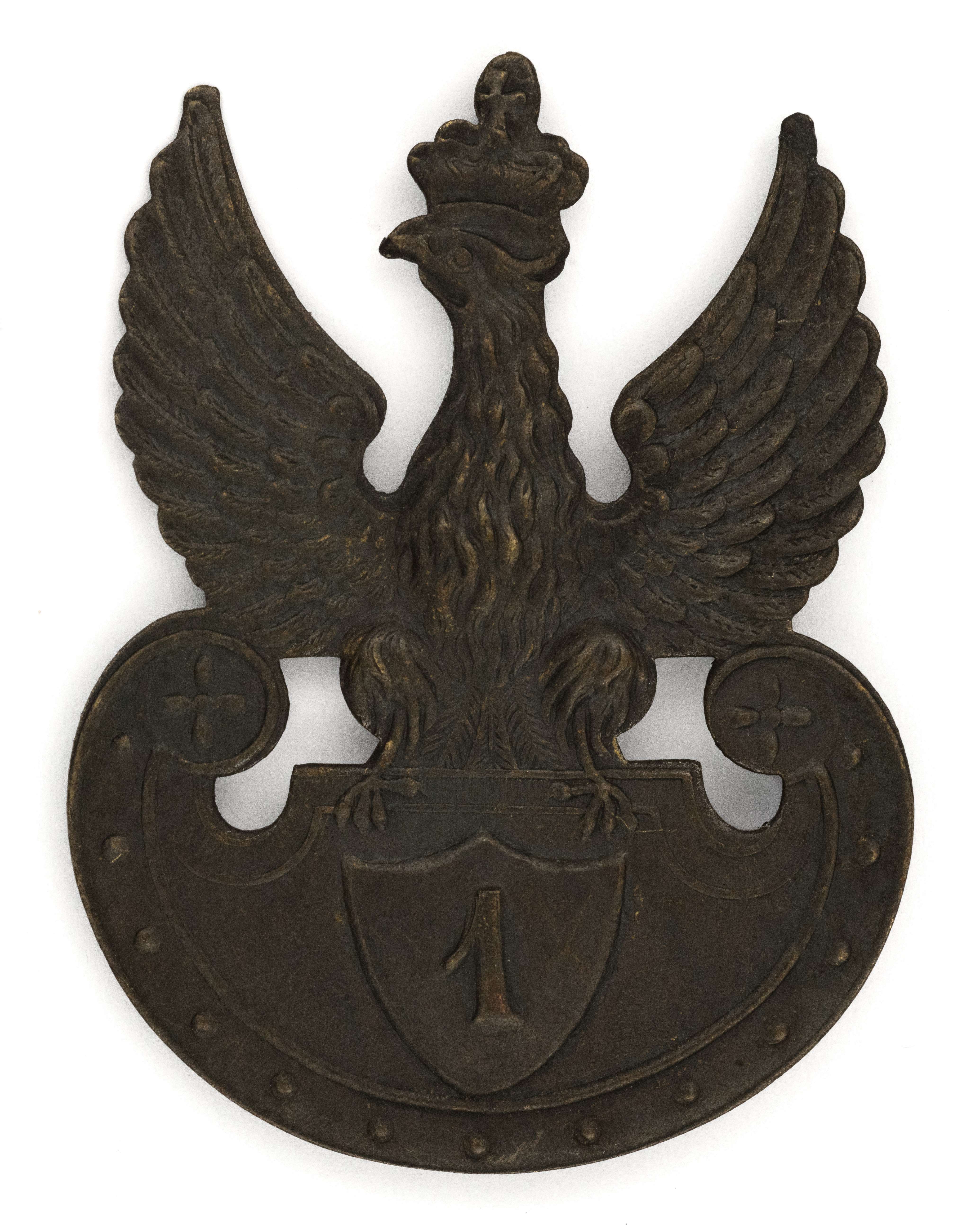 Orzeł projektu Czesława Jarnuszkiewicza, cyfra 1 na tarczce; 52,5x39,5mm. Wykonany z mosiądzu. Rewers z kontrą. Mocowany na dwie pionowe płaskie blaszki. Lit. Tomasz Zawistowski, Polskie orły do czapek w latach 1900-1917, str. 131. Stan bardzo dobry.