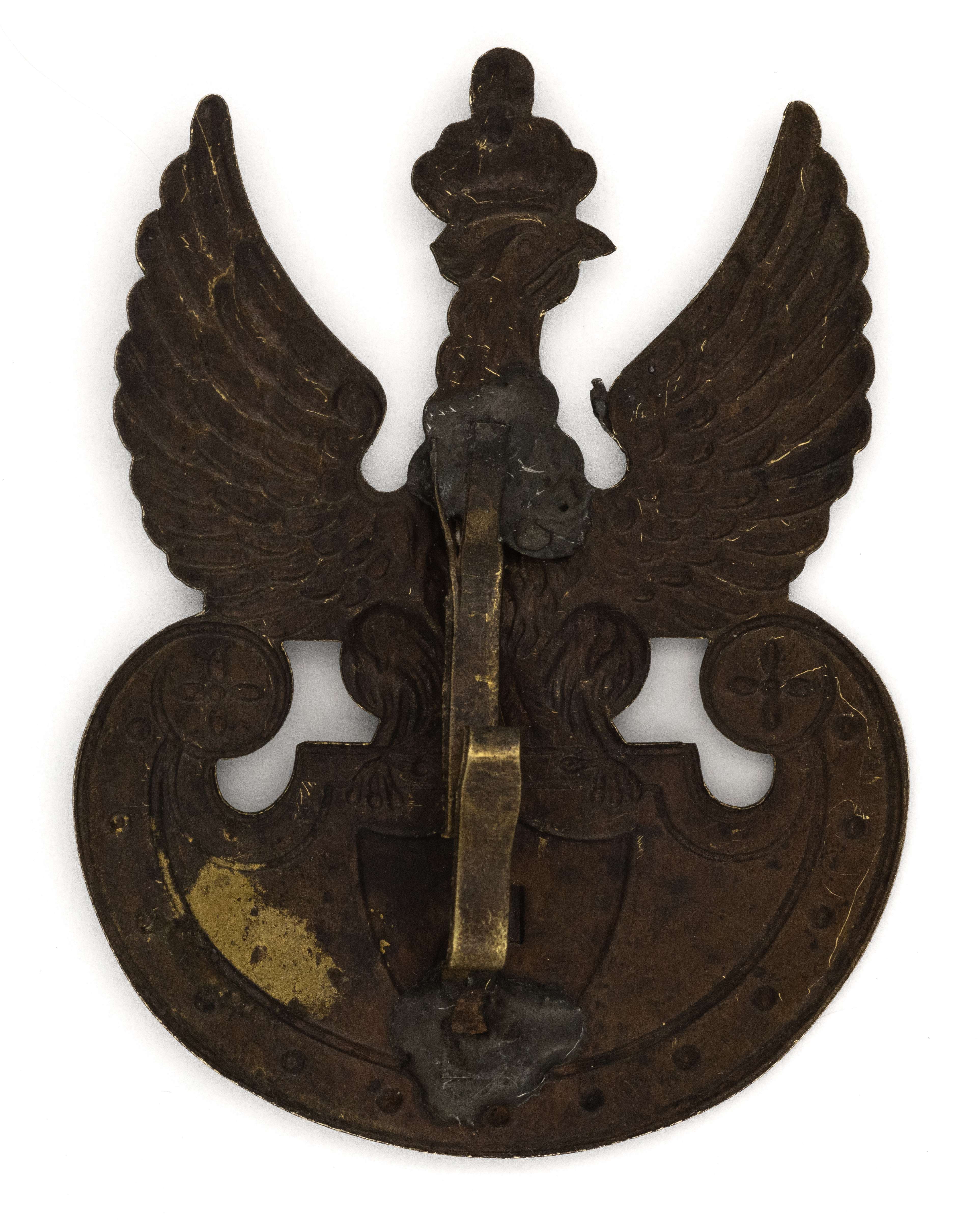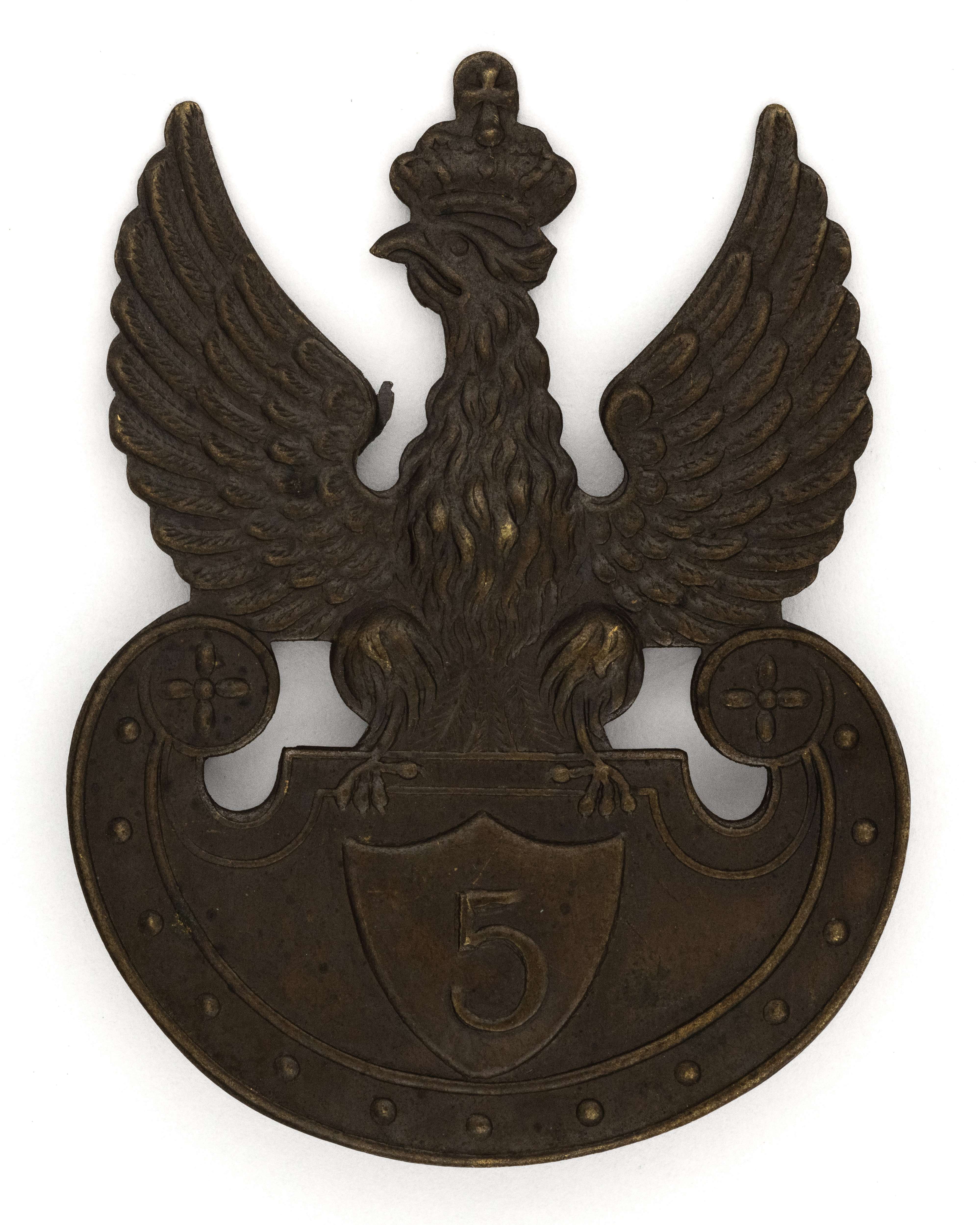 Orzeł projektu Czesława Jarnuszkiewicza, cyfra 5 na tarczce; 52,5x39,5mm. Wykonany z mosiądzu. Rewers z kontrą. Mocowany na dwie pionowe płaskie blaszki. Lit. Tomasz Zawistowski, Polskie orły do czapek w latach 1900-1917, str. 131. Stan bardzo dobry.