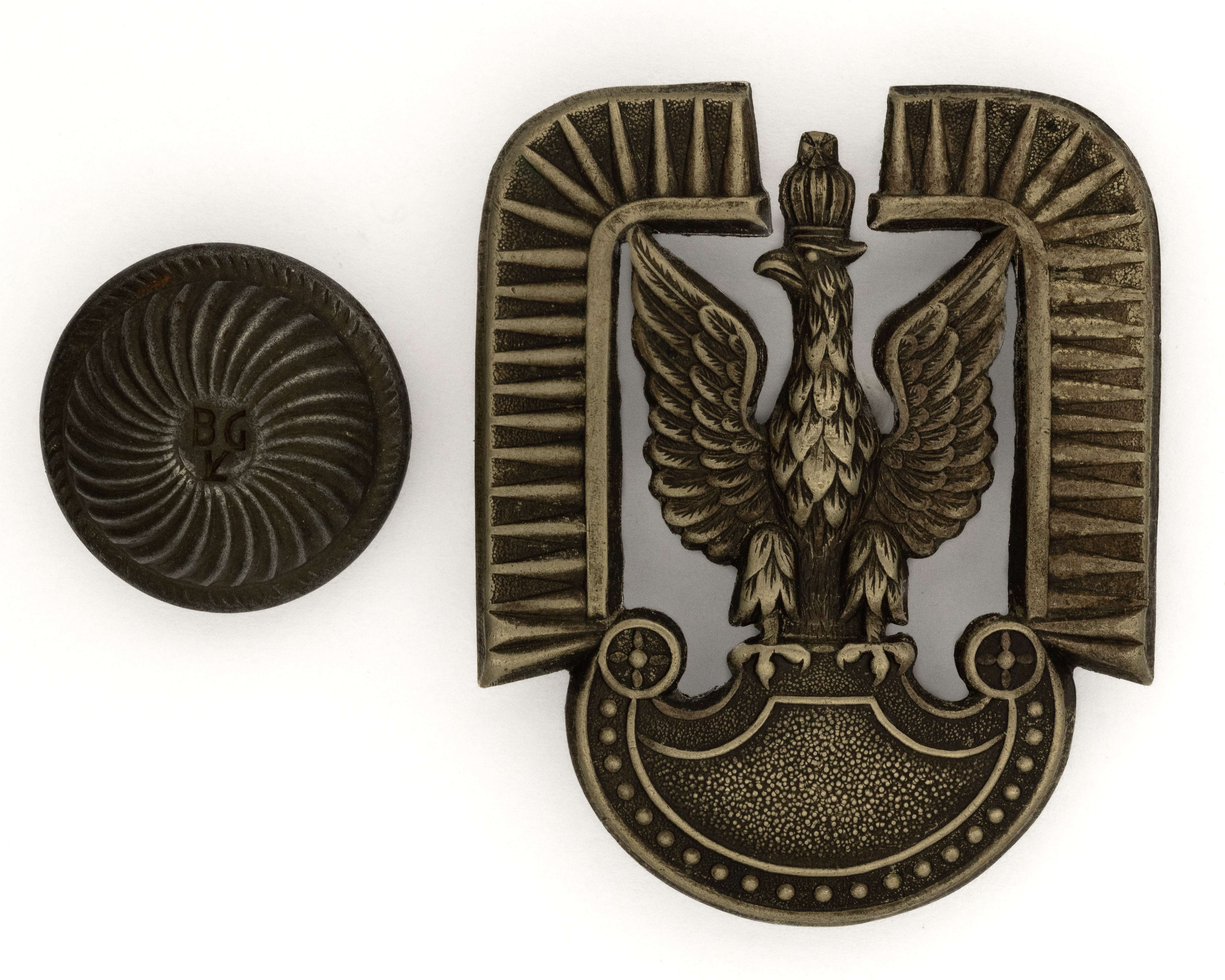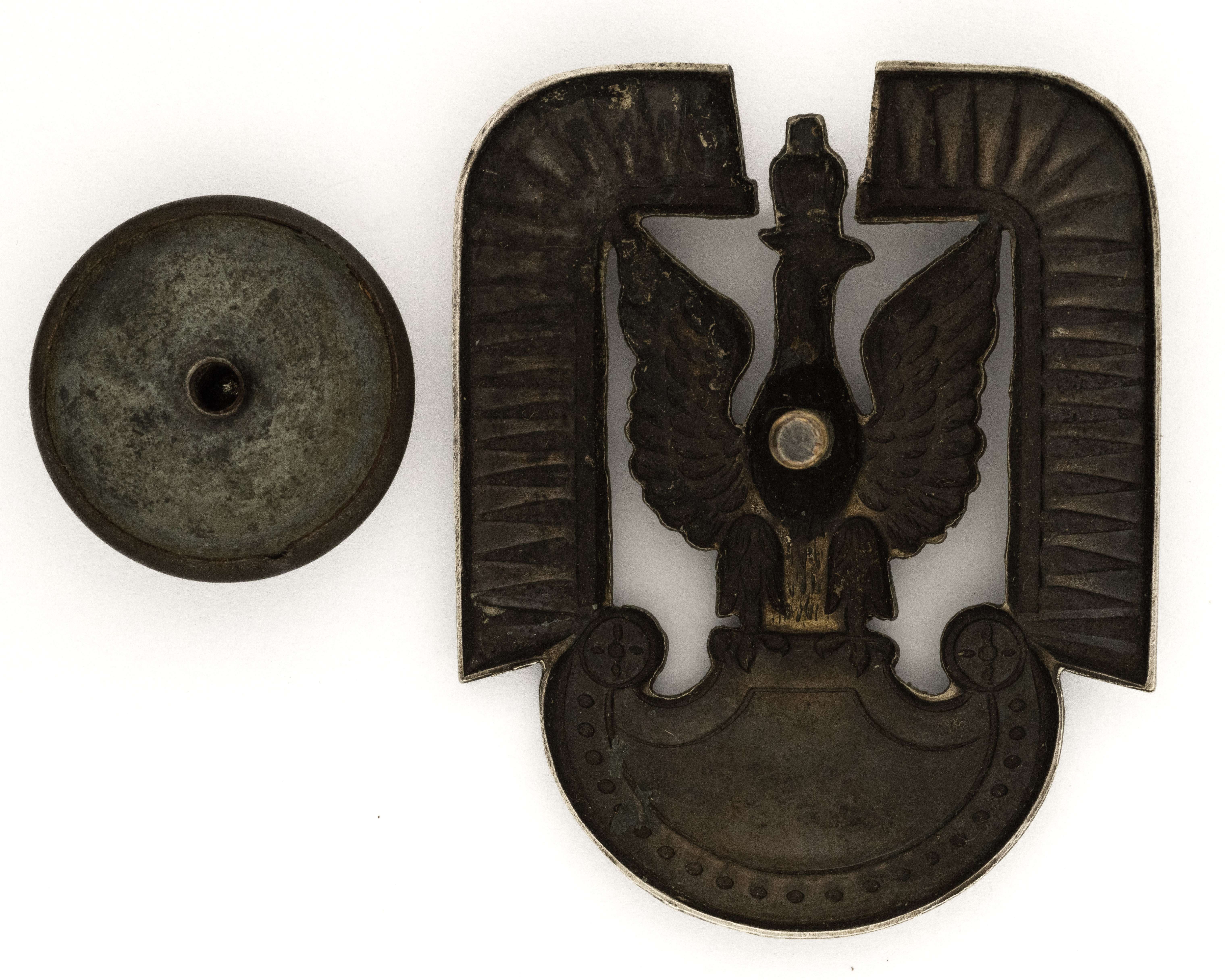 Orzeł lotniczy wz. 36 - dla szeregowych lotnictwa; 61x50. Wykonany z alpaki. Rewers z kontrą. Mocowany na słupek ze stalowym guzem ochronnym, sygnowanym BGŁ Lit. Tomasz Zawistowski, Polskie orły do czapek w latach 1919-39, str.98- 105. Stan bardzo dobry.