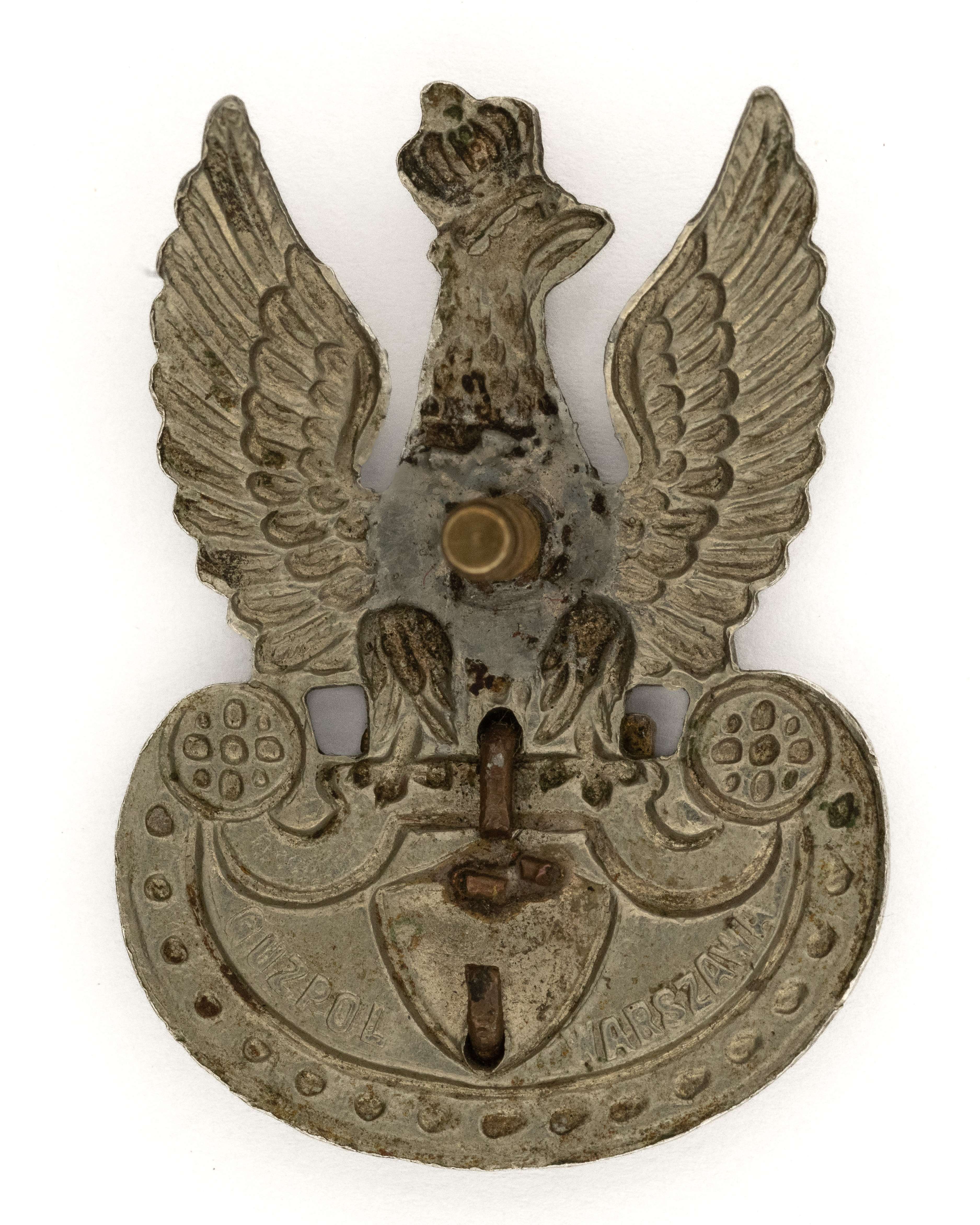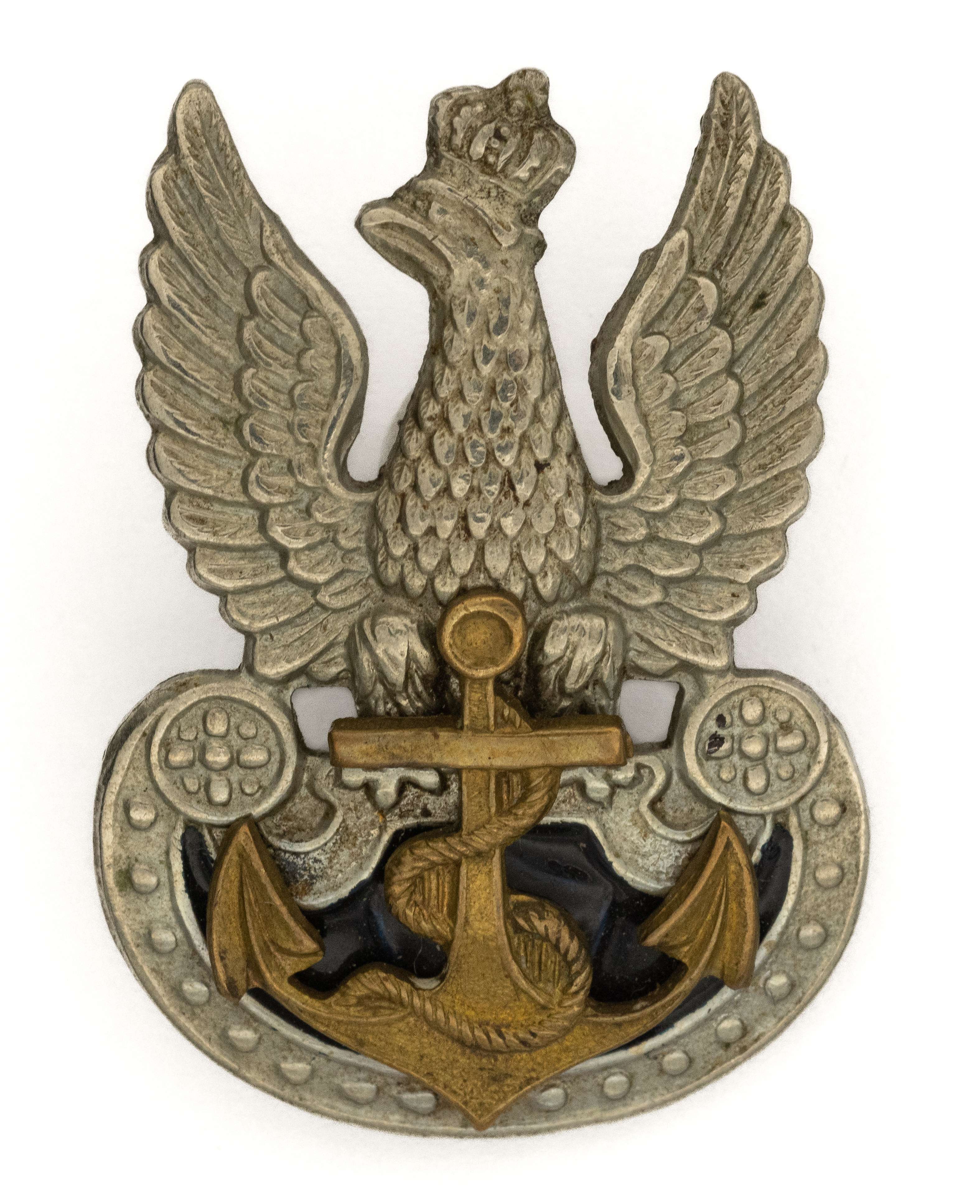 Orzeł Marynarka Wojenna; 40x29mm. Wykonany z alpaki, lakierowany. Wieloczęściowy - kotwica nakładana. Rewers z kontrą. Mocowany na słupek - brak nakrętki. Sygnowany - GUZPOL WARSZAWA. Lit. Tomasz Zawistowski, Polskie orły do czapek w latach 1919-39, str. 22-23. Stan bardzo dobry.