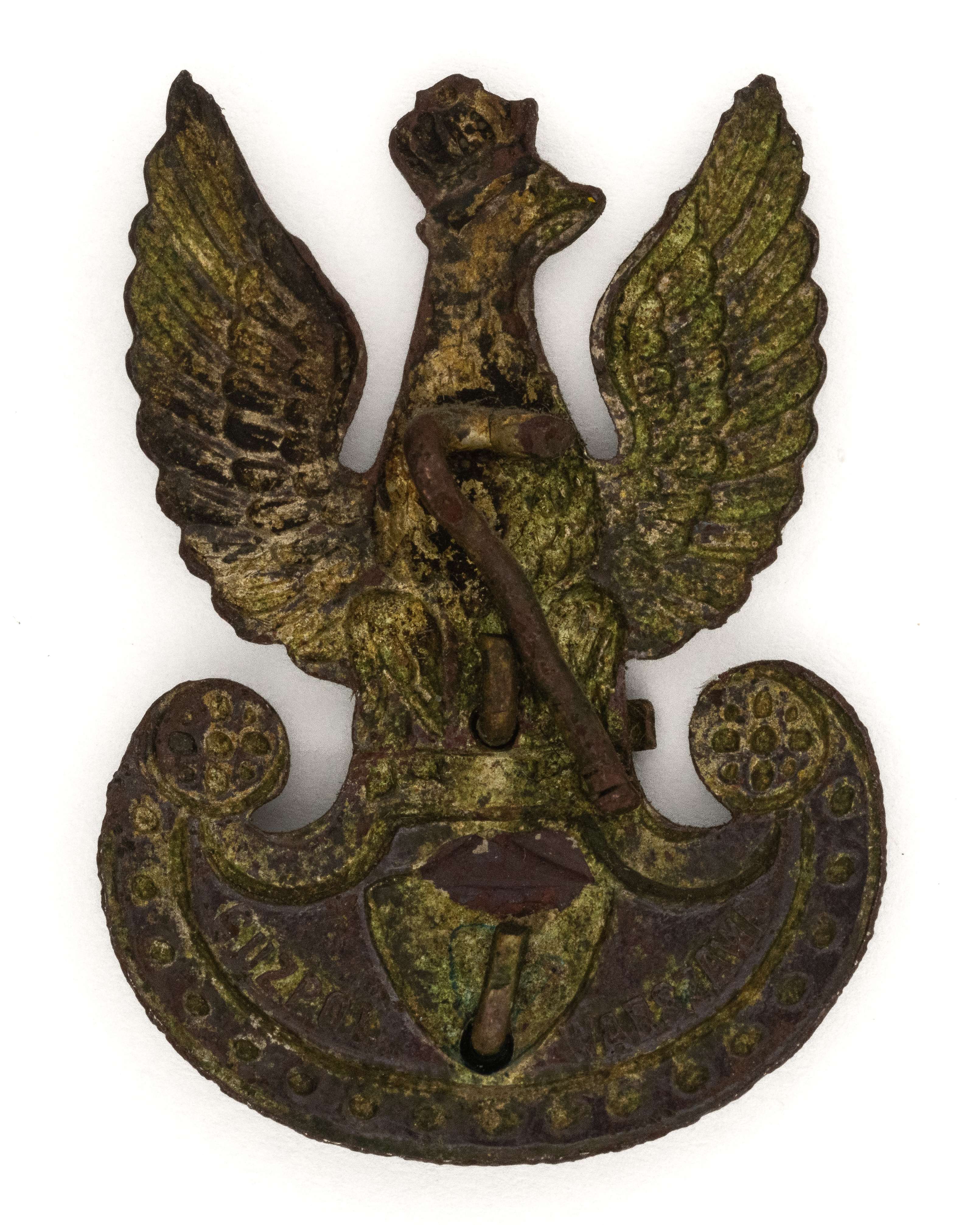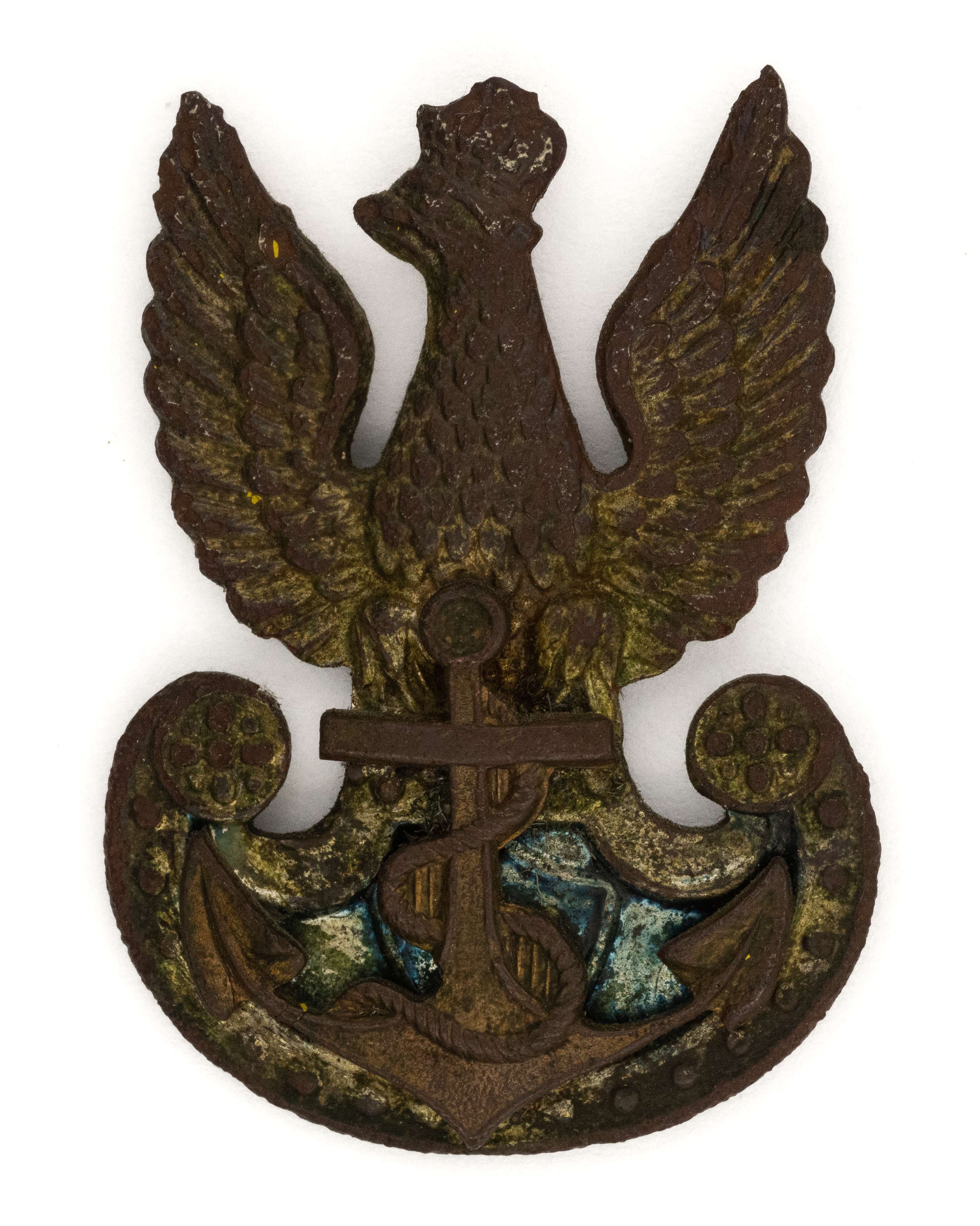 Orzeł Marynarka Wojenna; 40x29mm. Wykonany z alpaki, lakierowany. Wieloczęściowy - kotwica nakładana. Rewers z kontrą. Mocowany na dwie pary drutów - został jeden. Sygnowany - GUZPOL WARSZAWA. Lit. Tomasz Zawistowski, Polskie orły do czapek w latach 1919-39, str. 22-23. Stan dobry.