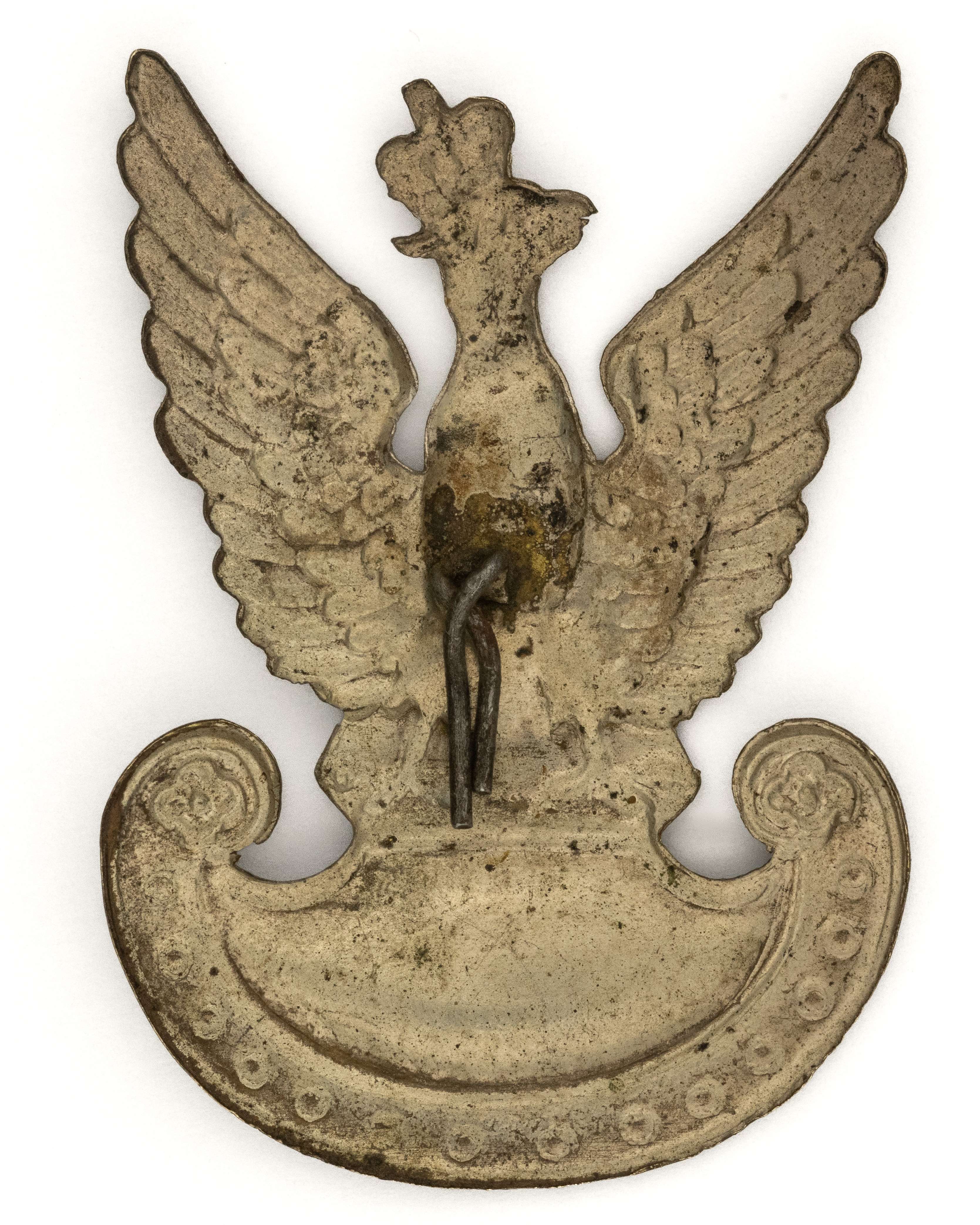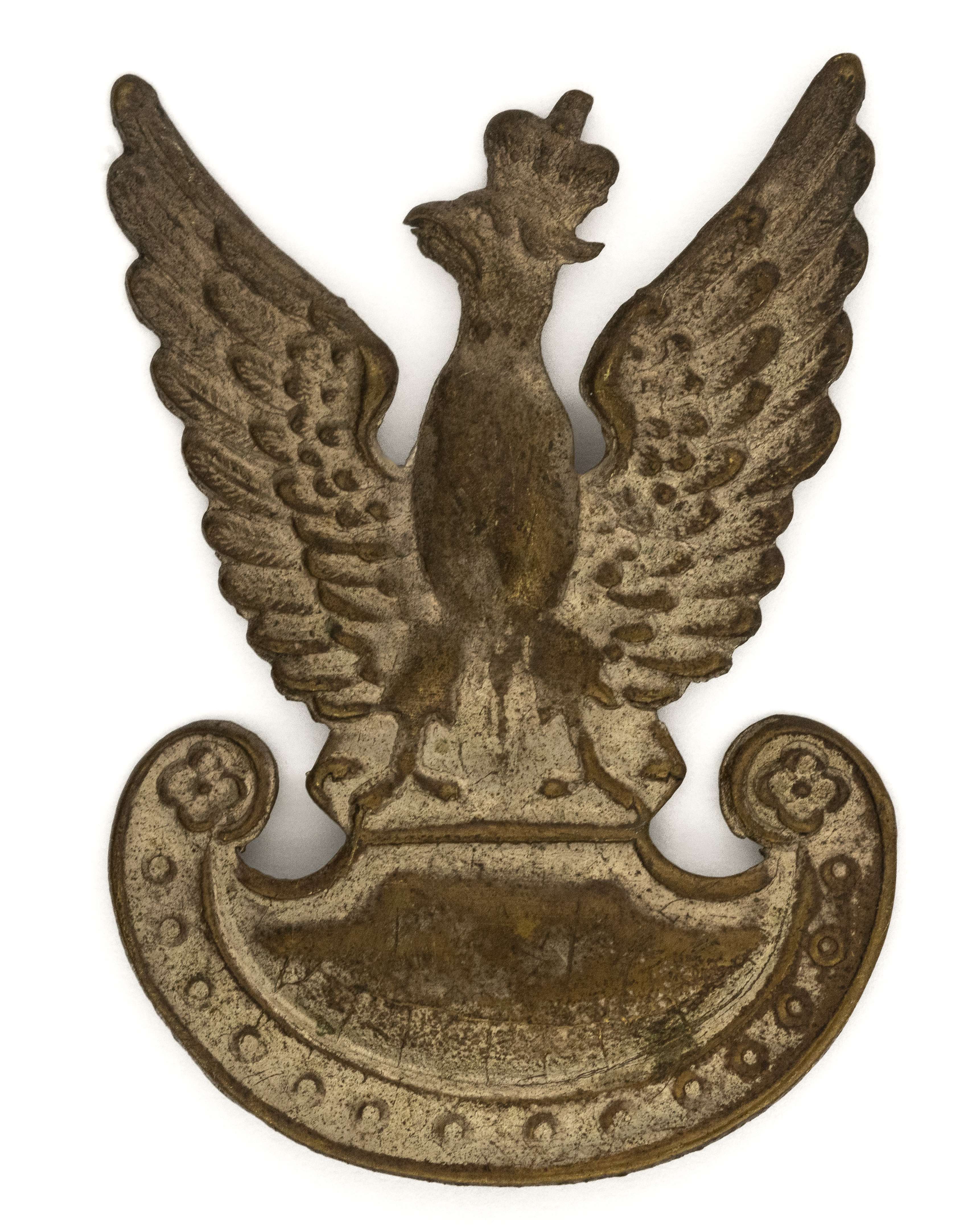 Orzeł wz. 19 (mniejszy); 55x38mm. Wykonany z mosiądzu, ślady srebrzenia. Rewers z kontrą. Zachowane oryginalne mocowanie. Lit. Tomasz Zawistowski, Polskie orły do czapek w latach 1919-39., str.39. Stan bardzo dobry - rzadkość!.