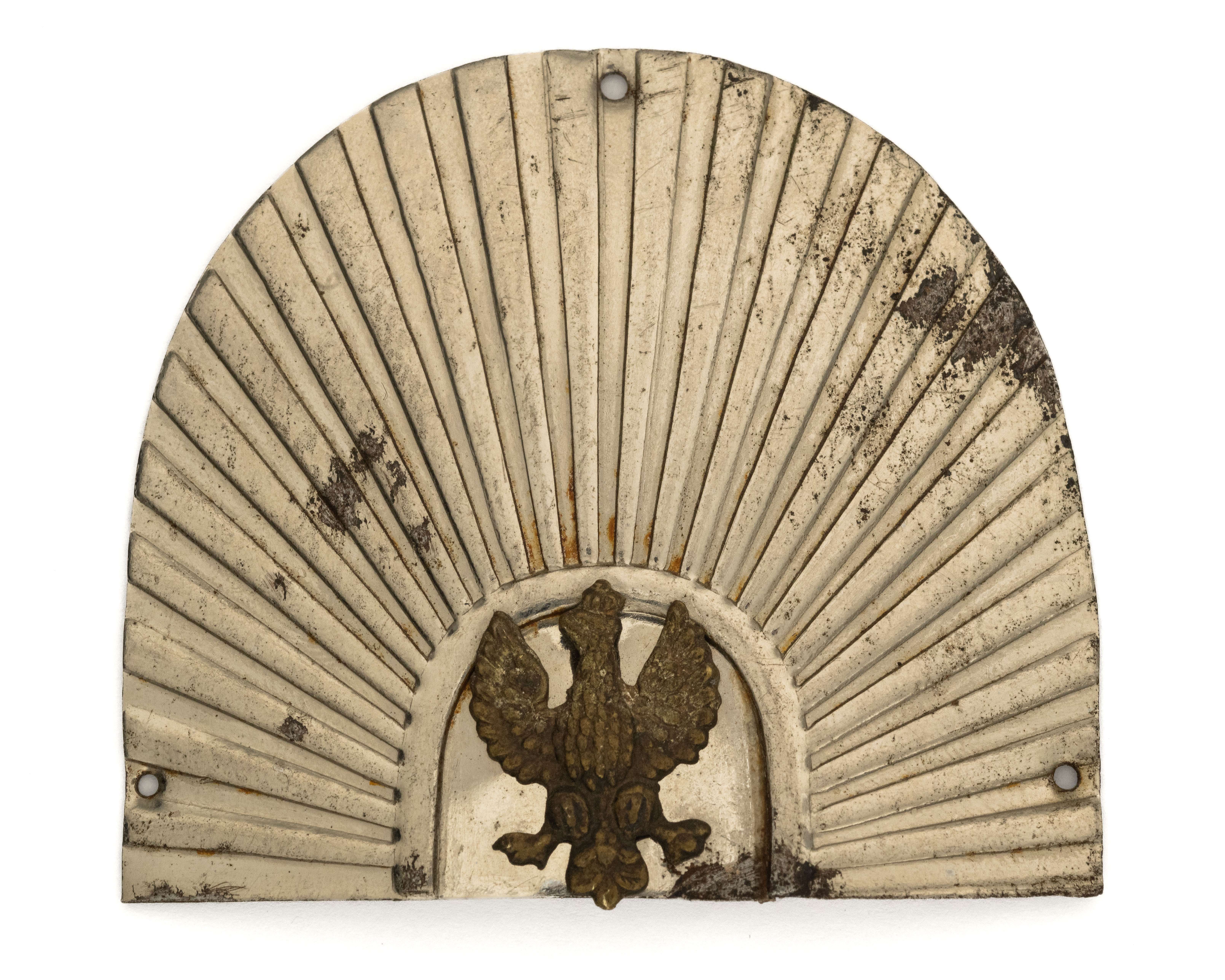 Półsłońce kadeckie / Orzeł Kadecki - wersja z orłem wz. 19; 71x64mm. Wykonane w blachy stalowej - niklowane/chromowane , wieloczęściowe - mosiężny orzełek 23,5x17mm, nakładany i mocowany na dwa druty. Rewers z kontrą. 3 dziurki do przyszycia Lit. Tomasz Zawistowski, Polskie orły do czapek w latach 1919-1939, str. 117-119. Stan bardzo dobry.