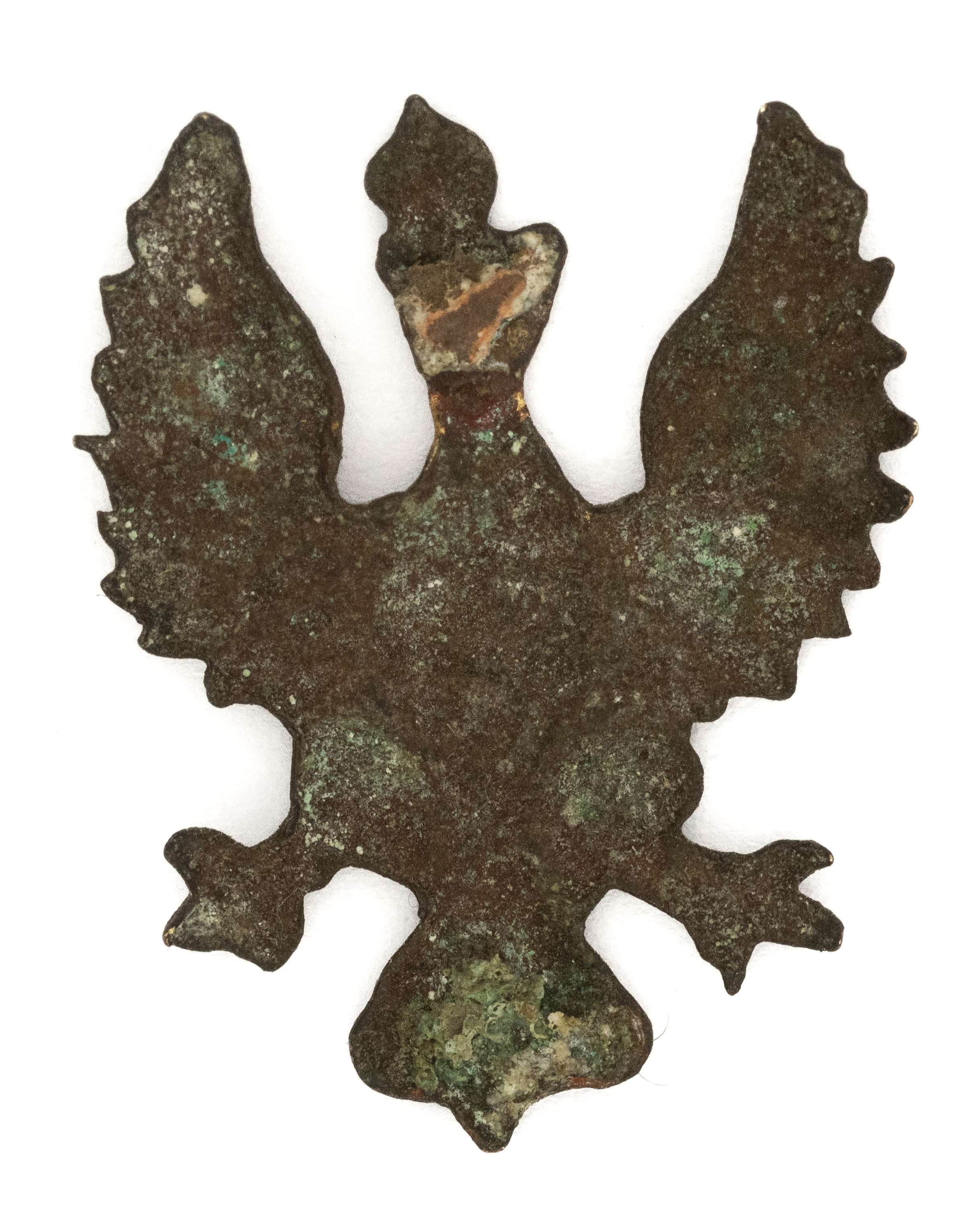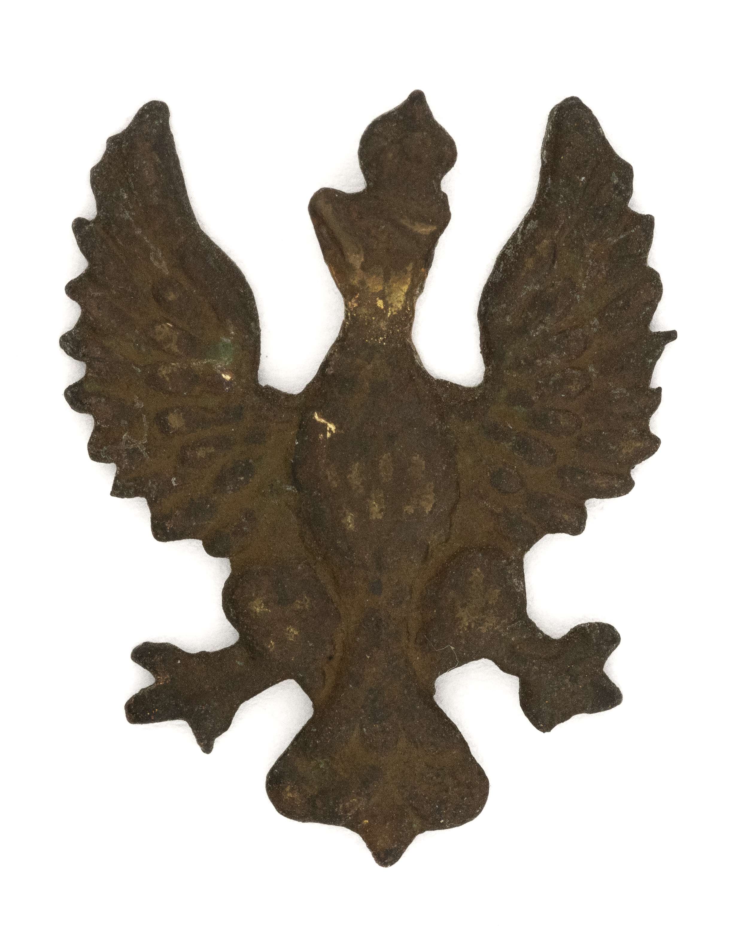 Orzeł wz. 19; 21x27mm. Wykonany z mosiądzu, resztki srebrzenia. Rewers z kontrą. Brak oryginalnego mocowania. Lit. Tomasz Zawistowski, Polskie orły do czapek w latach 1919-39, str.131-32. Stan bardzo dobry.