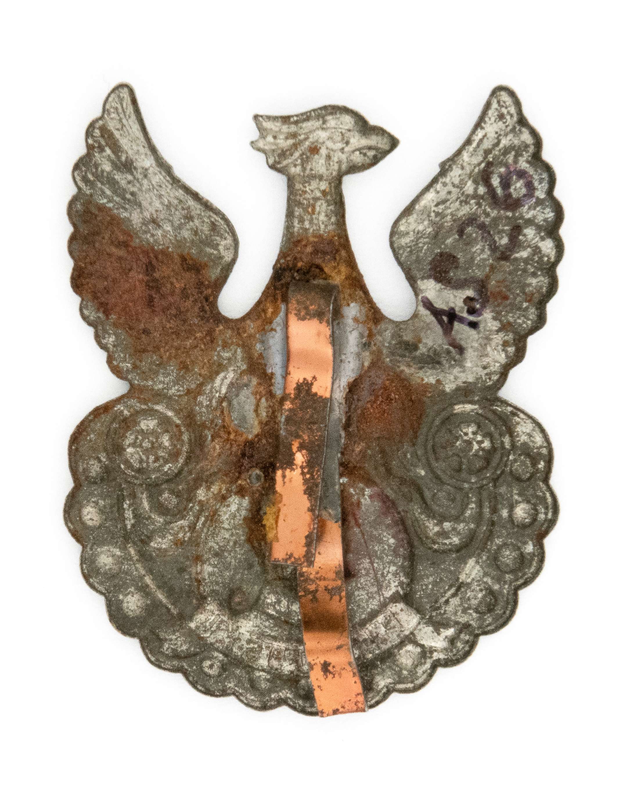 39 x 30mm. Wykonany z blachy stalowej, cynkowany. Rewers z kontrą. Brak oryginalnego mocowania - wtórnie przylutowana mosiężna blaszka. Orły te wykonywano w Warszawie w 1917r. Lit. Tomasz Zawistowski, Polskie Orły do czapek w latach 1900-1917, str. 170; Ireneusz Banaszkiewicz, Katalog orłów z kolekcji Tom I, str. 52. Stan dobry.