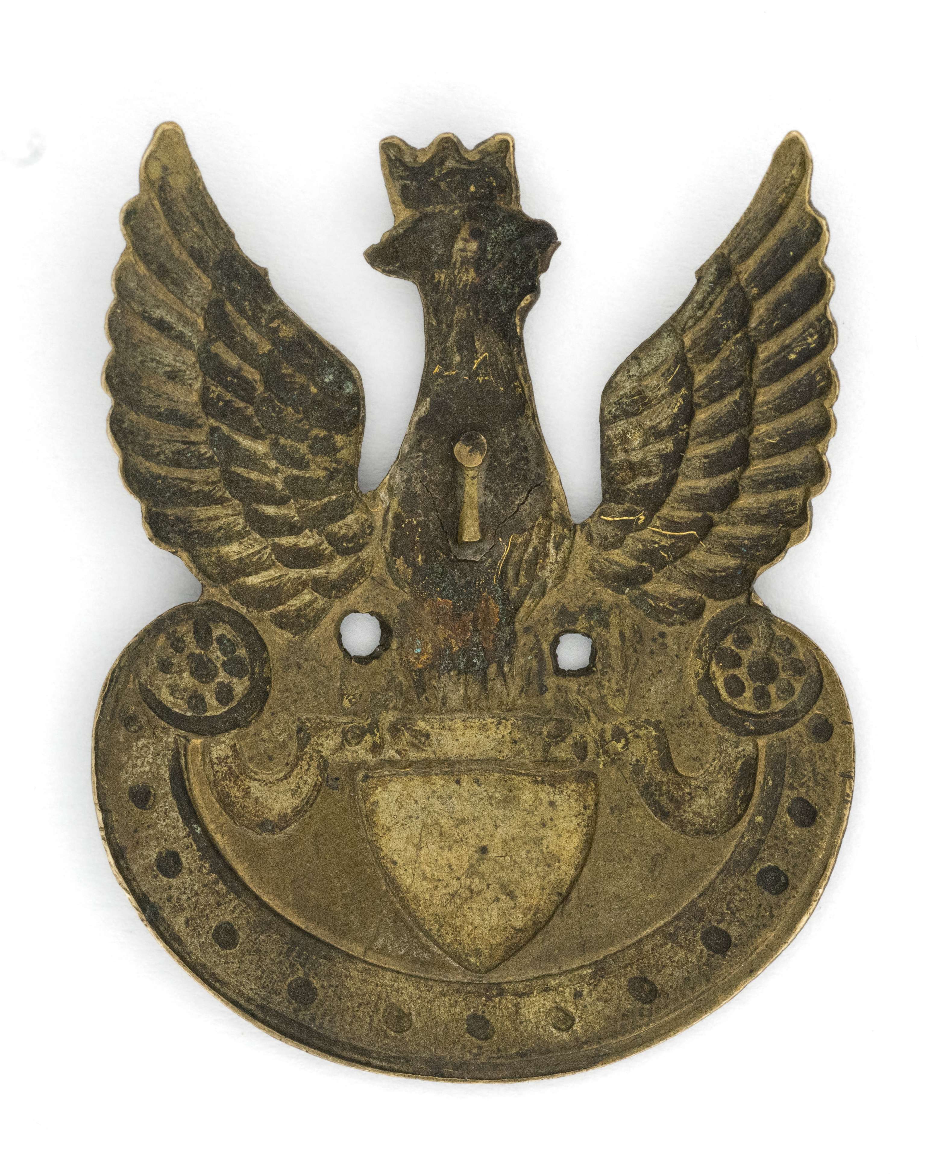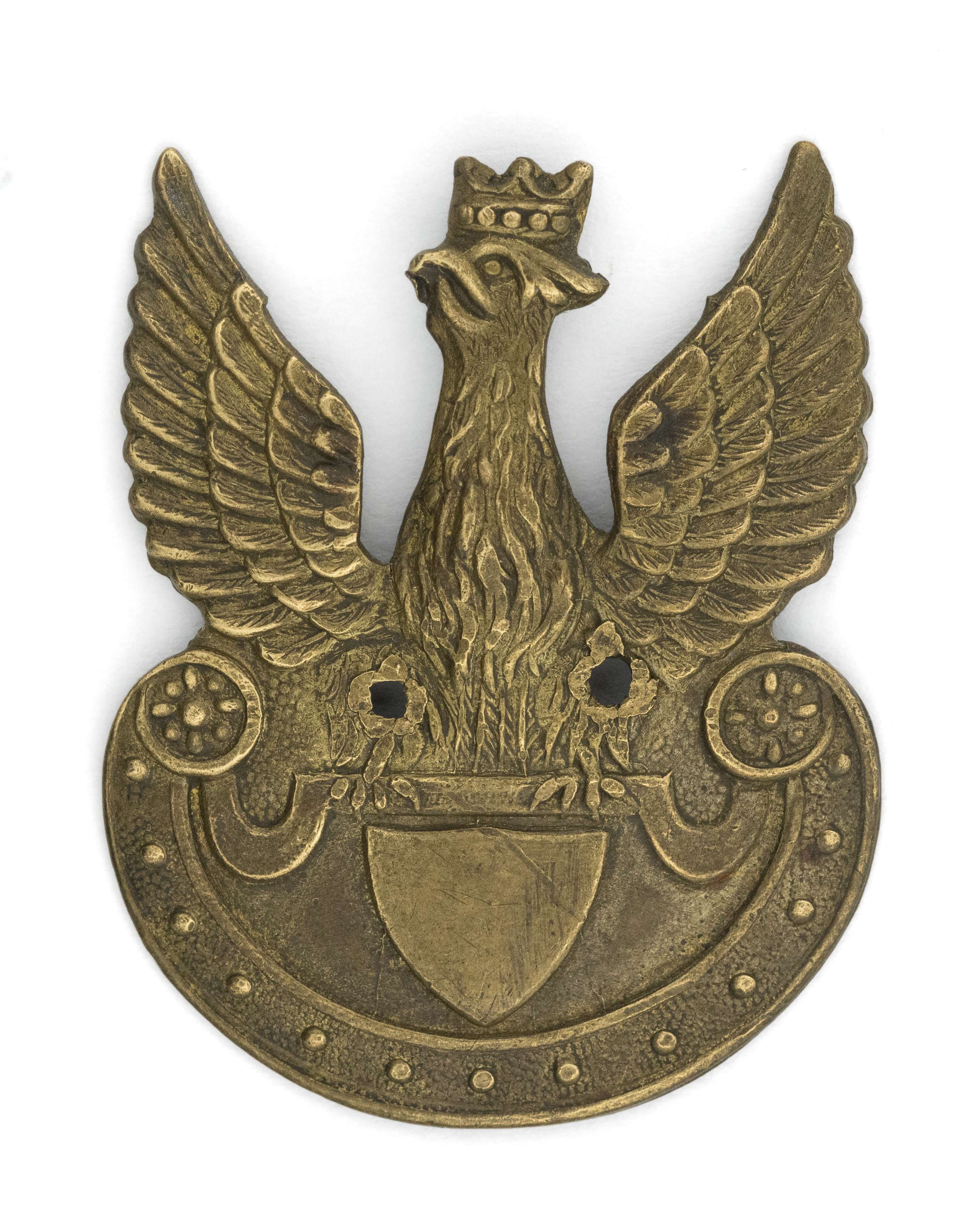 38,5 x 33mm. Wykonany z mosiądzu srebrzonego. Rewers z kontrą. Brak oryginalnego mocowania - dwie wtórnie wybite dziurki do przyszycia. Lit. Tomasz Zawistowski, Polskie Orły do czapek w latach 1900-17, str. 208, il. 292. Stan bardzo dobry.