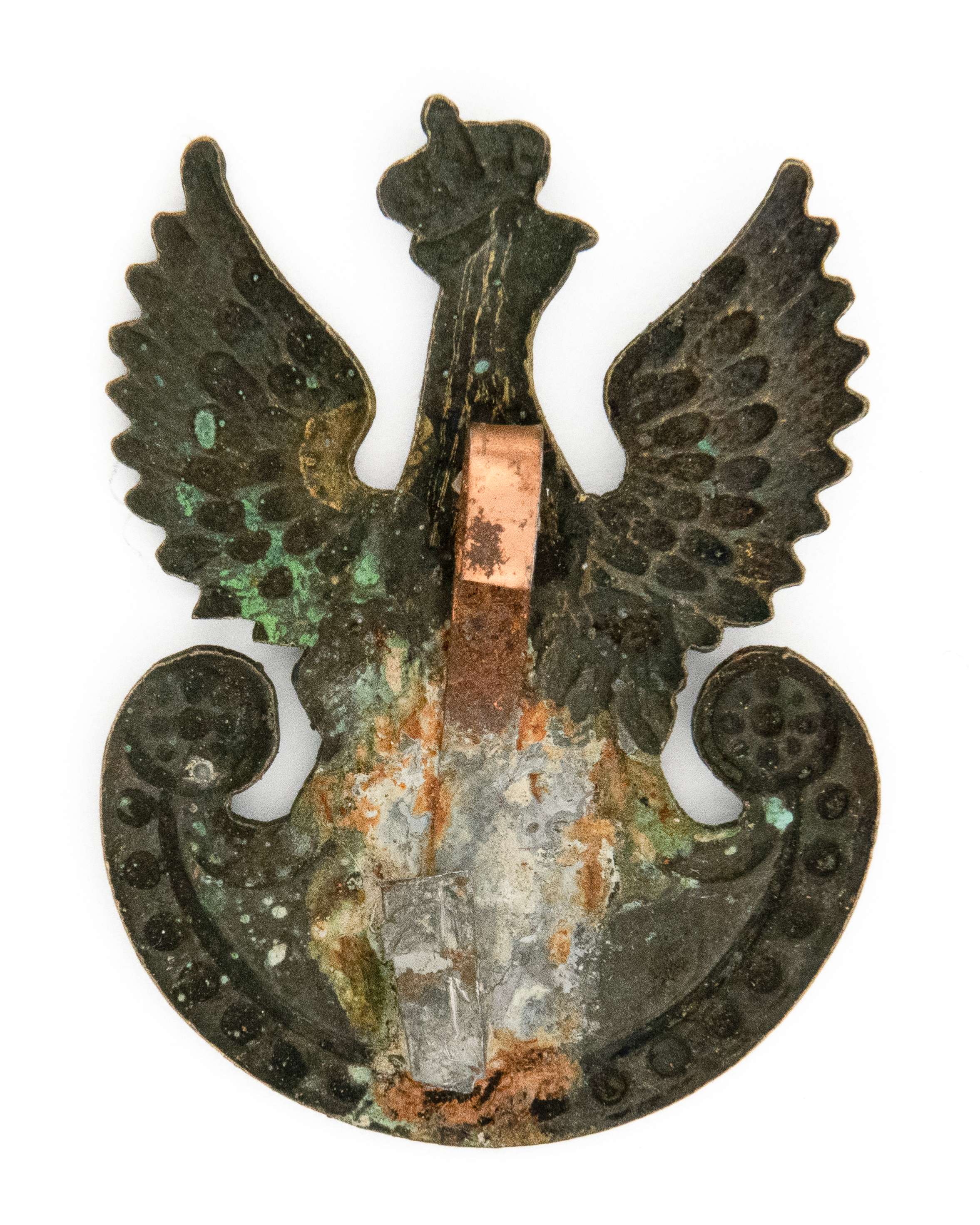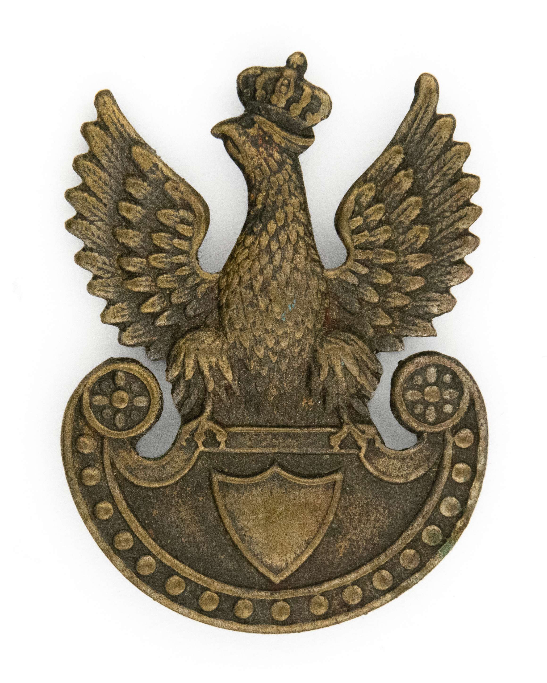 40 x 30mm. Wykonany w mosiądzu srebrzonym. Rewers z kontrą. Brak oryginalnego mocowania - wtórnie dolutowana blaszka. Lit. Tomasz Zawistowski, Polskie Orły do czapek w latach 1900-17, str. 150, il. 199; Ireneusz Banaszkiewicz, Katalog orłów z kolekcji Tom I, str. 47. Stan bardzo dobry.