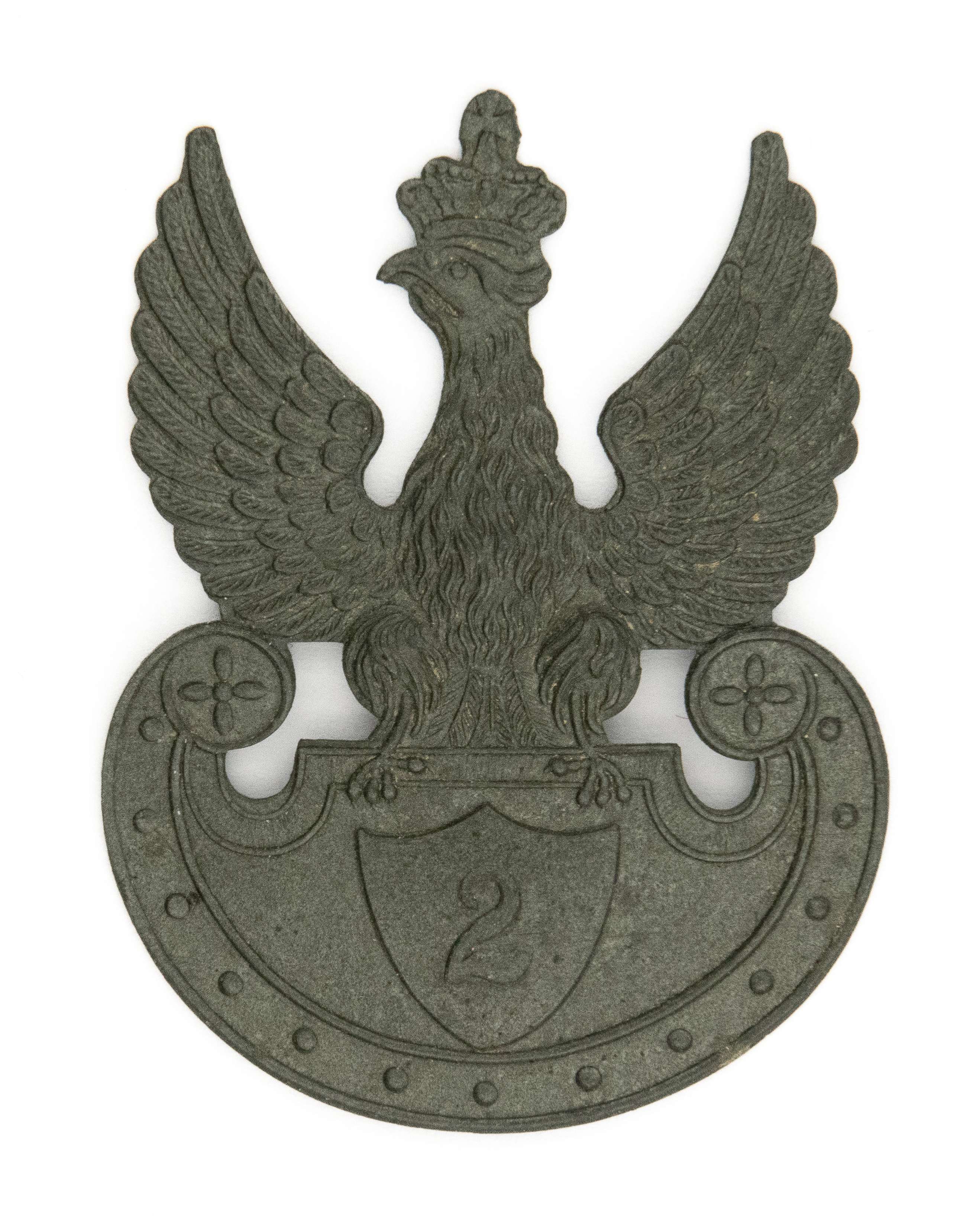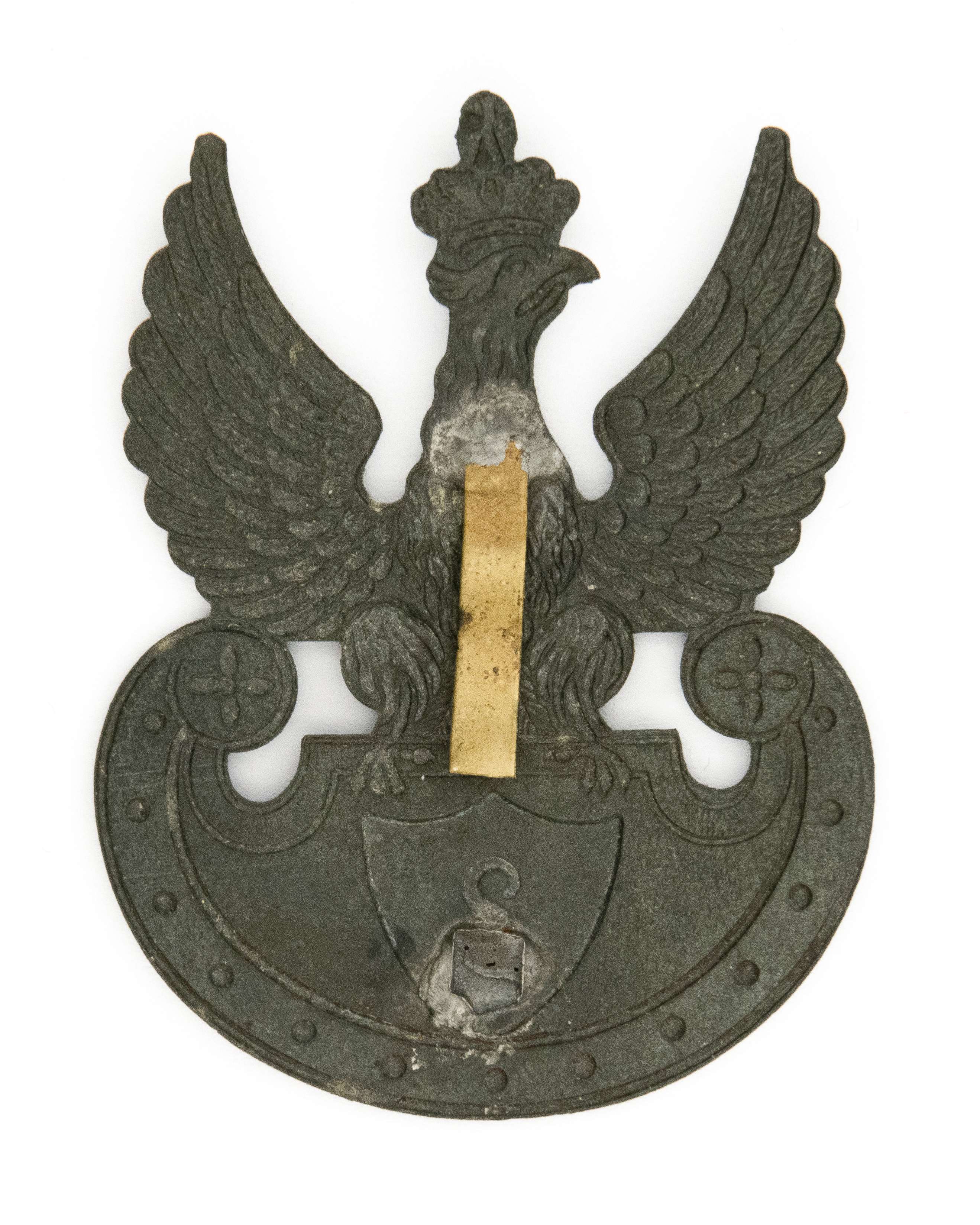52,5 x 39,5mm. Wykonany z cynku. Rewers z kontrą. Częściowo zachowane oryginalne mocowanie - jedna blaszka. Lit. Tomasz Zawistowski, Polskie orły do czapek w latach 1900-1917, str. 131; Ireneusz Banaszkiewicz, Katalog orłów z kolekcji Tom I, str. 35. Stan bardzo dobry.