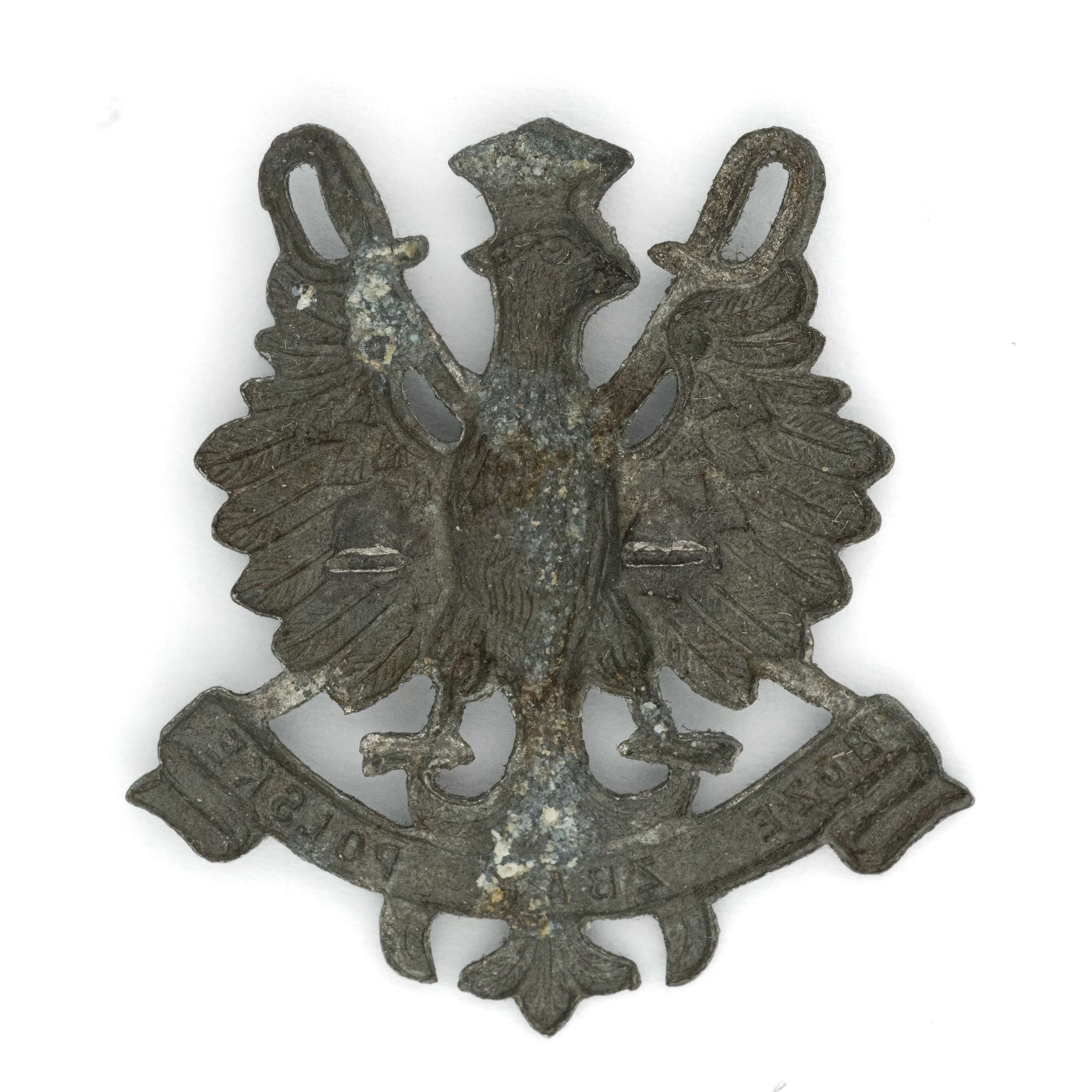 38,5 x 35mm. Wykonany z cynku. Rewers z kontrą. Brak oryginalnego mocowania - ślad po poziomej agrafce. Lit. Tomasz Zawistowski, Polskie Orły do czapek w latach 1900-17, str. 163, il. 231; Ireneusz Banaszkiewicz, Katalog orłów z kolekcji, str. 51. Stan bardzo dobry.