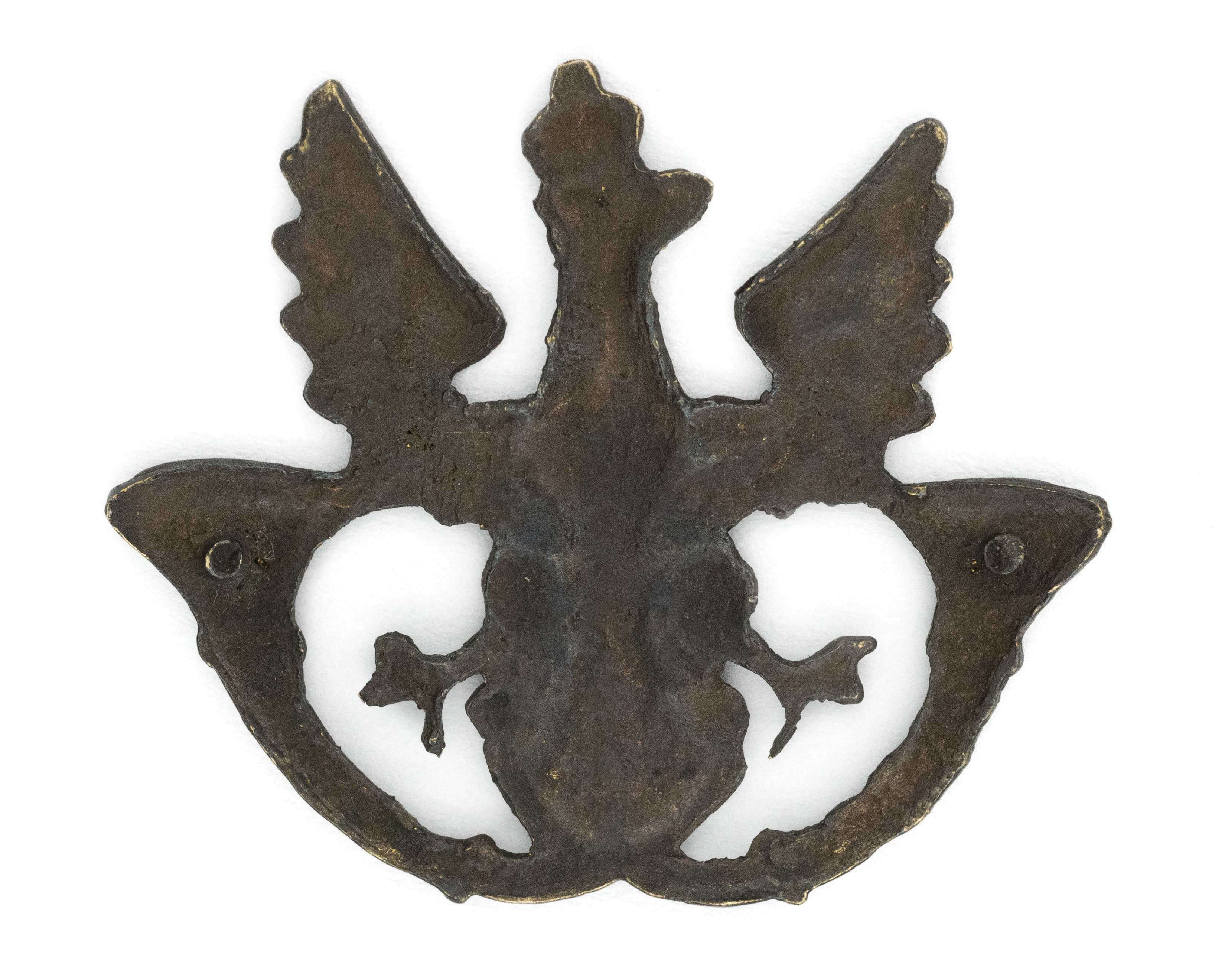 28 x 33mm. Wykonany z mosiądzu srebrzonego. Rewers z kontrą. Lit. Tomasz Zawistowski, Polskie orły do czapek w latach 1917-19, str. 126, il. 244; Ireneusz Banaszkiewicz, Katalog orłów z kolekcji, str. 107, il. 331. 5