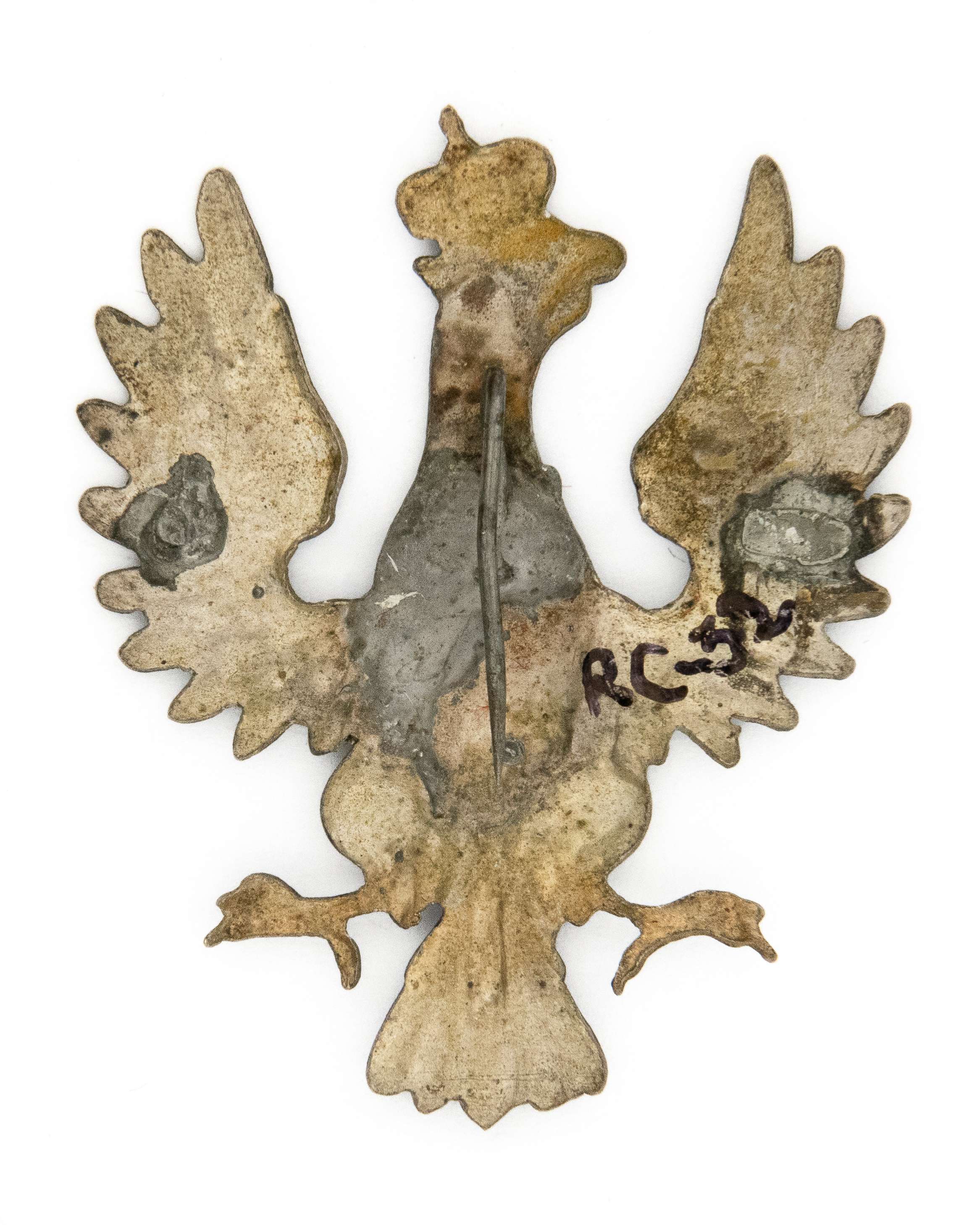 32 x 39mm. Wykonany w srebrze(?) Rewers gładki. Brak oryginalnego mocowania (ślady po agrafce) wtórnie przylutowana szpilka. Lit. Tomasz Zawistowski, Polskie orły do czapek w latach 1917-19, str. 27. Stan bardzo dobry.