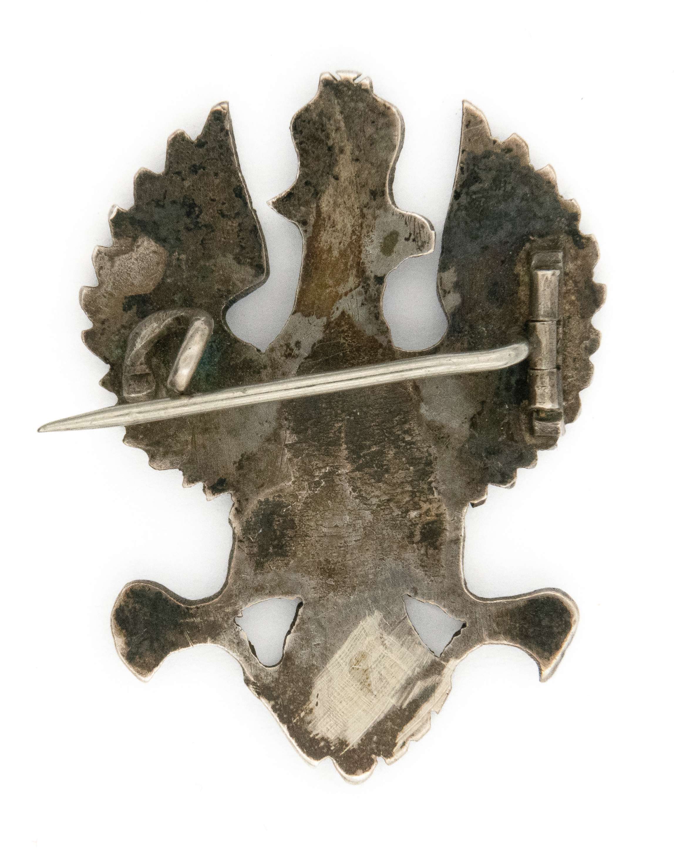 38,5 x 28,5mm. Wykonany w srebrze. Rewers gładki. Mocowany na poziomą agrafkę. Lit. Tomasz Zawistowski, Polskie orły do czapek w latach 1917-19, str. 27. Stan bardzo dobry.