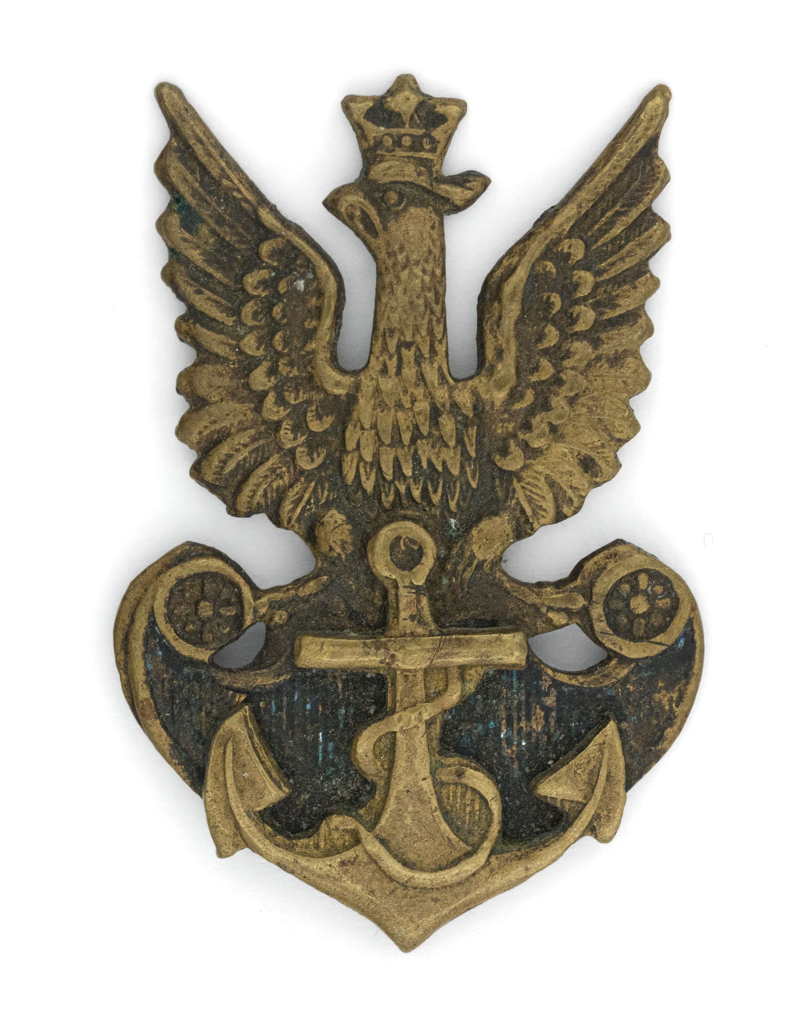 41 x 26,5mm. Wykonany z mosiądzu srebrzonym, emaliowany, wieloczęściowy - kotwica nakładana. Rewers z kontrą. Brak oryginalnego mocowania. Lit. Tomasz Zawistowski, Polskie orły do czapek w latach 1919-39, str. 22; Ireneusz Banaszkiewicz, Katalog orłów z kolekcji, tom 1, str. 122. Stan dobry.