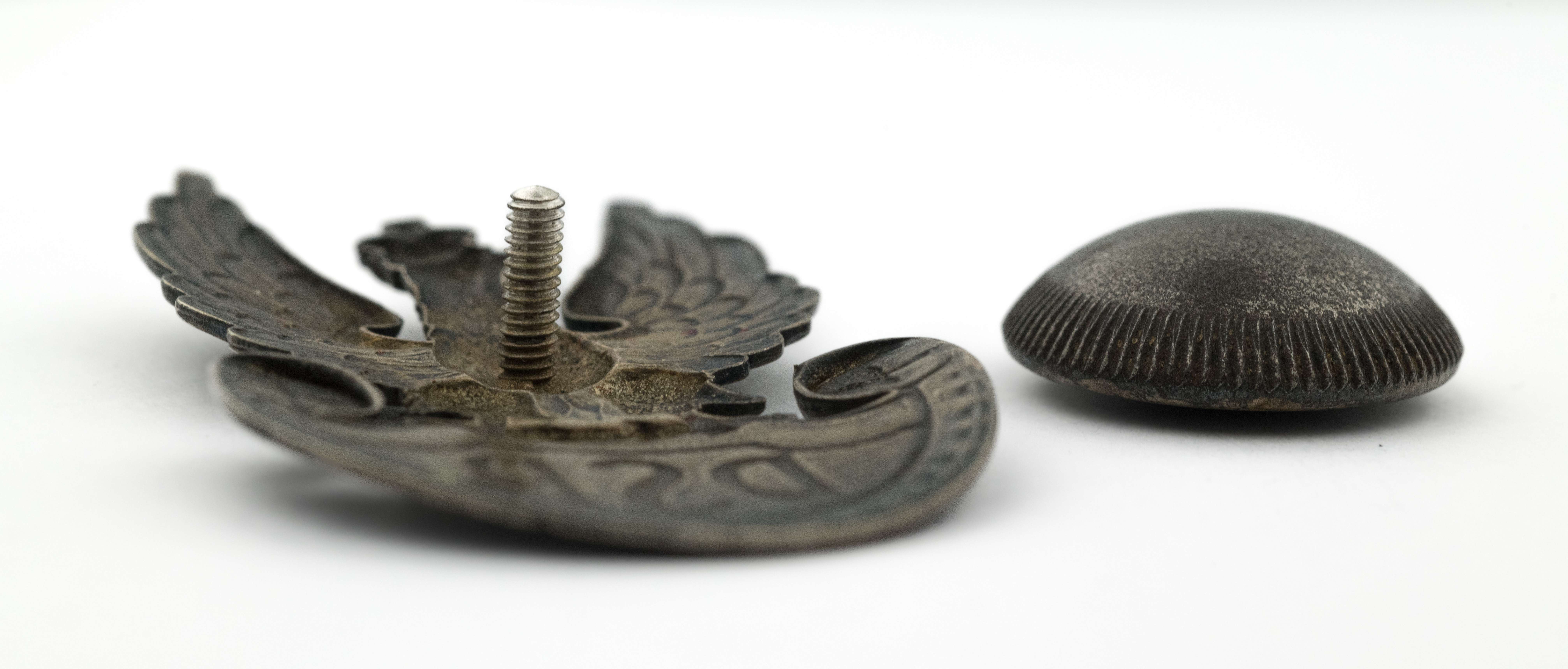 53,5 x 31,5 mm. Wykonany z cynku, srebrzony. Rewers z kontrą. Mocowany na słupek z charakterystycznym guzem. Wyrób szwajcarskiej firmy Huguenin Freres LeLocle. Lit. Tomasz Zawistowski, Polskie orły do czapek w latach 1939-1945, str. 146; Ireneusz Banaszkiewicz, Katalog orłów z kolekcji, tom 1, str. 186. Stan bardzo dobry.