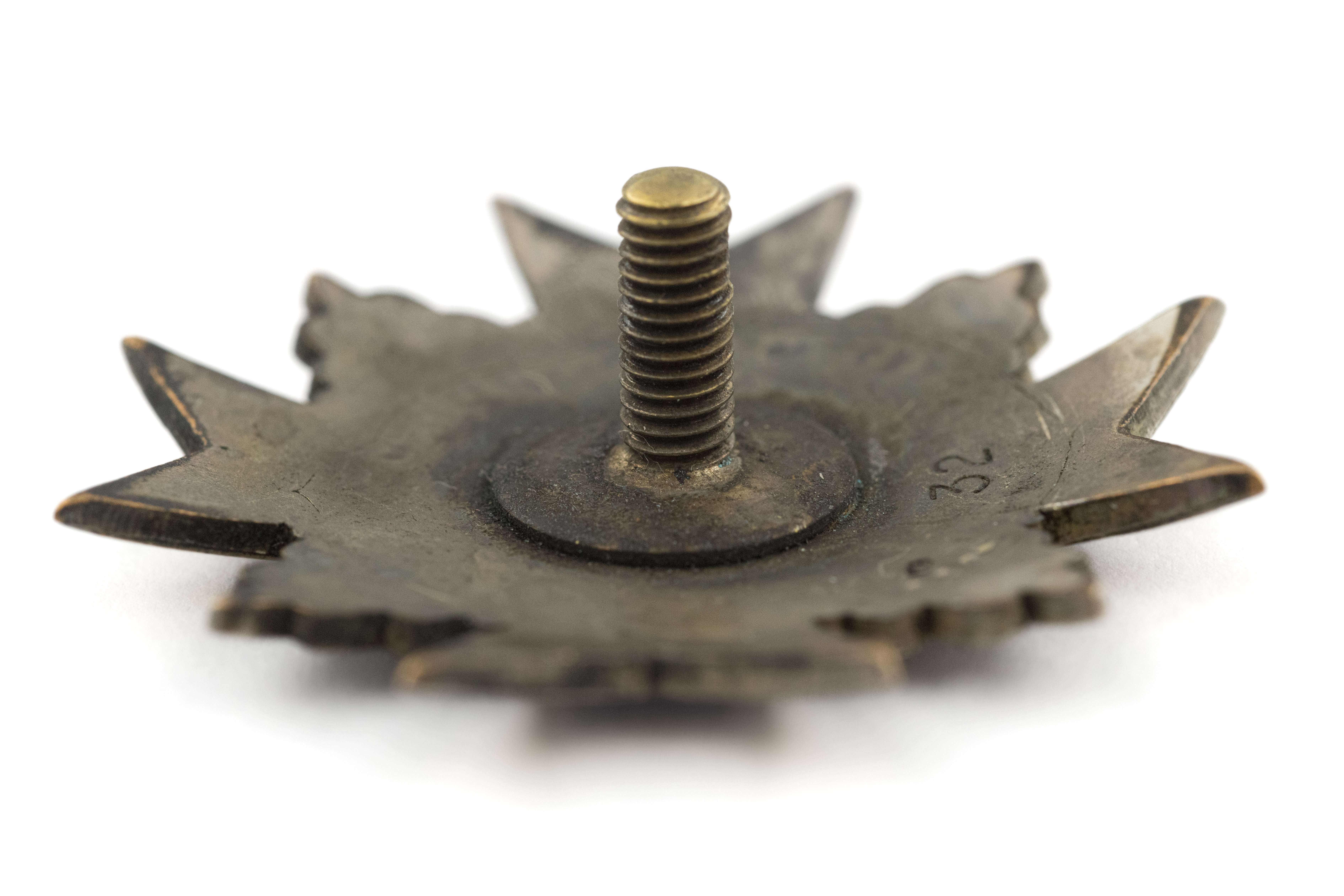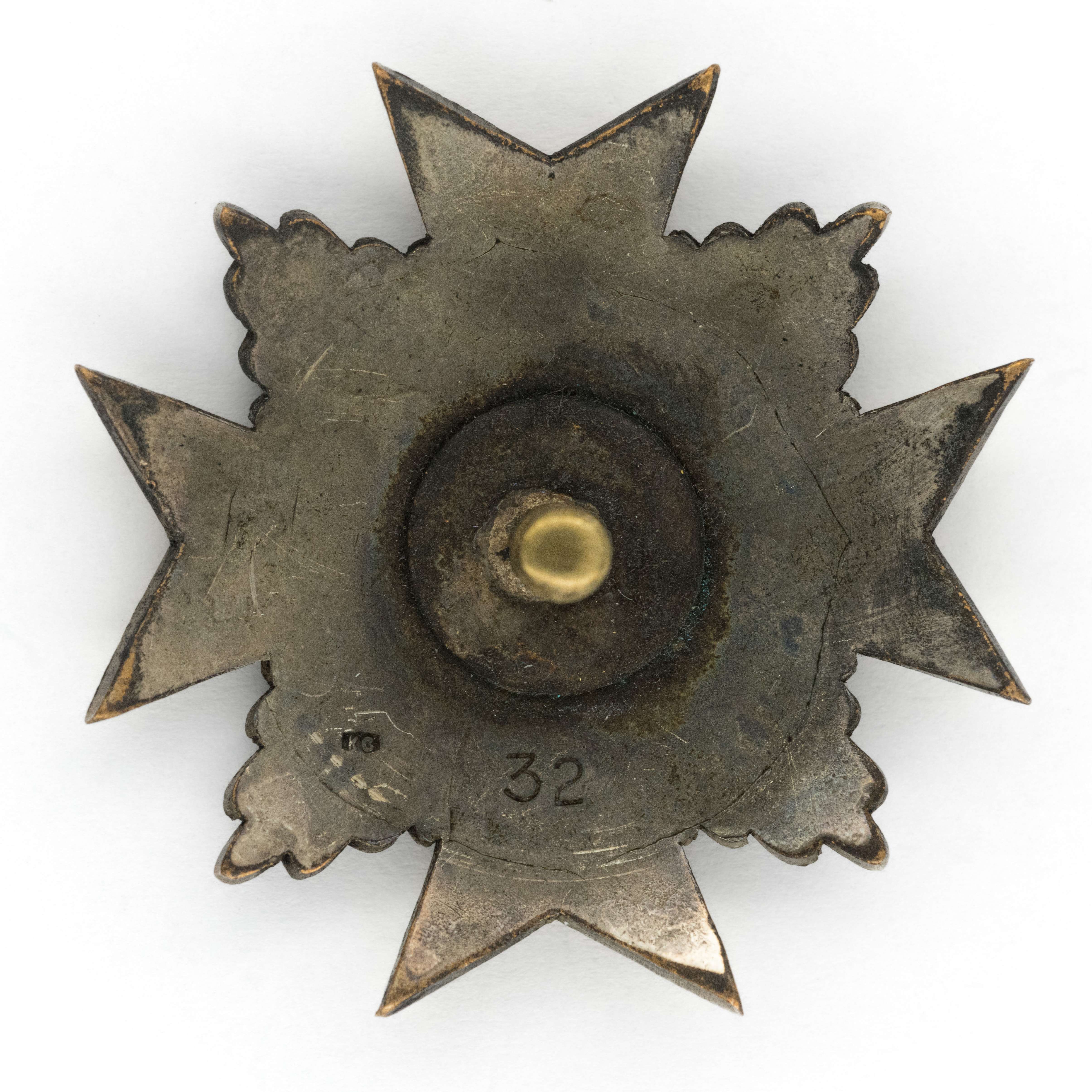 40 x 40mm. Wykonana ze srebra, emaliowana, jednoczęściowa. Rewers gładki z imiennikiem KG oraz numerem 32. Mocowana na słupek z charakterystyczną okrągłą podkładką, brak nakrętki. Stan bardzo dobry.