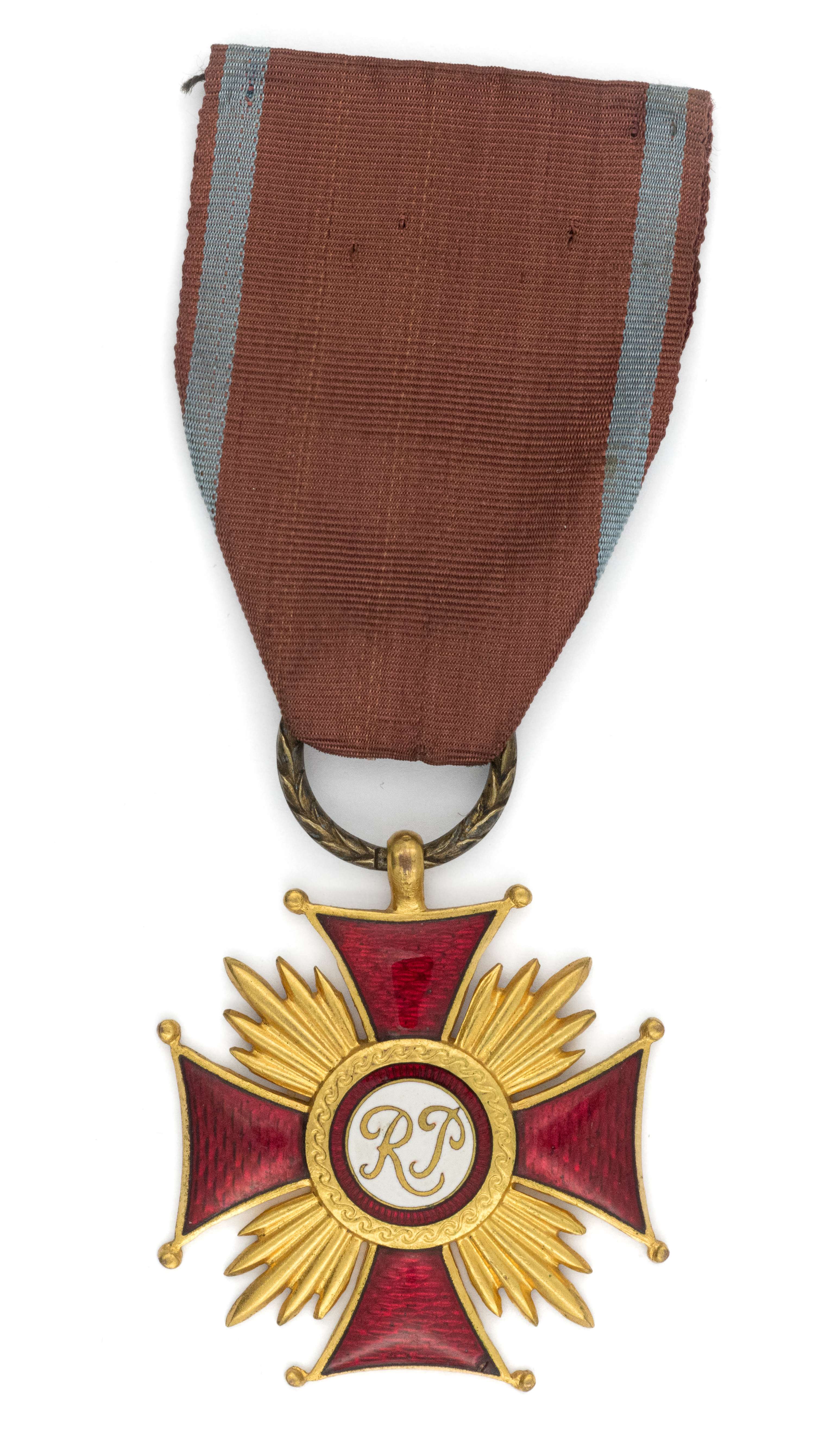 42 x 46mm. Wykonany z tombaku złoconego. Rewers gładki. Zawieszony na oryginalnej starej wstążce. Lit. Zbigniew Krotke, Polski Krzyż Zasługi 1923-2000 dzieje i katalog, str. 371. Stan bardzo dobry.