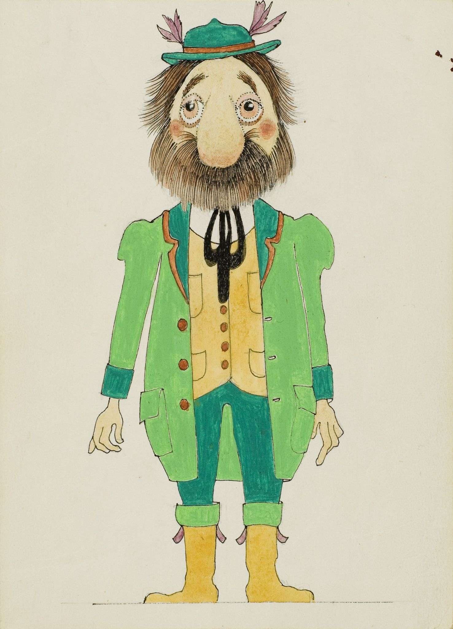 rysunek, tusz, tempera, karton, wym. 22,5x16,5 cm, na odwrotnej stronie opis: "Kopciuszek"/Gajowy. Proj. do spektaklu "Kopciuszek", 1979, reż. T. Walczak, wg. E. Szwarc.