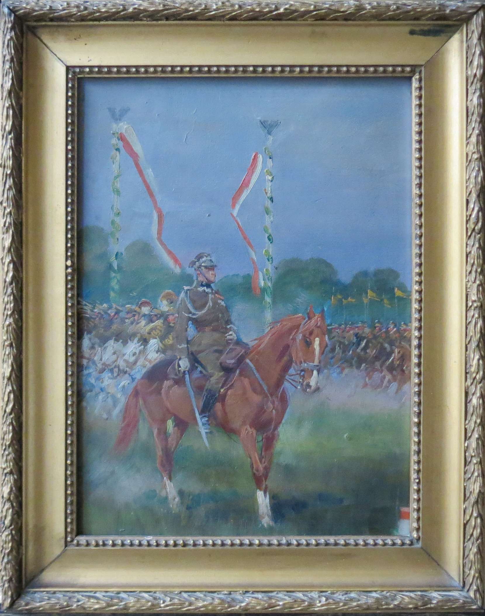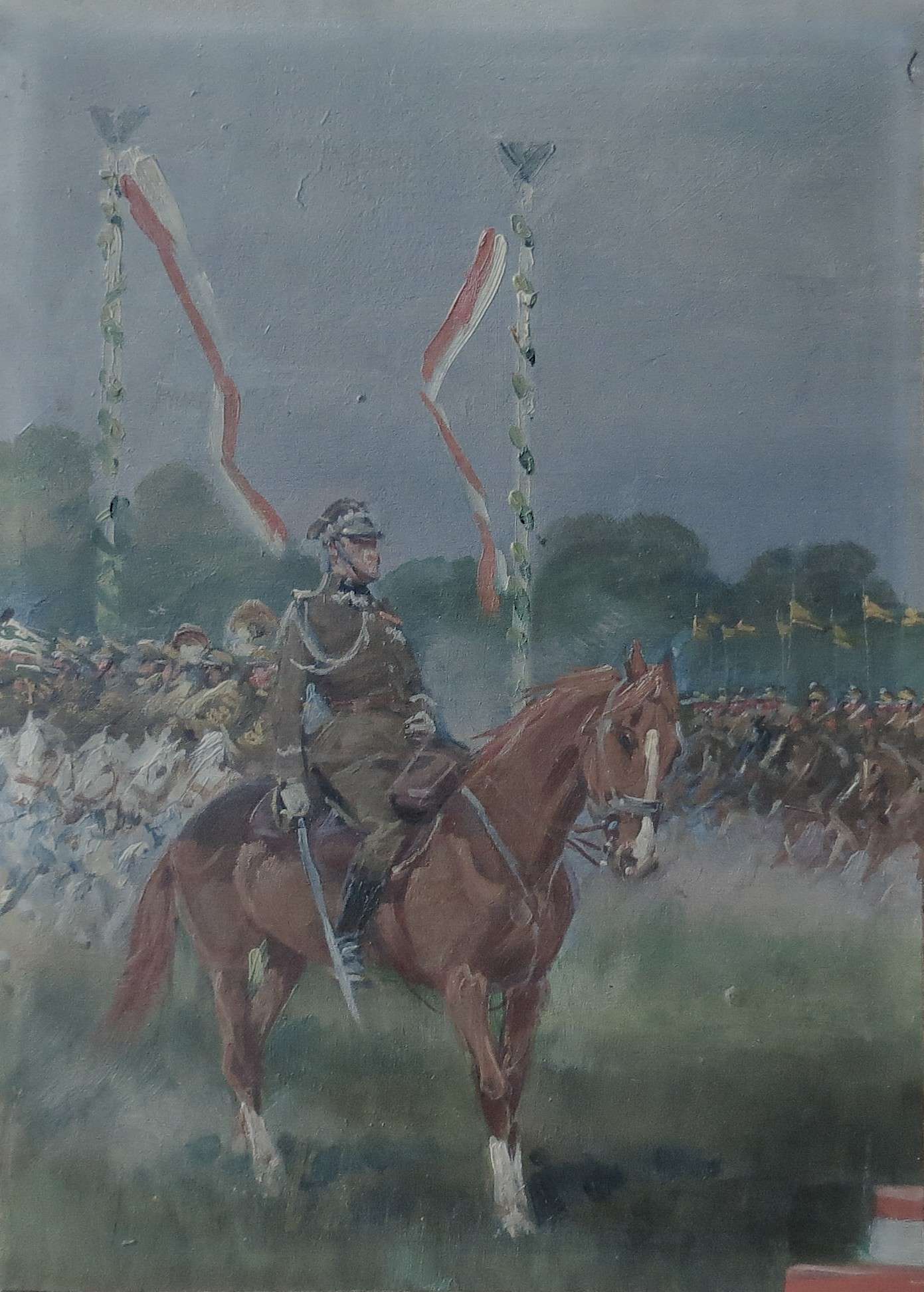 olej, sklejka, 25,5 x 18,5 cm, niesygnowany. Na odwrocie okrągła pieczęć "Jerzy Kossak Plac Kossaka 4" Nr (atramentem) 0386. Kompozycja nawiązuje do fragmentu olejnego obrazu Jerzego Kossaka z 1935 "Święto jazdy polskiej w Krakowie w dniu 6 października 1933" (Por.: K. Olszański, "Jerzy Kossak", Zakład Narodowy im. Ossolińskich, 1992, il. 162).