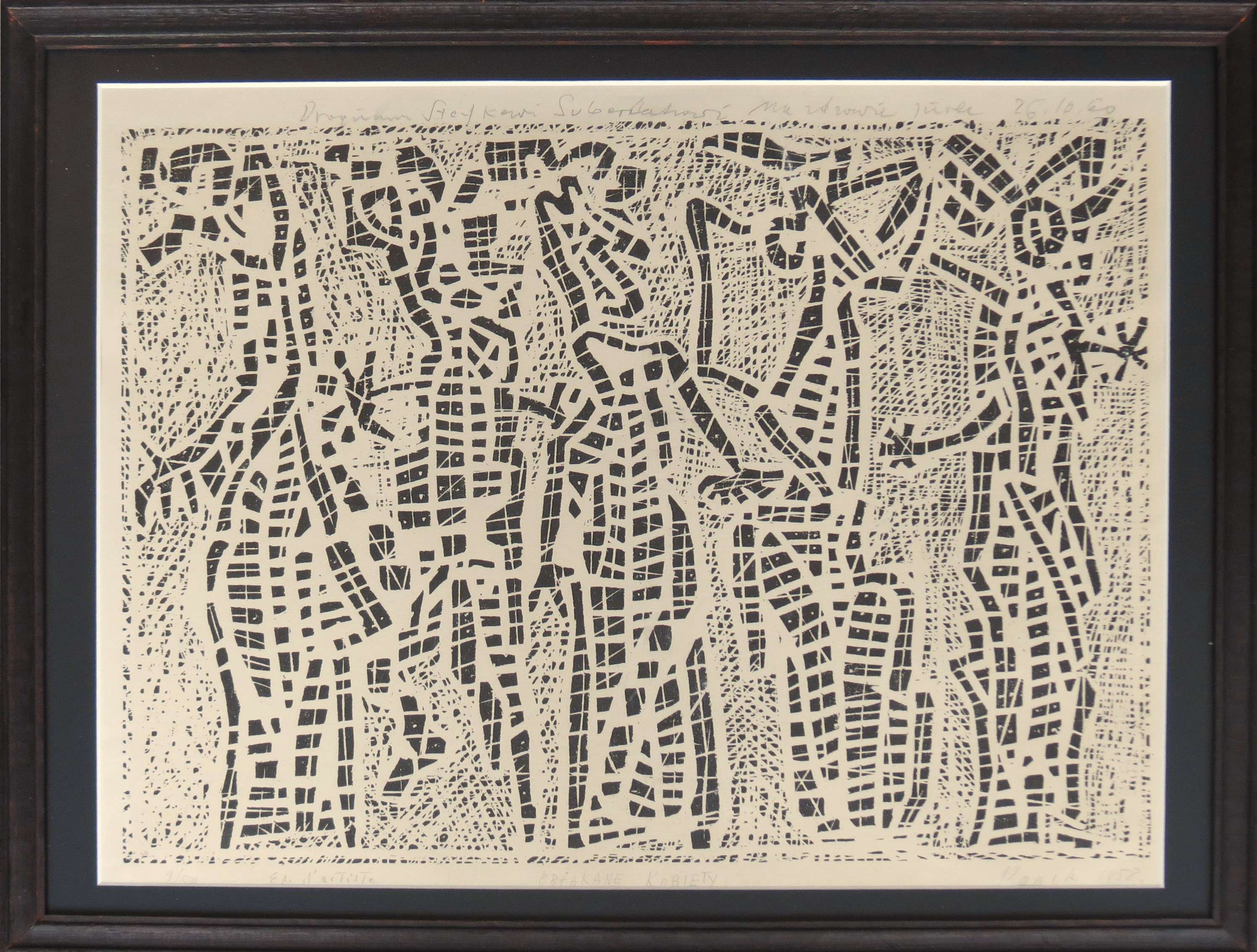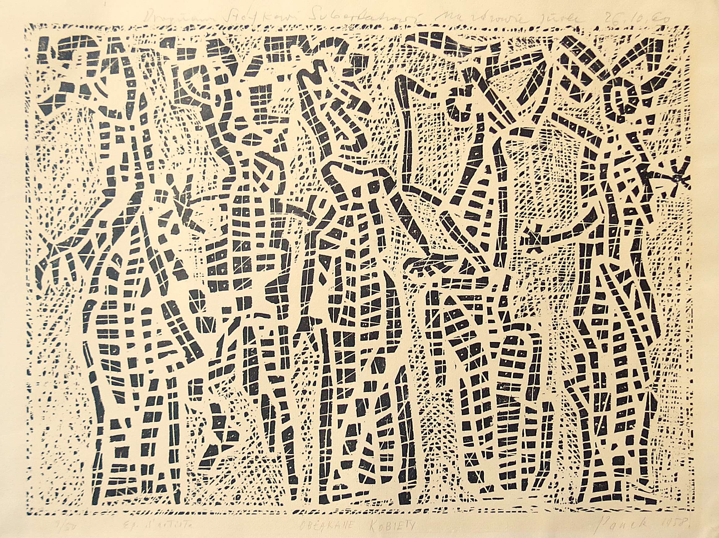 drzeworyt, 9/50, 34,5 x 47 cm sygn. oł. p.d.: Panek 1958; oł. l.d.: 9/50 Ep. d'artiste; oł. śr.d.: Obłąkane kobiety W górnej części dedykacja: "Drogiemu Stefkowi Suberlakowi na zdrowie Jurek 26.10.60" Pracę zakupiono od Stefana Suberlaka.