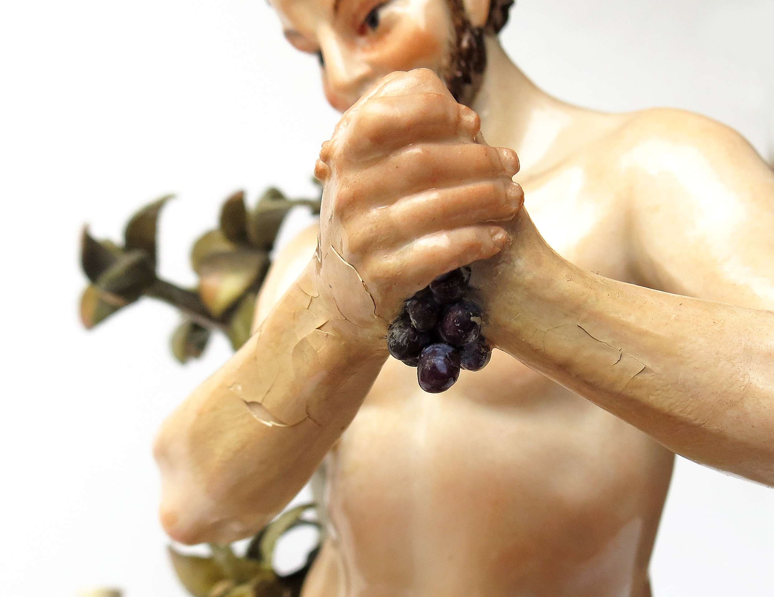 Stan zachowania: ubytki i wyszczerbienia w partii listowia, rekonstruowane elementy przedramion satyra.