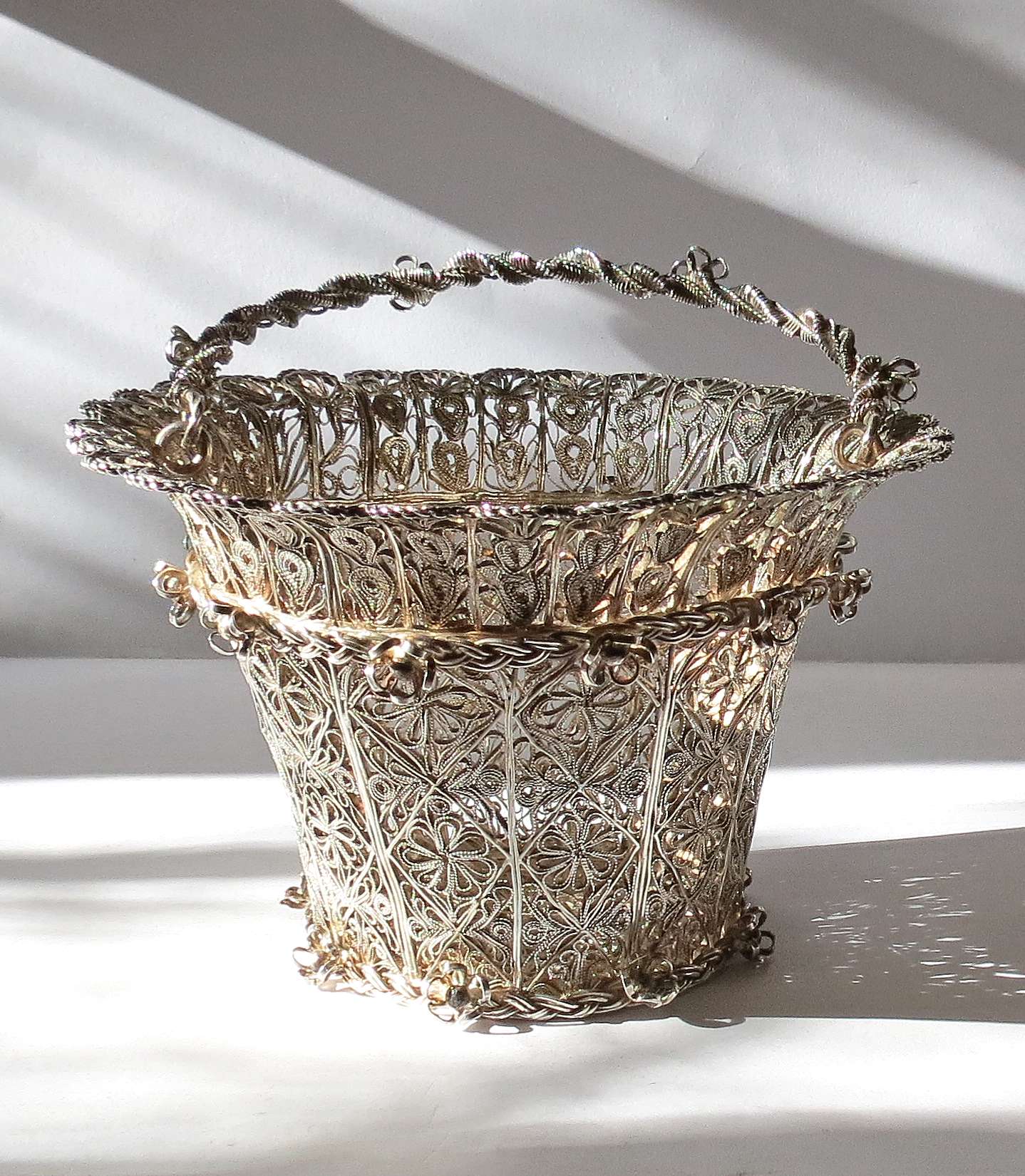 srebro pr. 0,925, filigran, wys. (z pałąkiem) 19 cm, waga 411,54 g; ażurowy, rozchylający się ku górze korpus o kolistej podstawie, lekko wywinięta, falista krawędź, pałąk ze skręconego filigranu; brak oznaczeń, świadectwo badania Urzędu Probierczego.