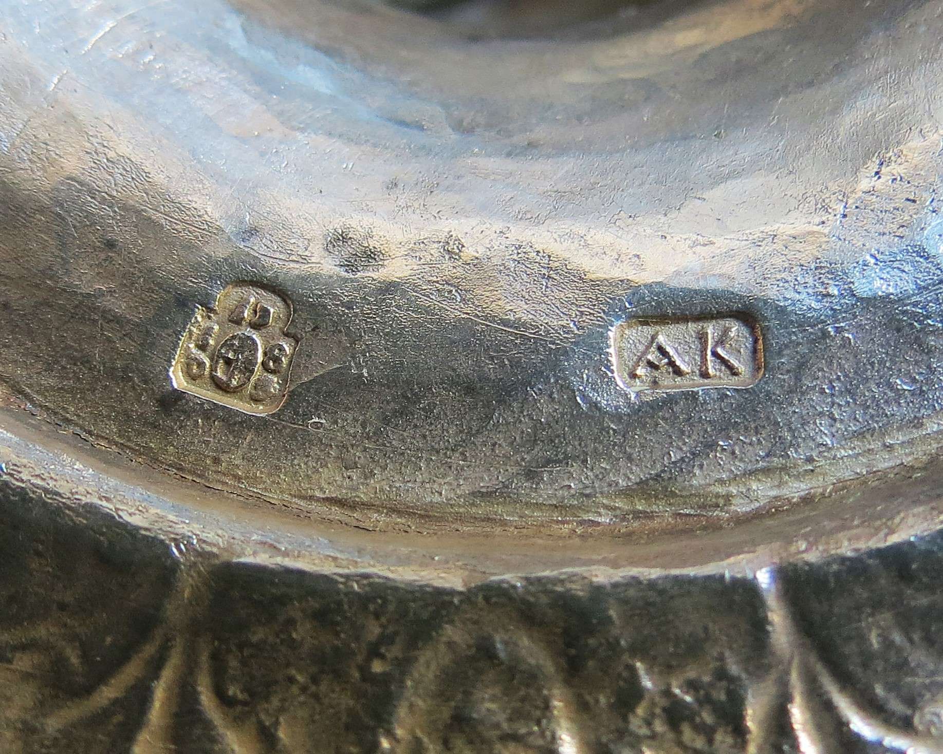 wys. 39,5 cm, waga 1489 g, srebro pr. 13 (0,812), austriacka cecha z ok. 1805 (słabo czytelna ostatnia cyfra), ze znakiem kontrybucyjnym (repuncą): 12 D (Lwów, 1806-1807), monogram złotnika: AK. Stan zachowania: ślady lutowania na krawędzi płaszcza stopy, dr. wgięcie przy zawiasie pokrywy.