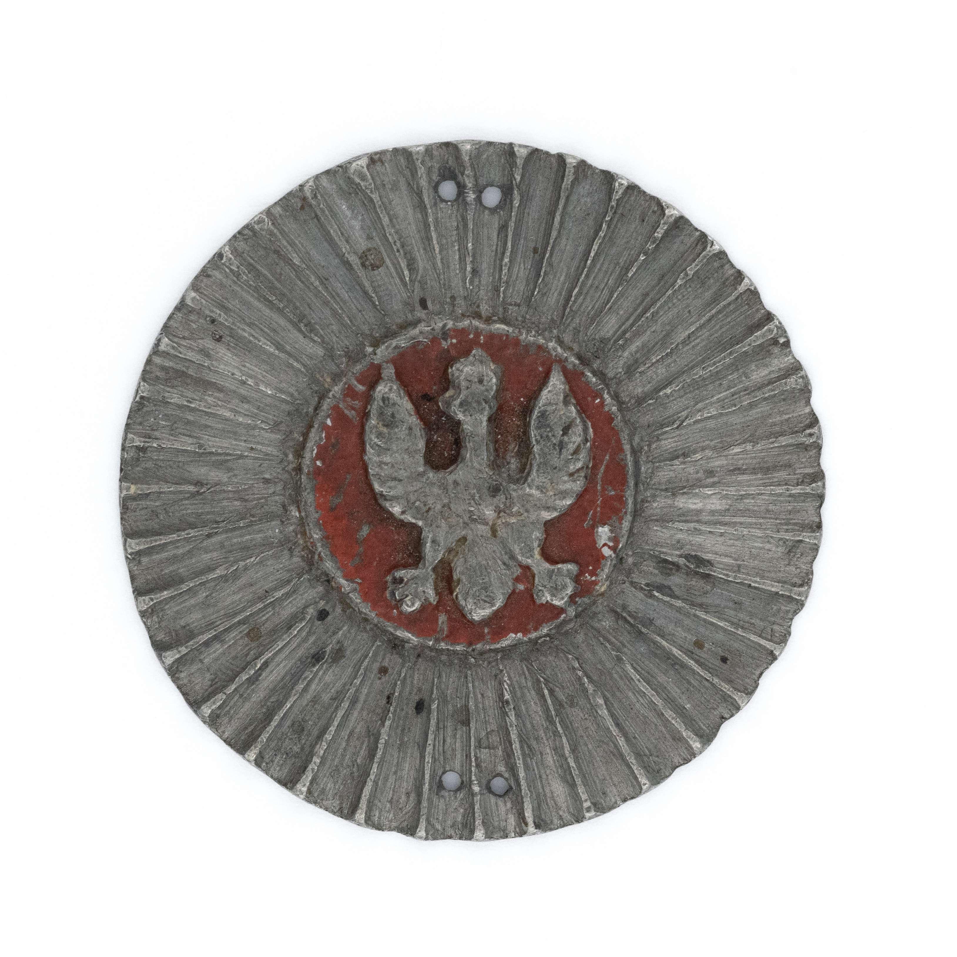 Kokarda z orłem według uchwały sejmu powstańczego z 7 lutego 1831r. (Powstanie Listopadowe). Średnica 44mm. Wykonana z ołowiu(?) lakierowana. Wieloczęściowa - orzeł nakładany i mocowany na zaklepany nit. Rewers gładki, mocowana na dwie pary dziurek do przyszycia. Więcej informacji oraz zdjęcia podobnych egzemplarzy dostępne tu https://kokardanarodowa.pl/o-mnie/ Stan bardzo dobry. Duża rzadkość!