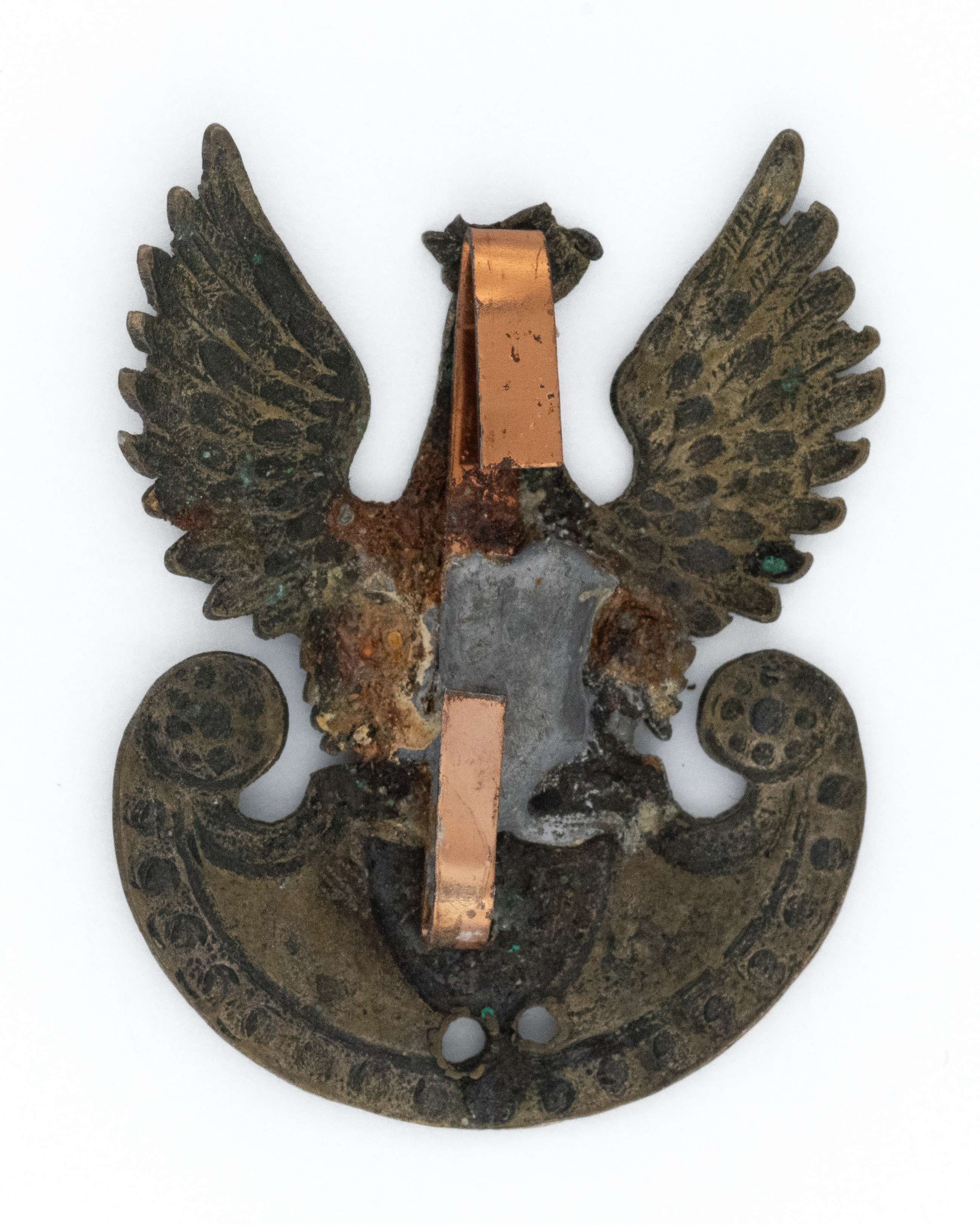 Orzeł z rytowaną cyfrą 2, Warszawa 1917. 38,5x 30,5mm. Wykonany z mosiądzu, srebrzony. Rewers z kontra. Brak oryginalnego mocowania- wtórnie przylutowana blaszka. Polskie Orły do czapek w latach 1900-17, str. 158; Ireneusz Banaszkiewicz, Katalog orłów z kolekcji Tom I, str. 49. Stan dobry- dwie wtórne dziurki do przyszycia.