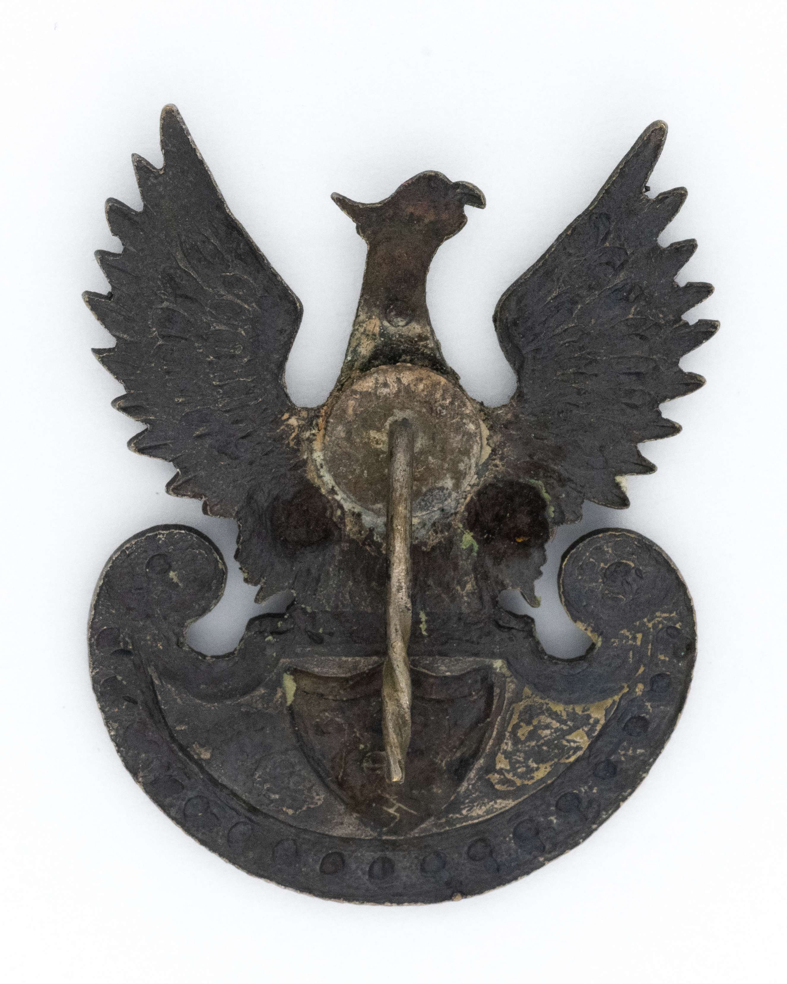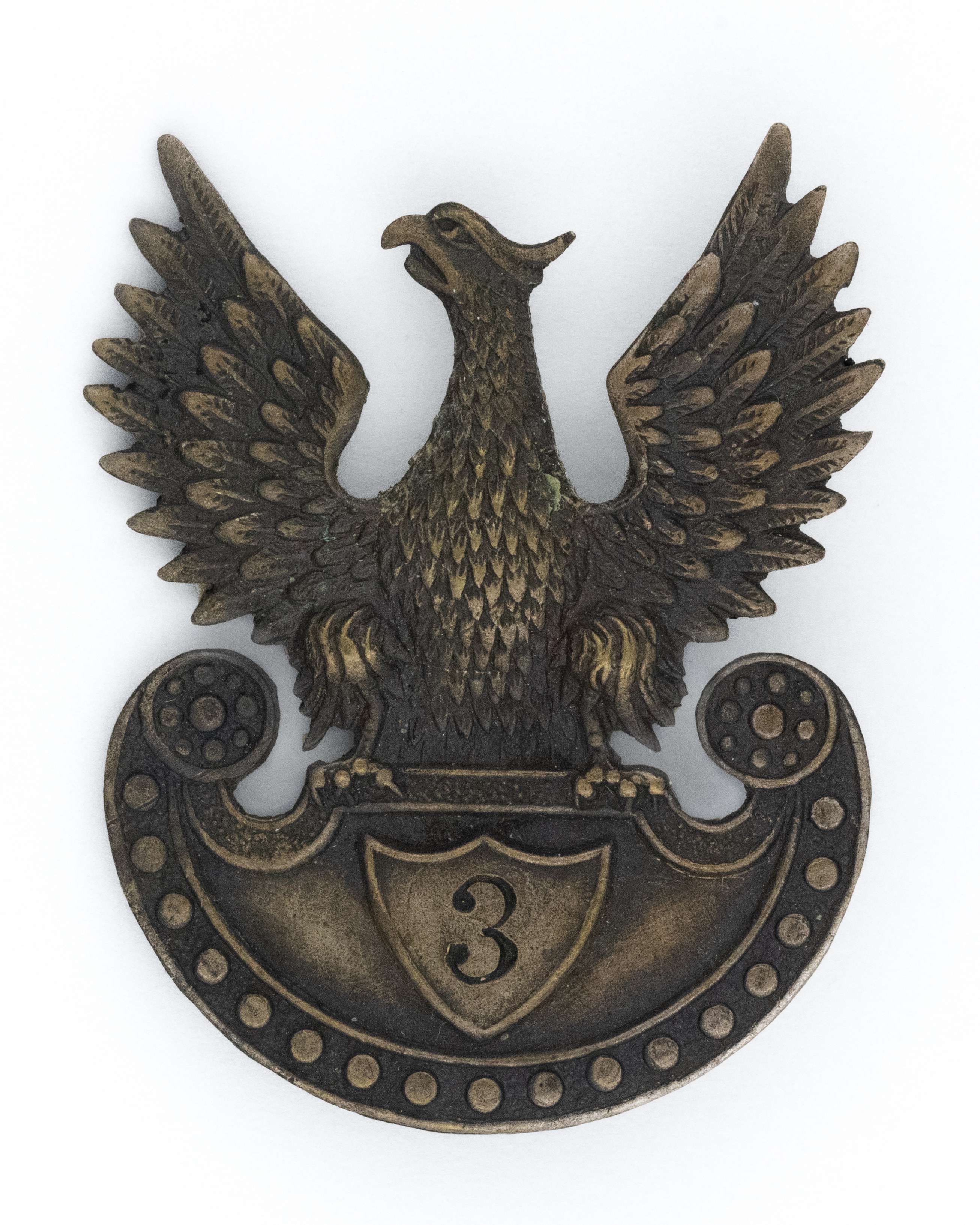 Orzeł z rytowaną cyfrą 3, Warszawa 1917. 38,5x 30,5mm. Wykonany z mosiądzu, srebrzony. 36. Rewers z kontra. Mocowany na pionową szpilkę- ułamana w połowie. Polskie Orły do czapek w latach 1900-17, str. 158; Ireneusz Banaszkiewicz, Katalog orłów z kolekcji Tom I, str. 49. Stan bardzo dobry.