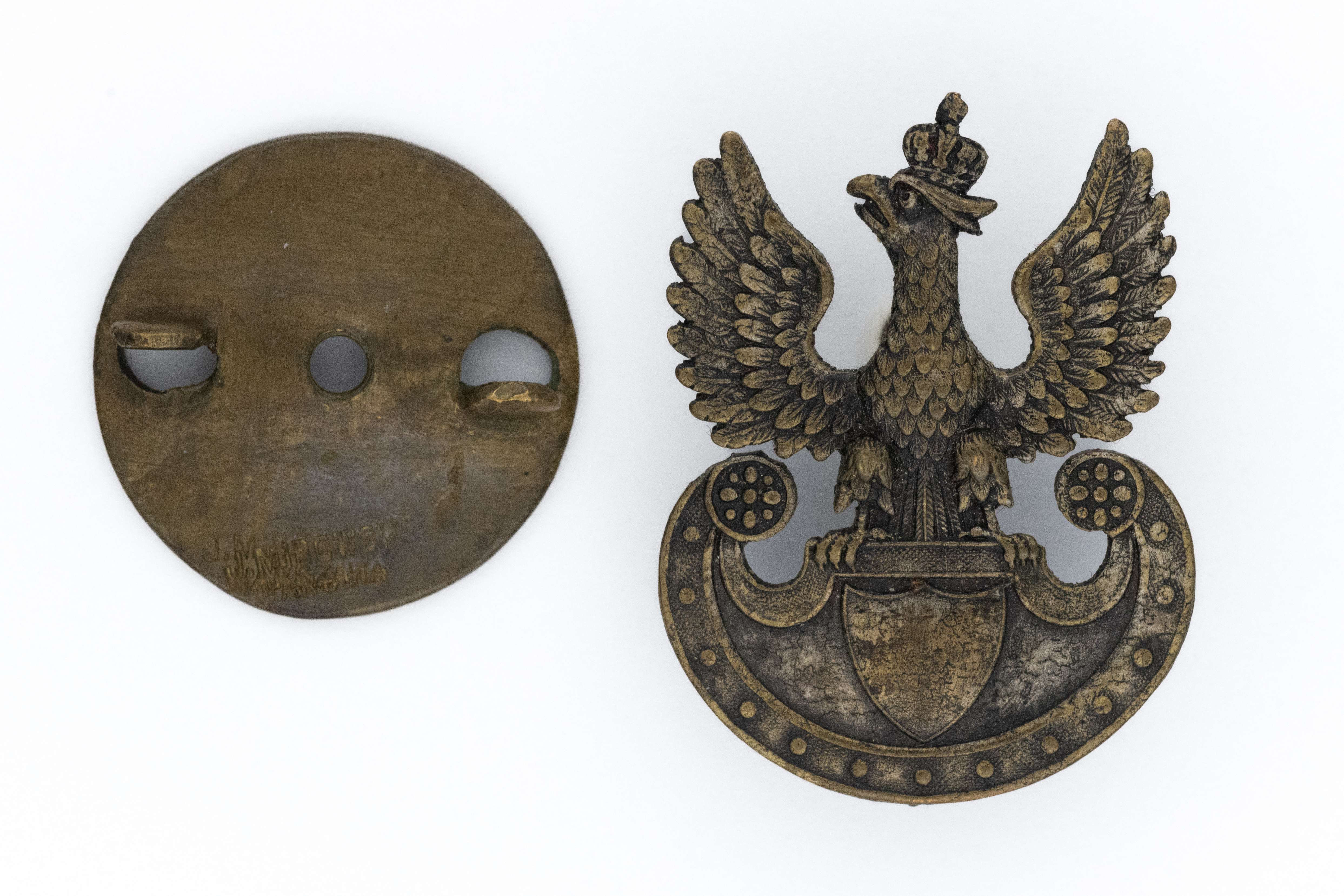 Orzeł wz. 17. J. Mirowski Warszawa (?). 38 x 28,5mm. Wykonany z mosiądzu, srebrzony. Rewers z płytką kontrą. Mocowany na słupek z nakrętką o średnicy 26mm, sygnowaną J. Mirowski Warszawa. Niezwykle ciekawa, nienotowana(?) odmiana orła! Bardzo zbliżony rysunkiem do wyrobów J. Chylińskiego (13 gwoździ na tarczy) jednak minimalnie różniący się wymiarami i rysunkiem. Por. Lit. Tomasz Zawistowski, Polskie Orły do czapek w latach 1900-17, str. 151. Stan zbliżony do idealnego.