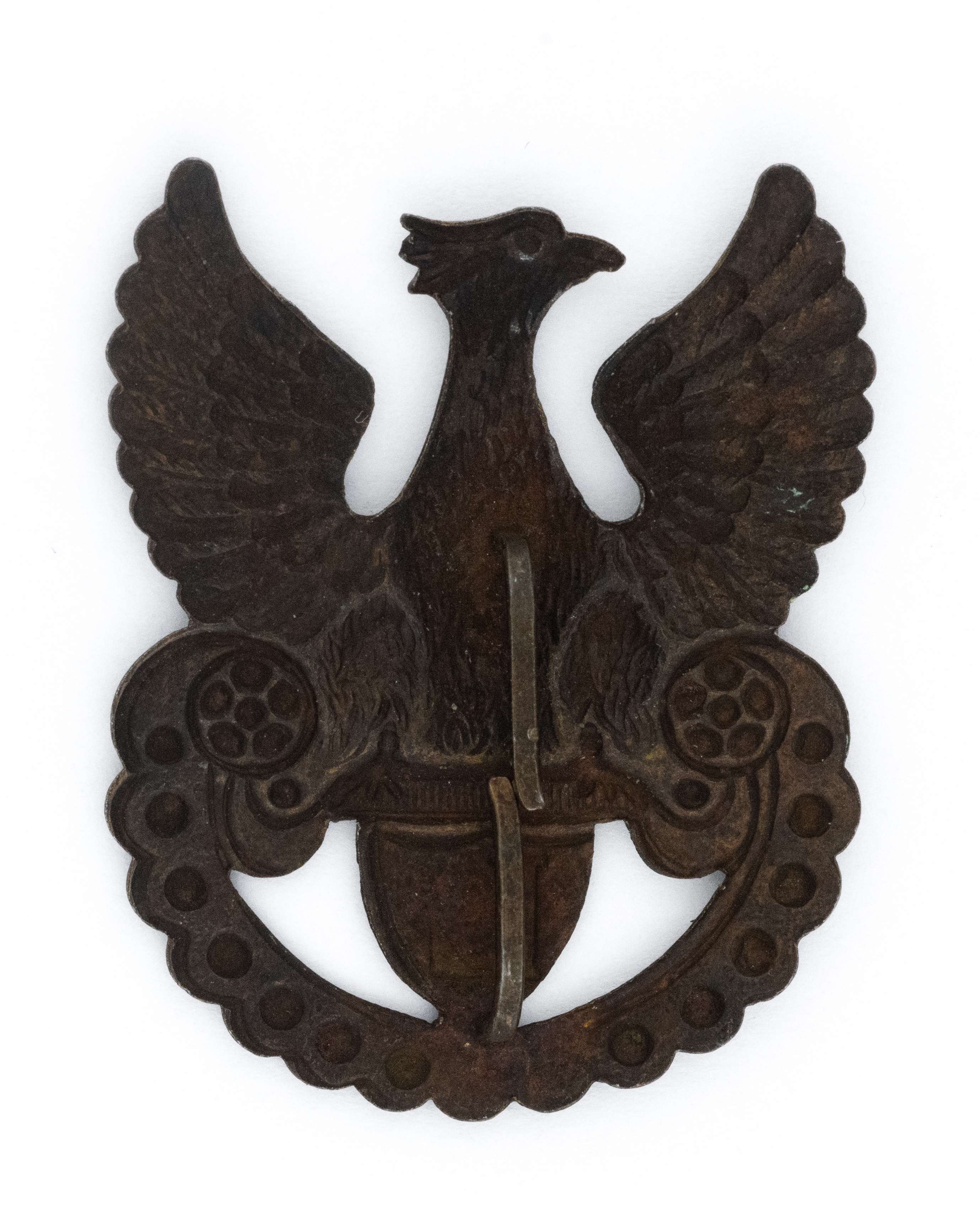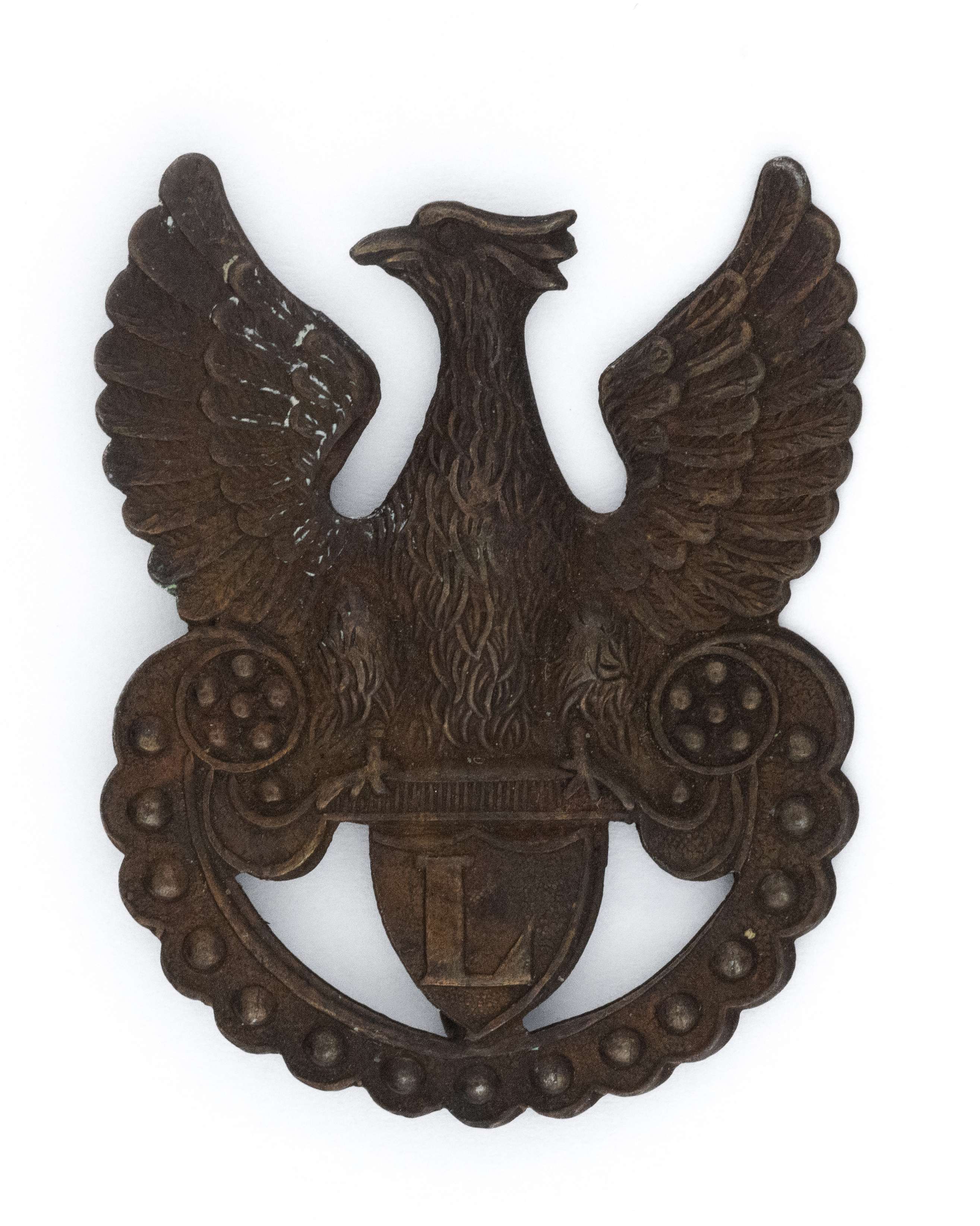Orzeł z falistą dolną krawędzią tarczy amazonek - litera "L". 39 x 30mm. Wykonany z blachy stalowej, cynkowany. Rewers z kontrą. Mocowany na dwie płaskie wąskie blaszki. Na małej tarczce litera "L". Lit. Tomasz Zawistowski, Polskie Orły do czapek w latach 1900-1917, str. 165-167; Ireneusz Banaszkiewicz, Katalog orłów z kolekcji Tom I, str. 51-52. Stan bardzo dobry.