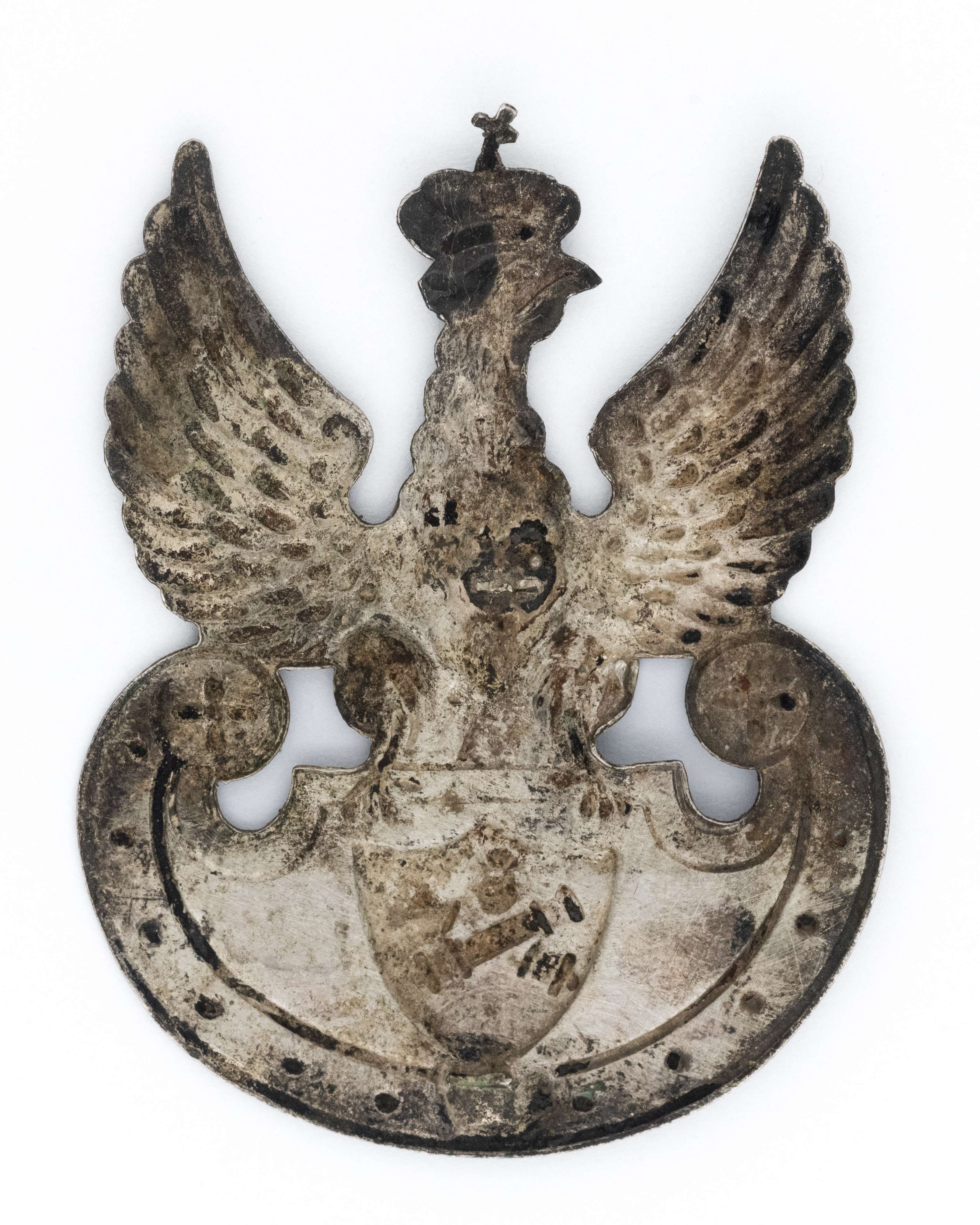 Orzeł projektu Czesława Jarnuszkiewicza, emblemat artylerii na tarczce. 52,5x39,5mm. Wykonany z mosiądzu. Rewers z kontrą. Brak oryginalnego mocowania. Lit. Tomasz Zawistowski, Polskie orły do czapek w latach 1900-1917, str. 130. Stan bardzo dobry.
