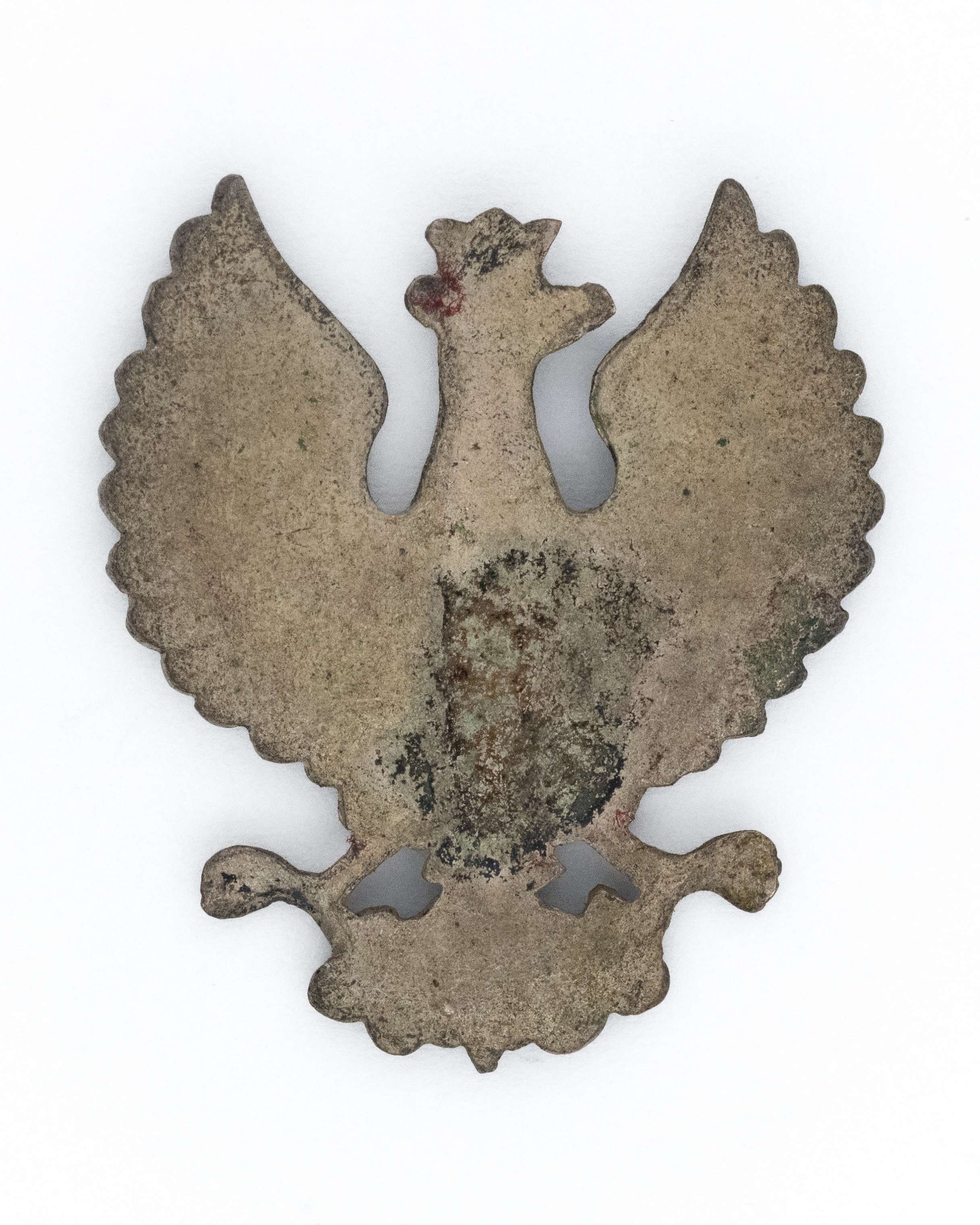 Orzeł "krechowiecki". 32 x 28mm. Wykonany w srebrze(?). Rewers gładki. Brak mocowania. Lit. Tomasz Zawistowski, Polskie orły do czapek w latach 1917-19. Str. 35-37. Stan bardzo dobry.