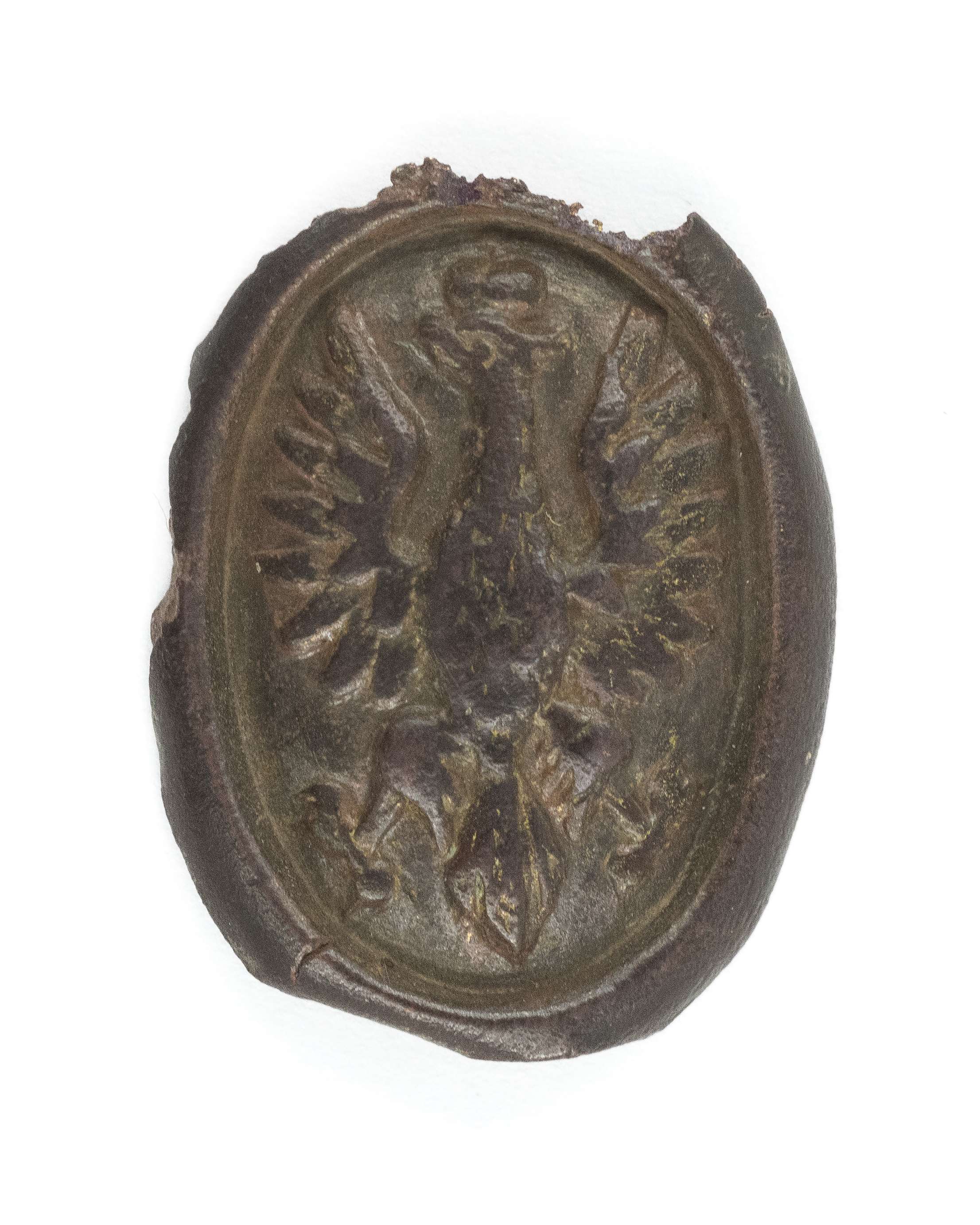 Orzeł/kokarda Legion Puławski. 17,6 x 23,5mm. Wykonany z mosiądzu, rewers z kontrą. Tego typu orły nakładano na rosyjskie "bączki" i noszono min. w Legionie Puławskim. Stan bardzo dobry.
