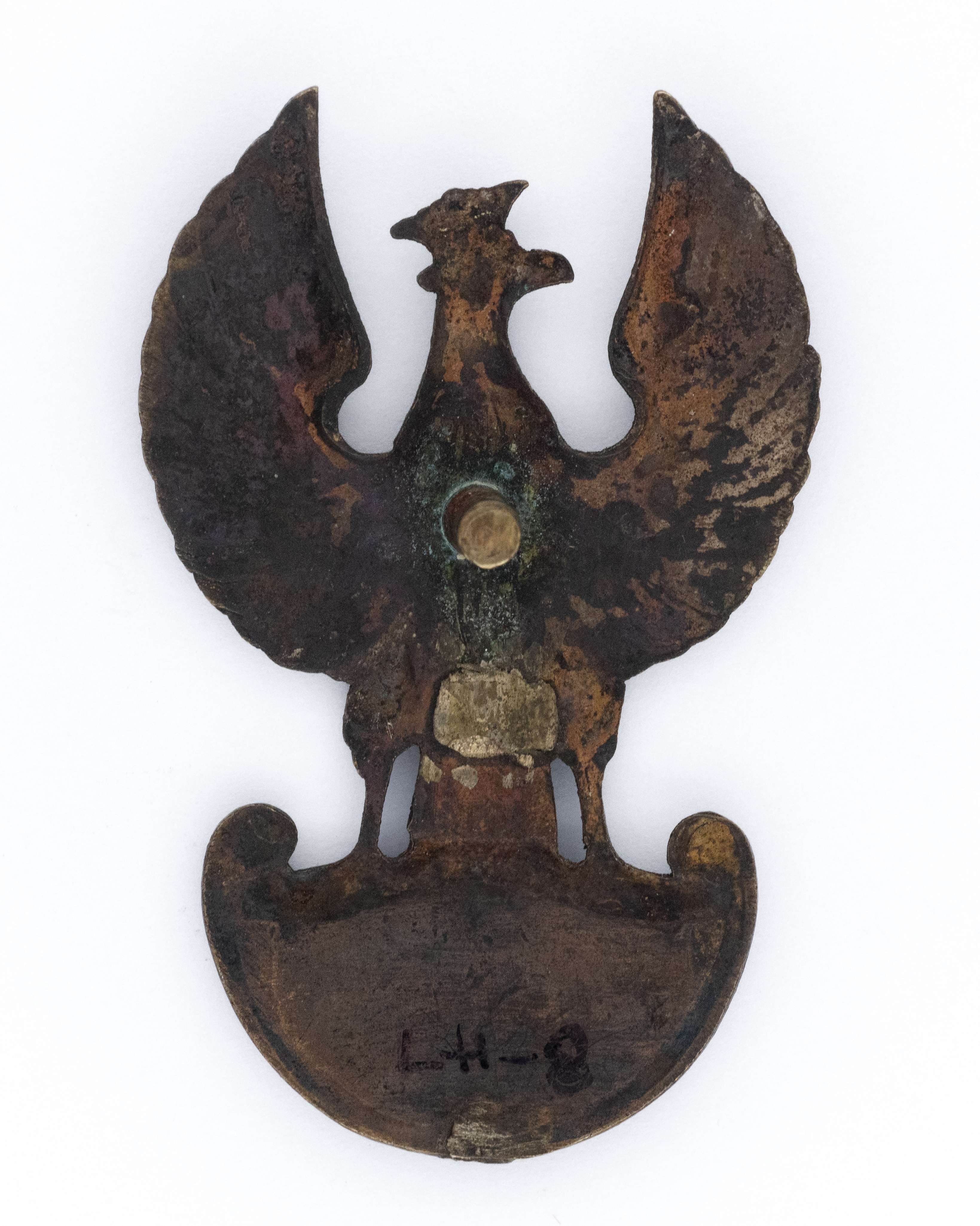 Orzeł oficerski Wojsko Polskie we Francji, cyfra "5" na tarczy amazonek. 52,5 x 33mm. Wykonany z mosiądzu srebrzonego. Wieloczęściowy - cyfra nakładana. Na rewersie rozlana kontra wskazująca na odlew. Mocowany na słupek, brak nakrętki. Lit. Tomasz Zawistowski, Polskie orły do czapek w latach 1917-19, str. 142. Stan bardzo dobry.
