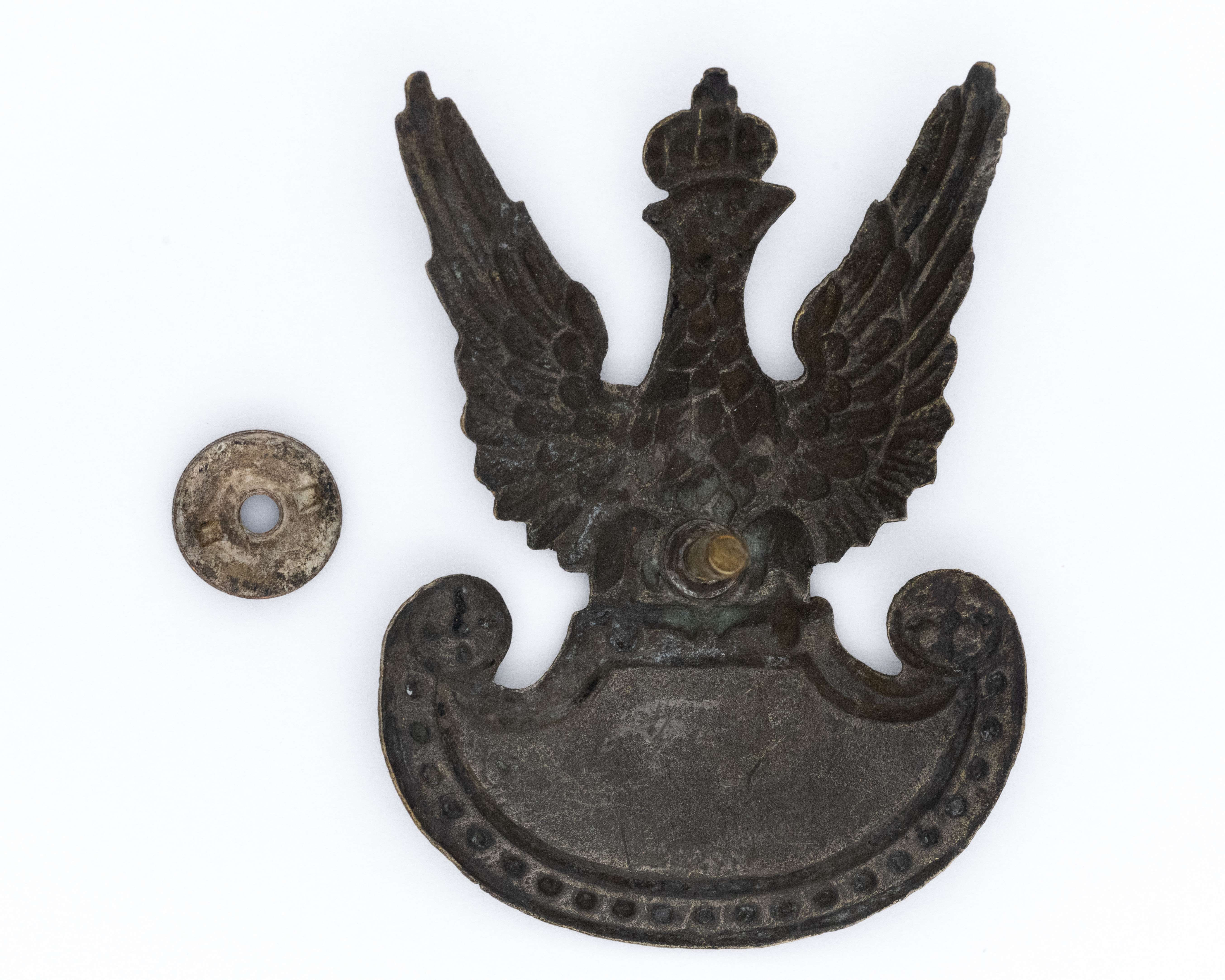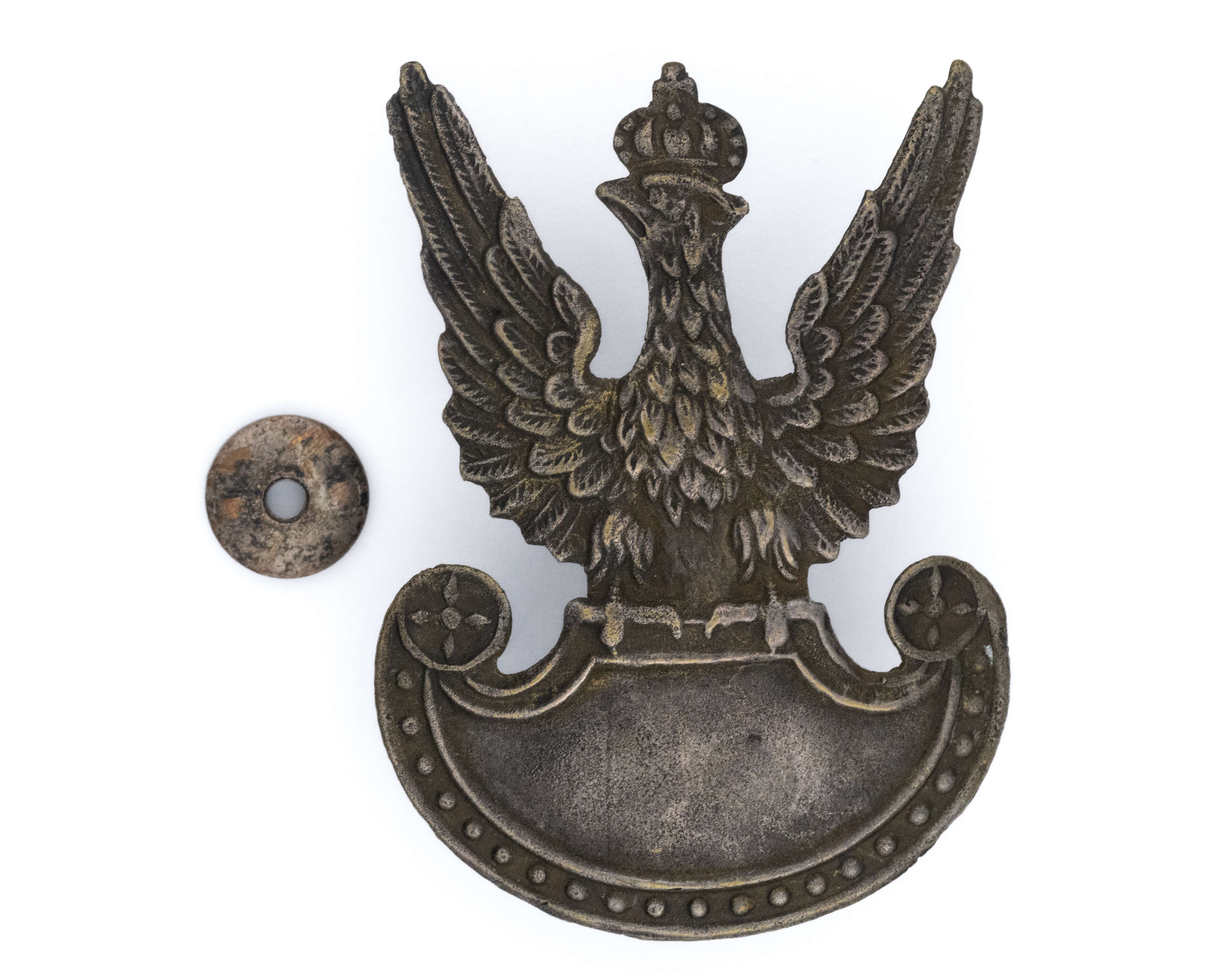 Orzeł wz. 19. 58,5 x 42,5mm. Wykonany z mosiądzu srebrzonego. Rewers z kontrą. Mocowany na słupek z niesygnowaną nakrętką o średnicy 11mm. Stan bardzo dobry.
