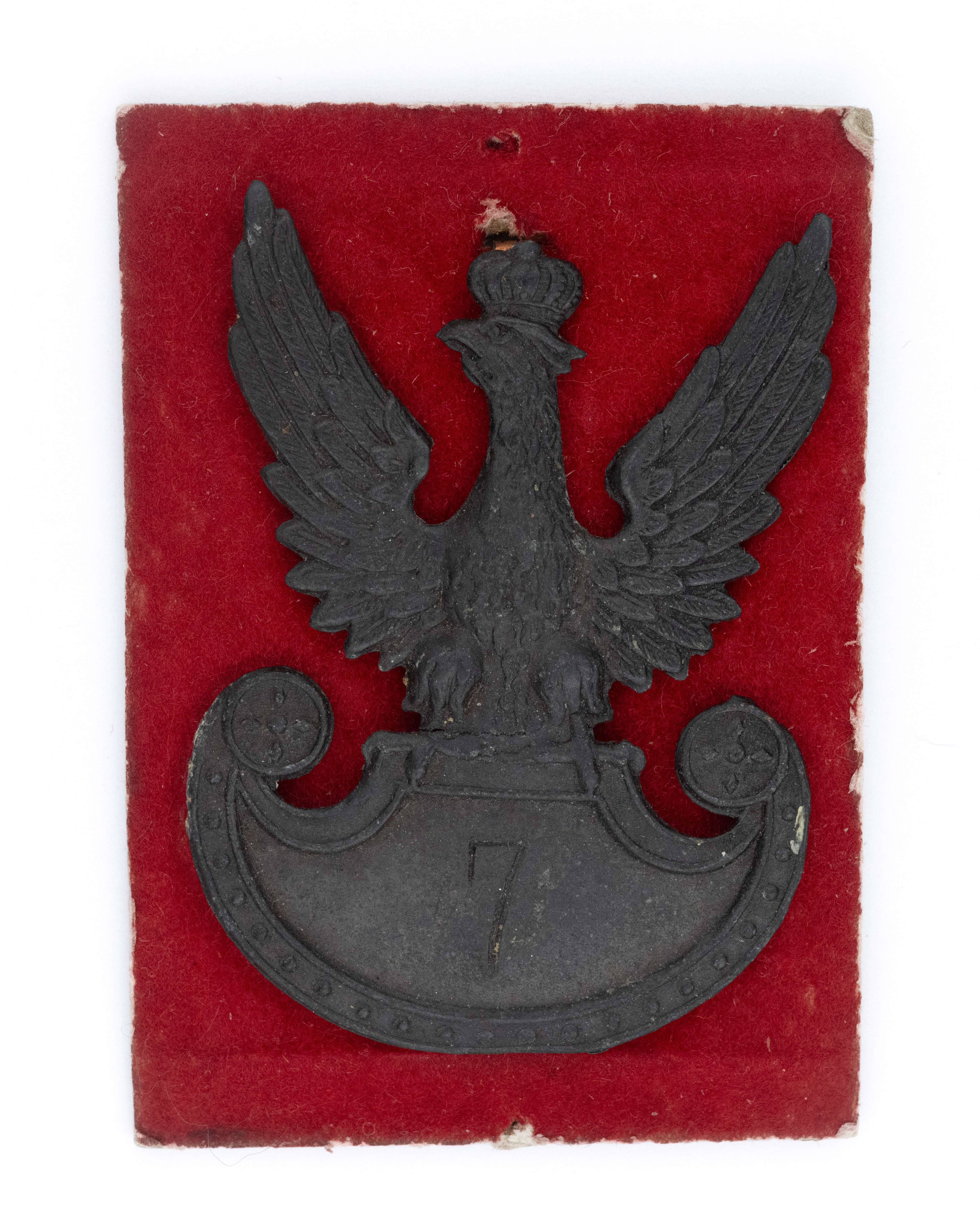 Orzeł wz. 19 - 7 Pułk Piechoty/Ułanów (?). 60 x 42,5mm. Wykonany z blachy cynkowej. Na tarczy amazonek rytowana cyfra "7". Rewers z kontrą. Brak oryginalnego mocowania- wtórnie przylutowana blaszka. Umieszczony na tekturowej podkładce oklejonej czerwonym materiałem, na rewersie opisana- 7 Pułk Ułanów 1920. Stan bardzo dobry.