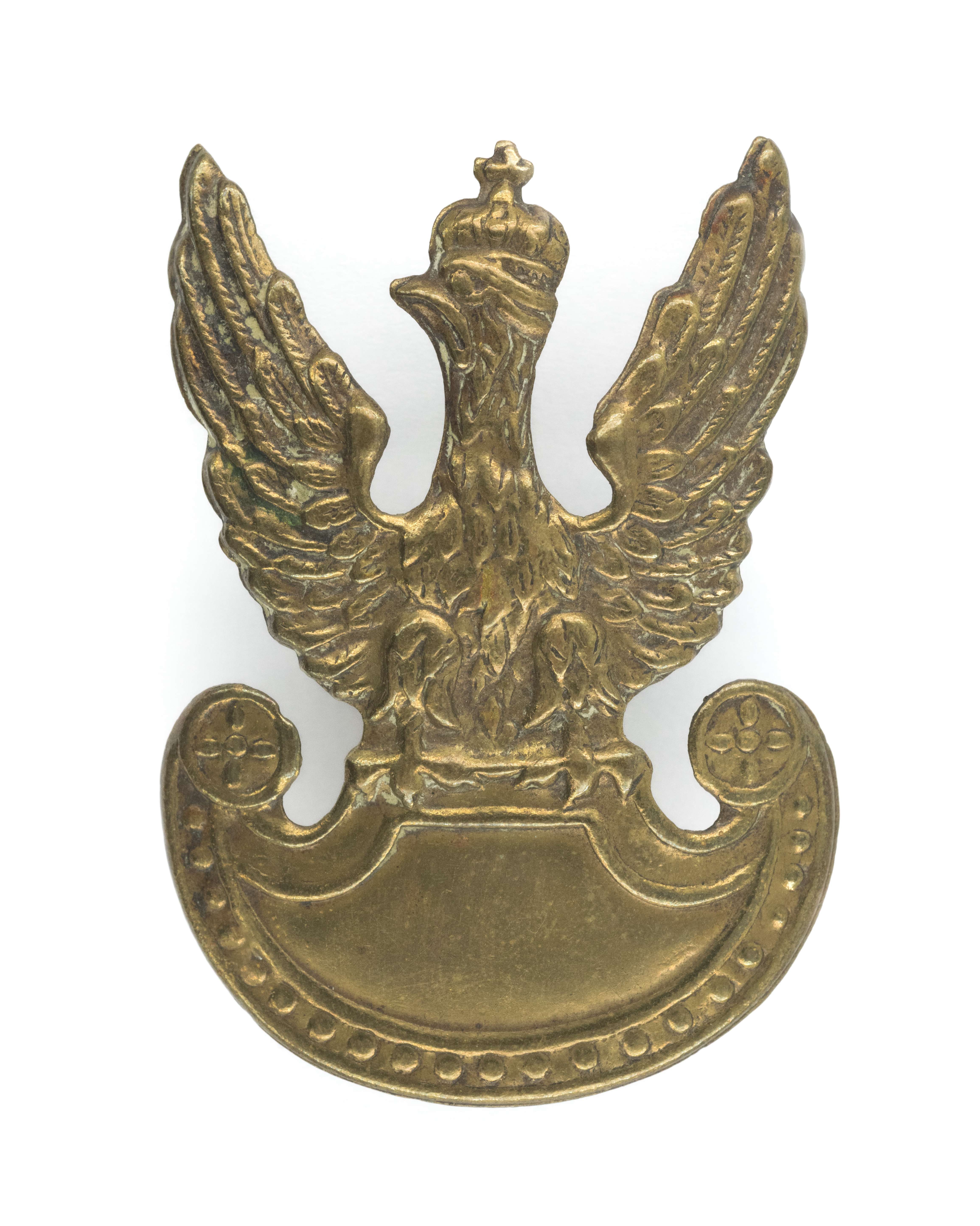 Orzeł wz. 19. 61x43mm. Wykonany z mosiądzu. Rewers z kontrą. Mocowany na słupek, brak nakrętki. Stan dobry.