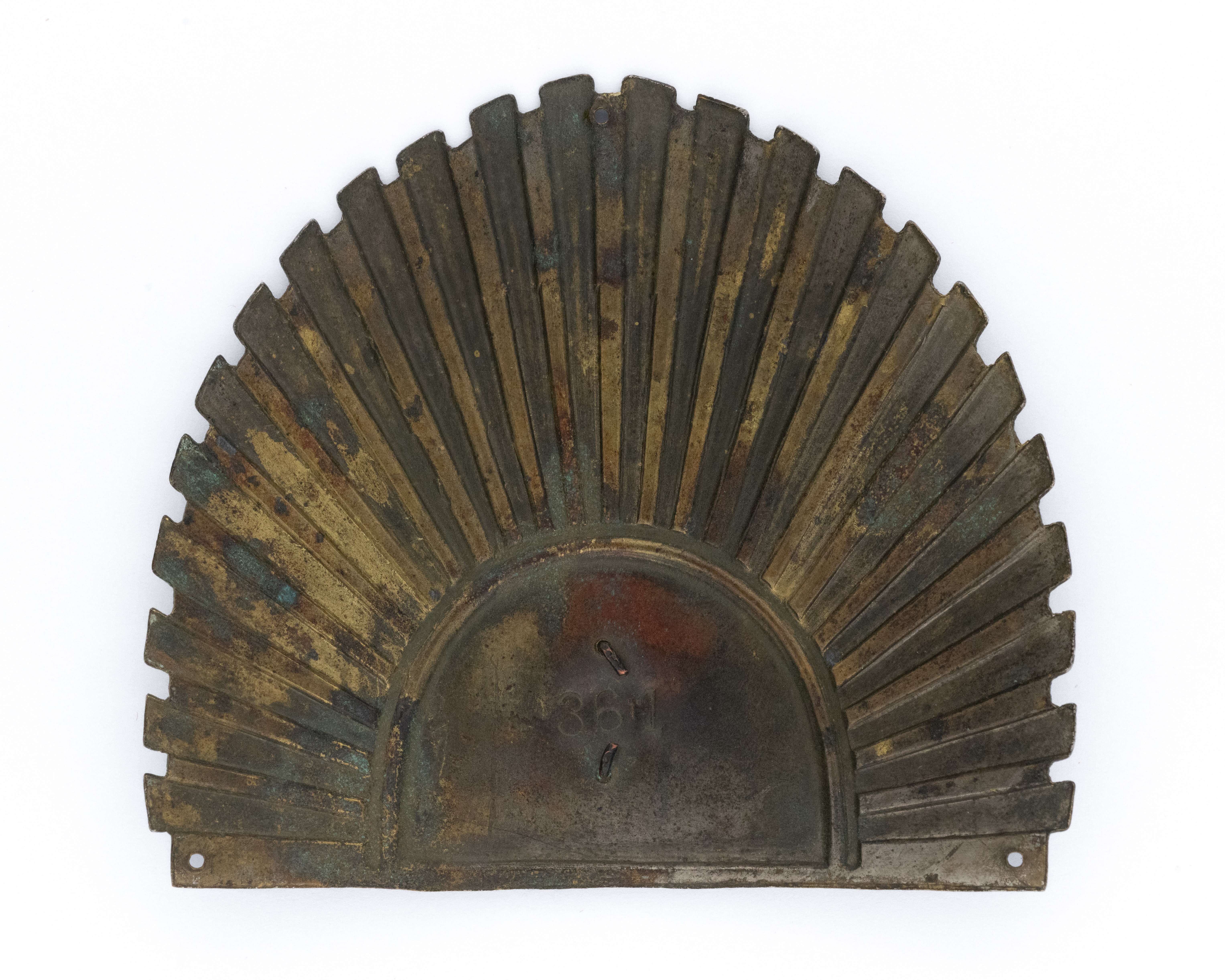 Półsłońce kadeckie / Orzeł Kadecki - wersja z orłem wz. 19. 70 x 78mm. Wykonane z mosiądzu srebrzonego. Wieloczęściowe - mosiężny orzełek 165x17mm, nakładany i mocowany na dwa druty. Rewers z kontrą oraz wybitym numerem 361. 3 dziurki do przyszycia Lit. Tomasz Zawistowski, Polskie orły do czapek w latach 1919-1939, str. 117-119. Stan bardzo dobry.