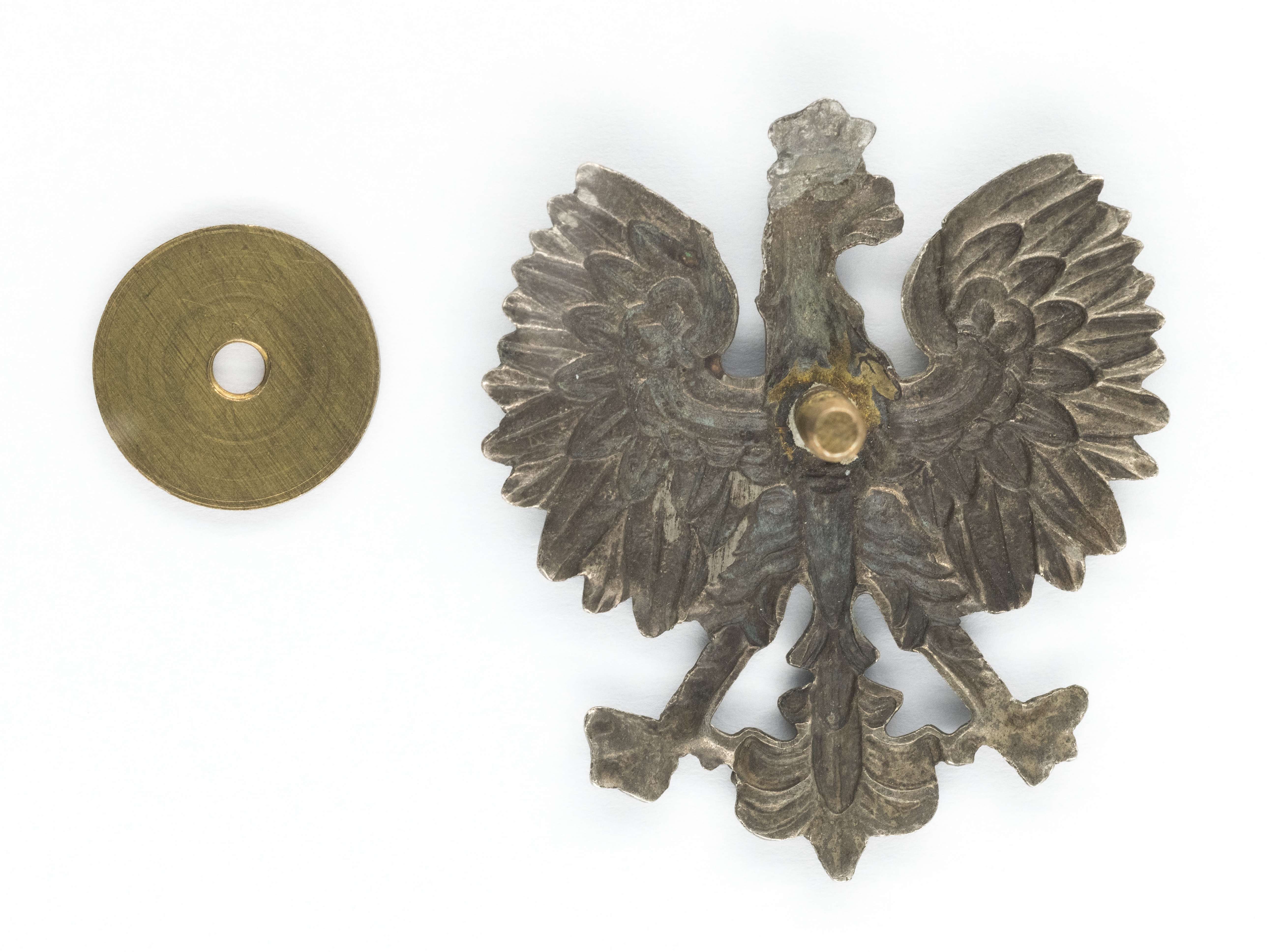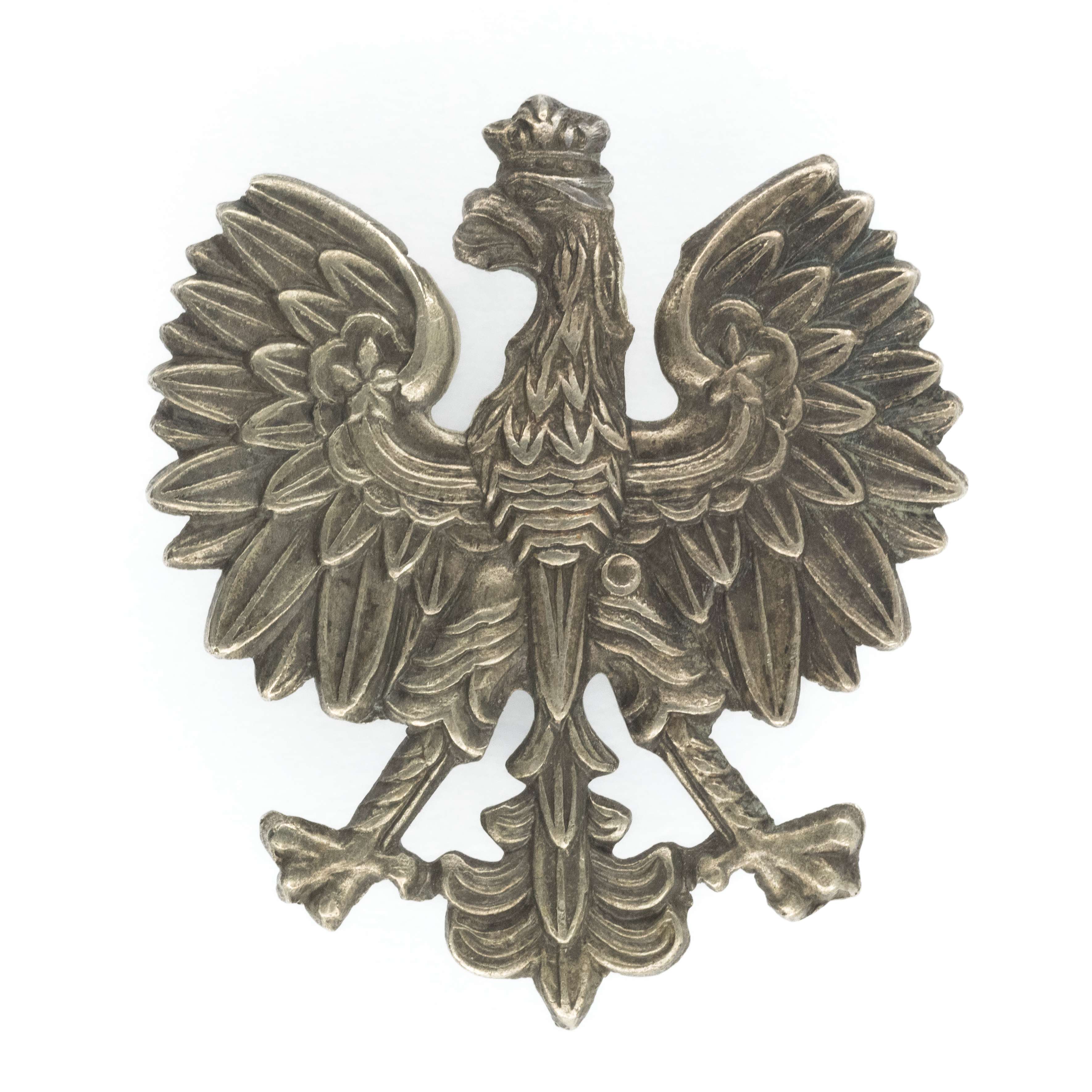 Orzeł wz. 27. 33x38mm. Wykonany z alpaki. Rewers z kontrą. Mocowany na słupek. Orły tego wzoru używane były min. w Policji Państwowej i Służbie Więziennej. Stan bardzo dobry.