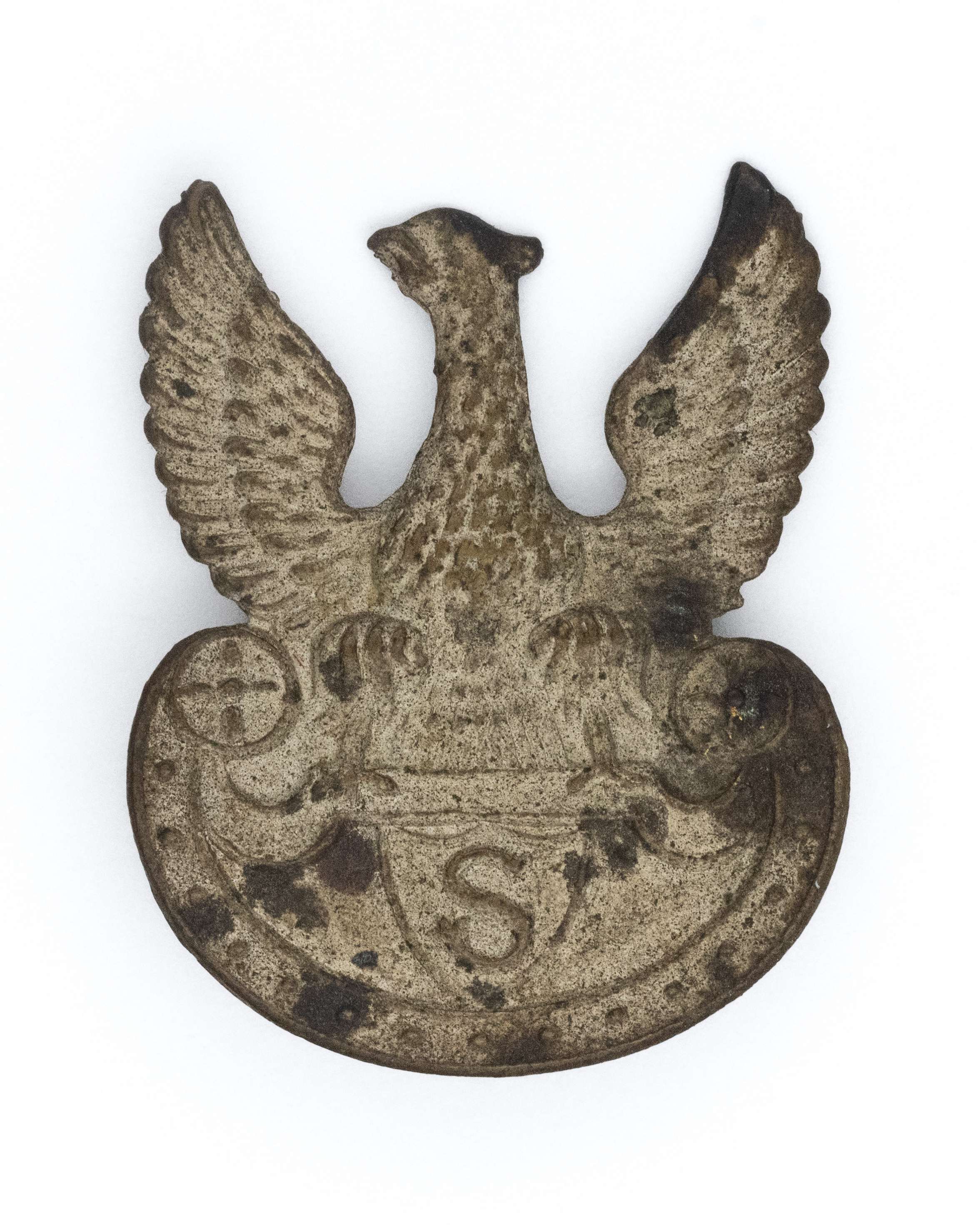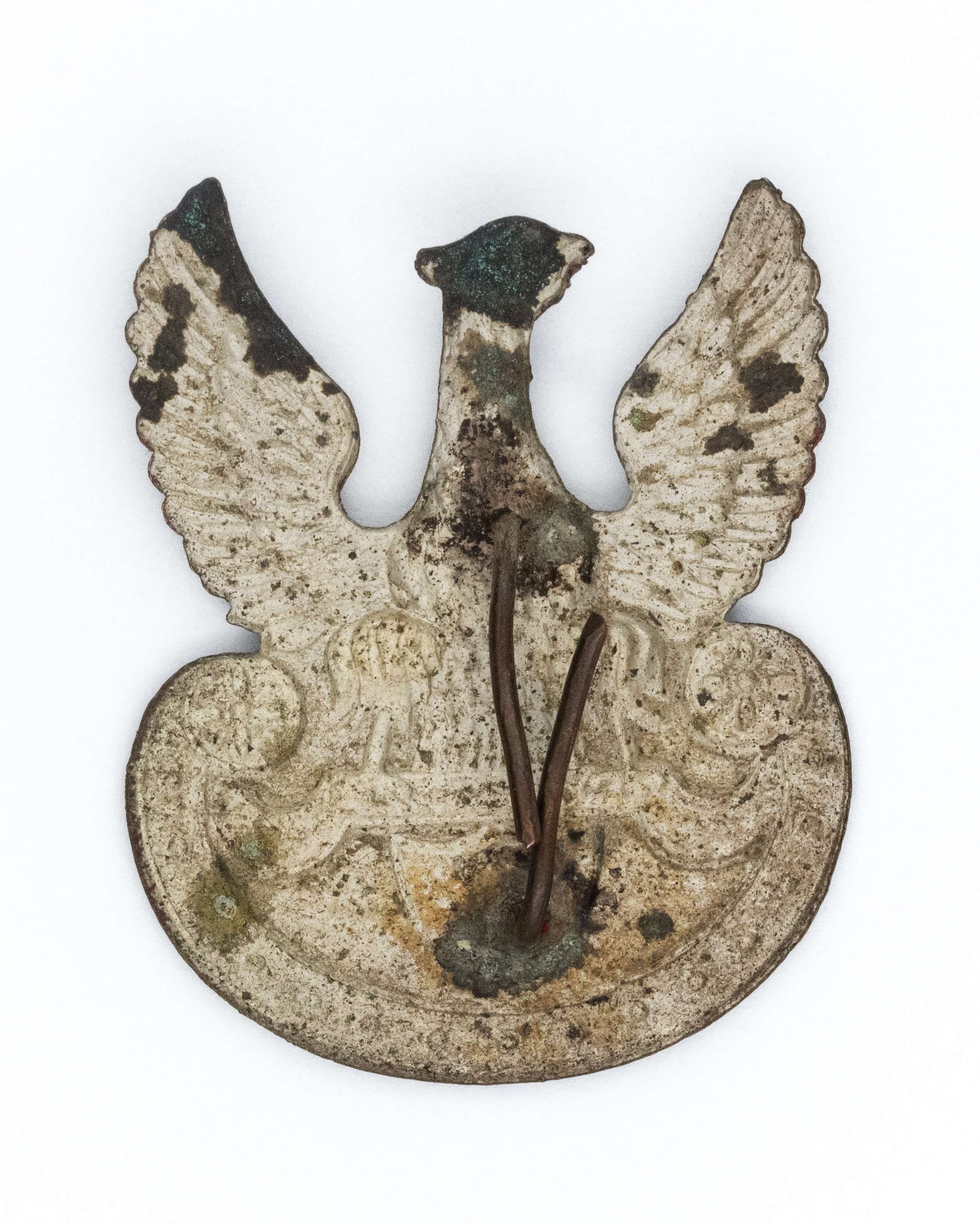 Orzeł odtworzony Związek Strzelecki. Skarnik Fiszbein Warszawa. 36,5x29mm. Wykonany z mosiądzu srebrzonego. Rewers z kontrą. Mocowanie na dwa druty. Lit. Tomasz Zawistowski, Polskie Orły do czapek w latach 1900-17, str.256. Stan bardzo dobry.