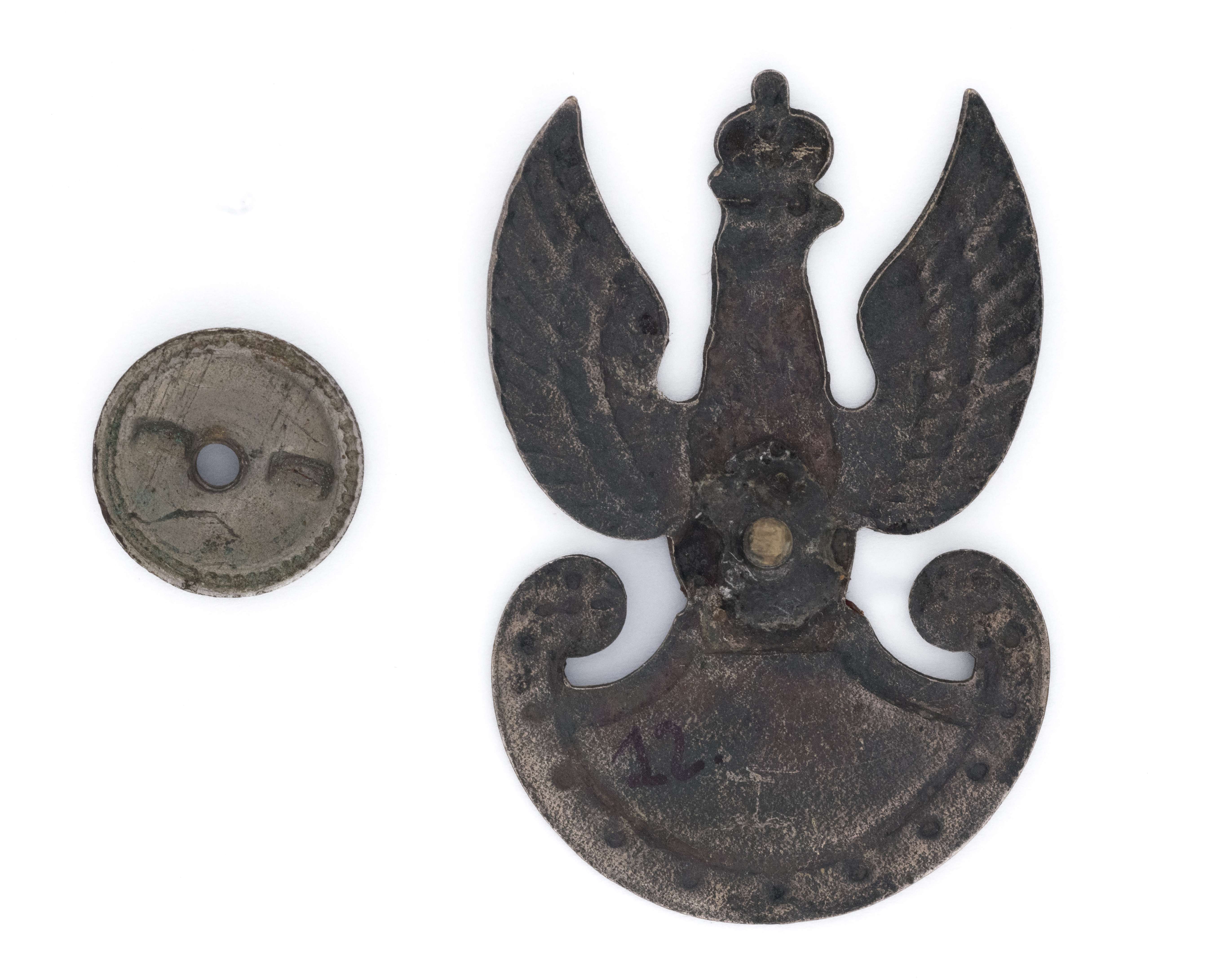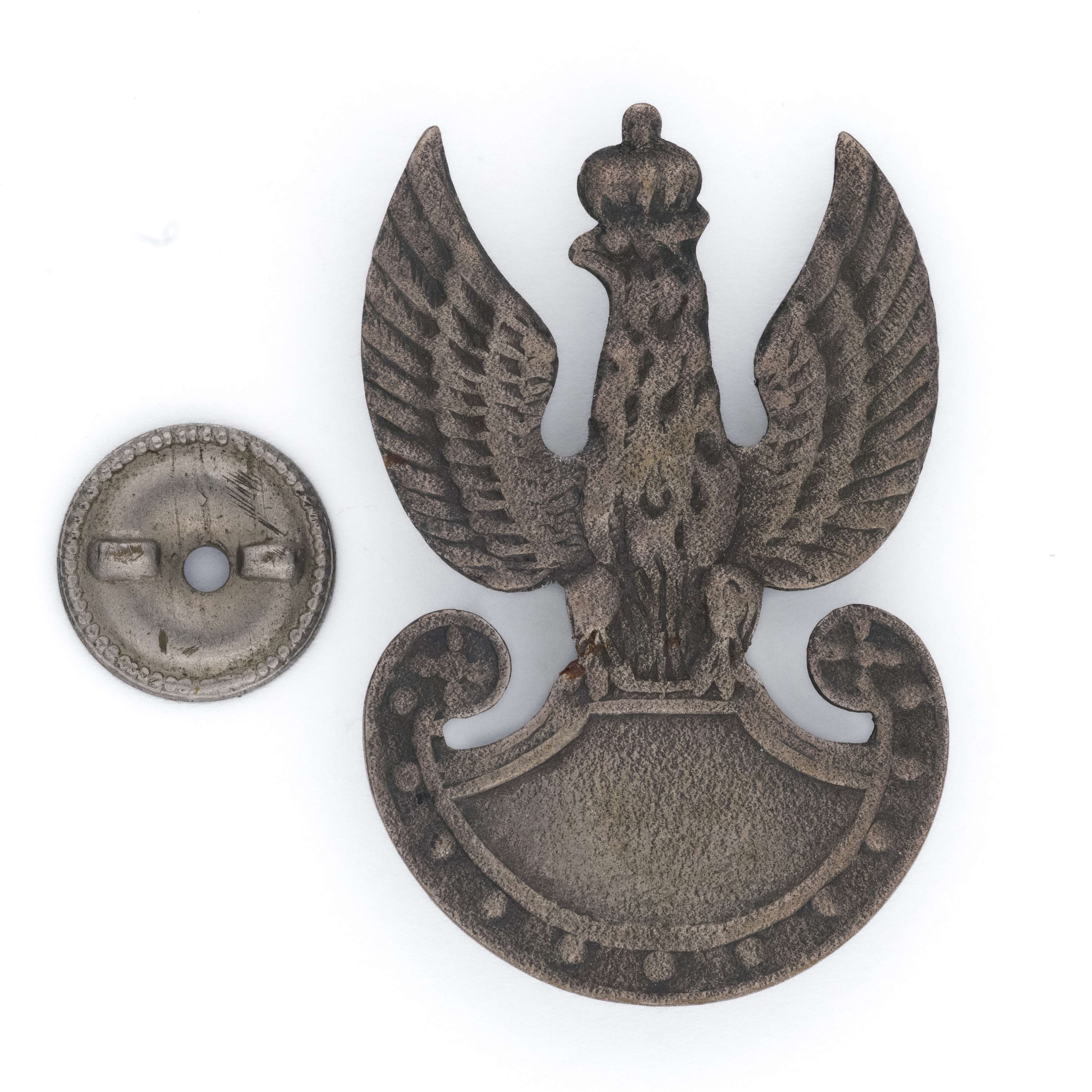 Orzeł wz. 39, Środkowy Wschód. 54 x 35mm. Wykonany z białego metalu. Rewers z kontrą. Mocowany na słupek z niesygnowaną nakrętką o średnicy 17mm. Lit. Tomasz Zawistowski, Orły do czapek w 2. Korpusie Polskim, str. 115, il. 147. Stan bardzo dobry.
