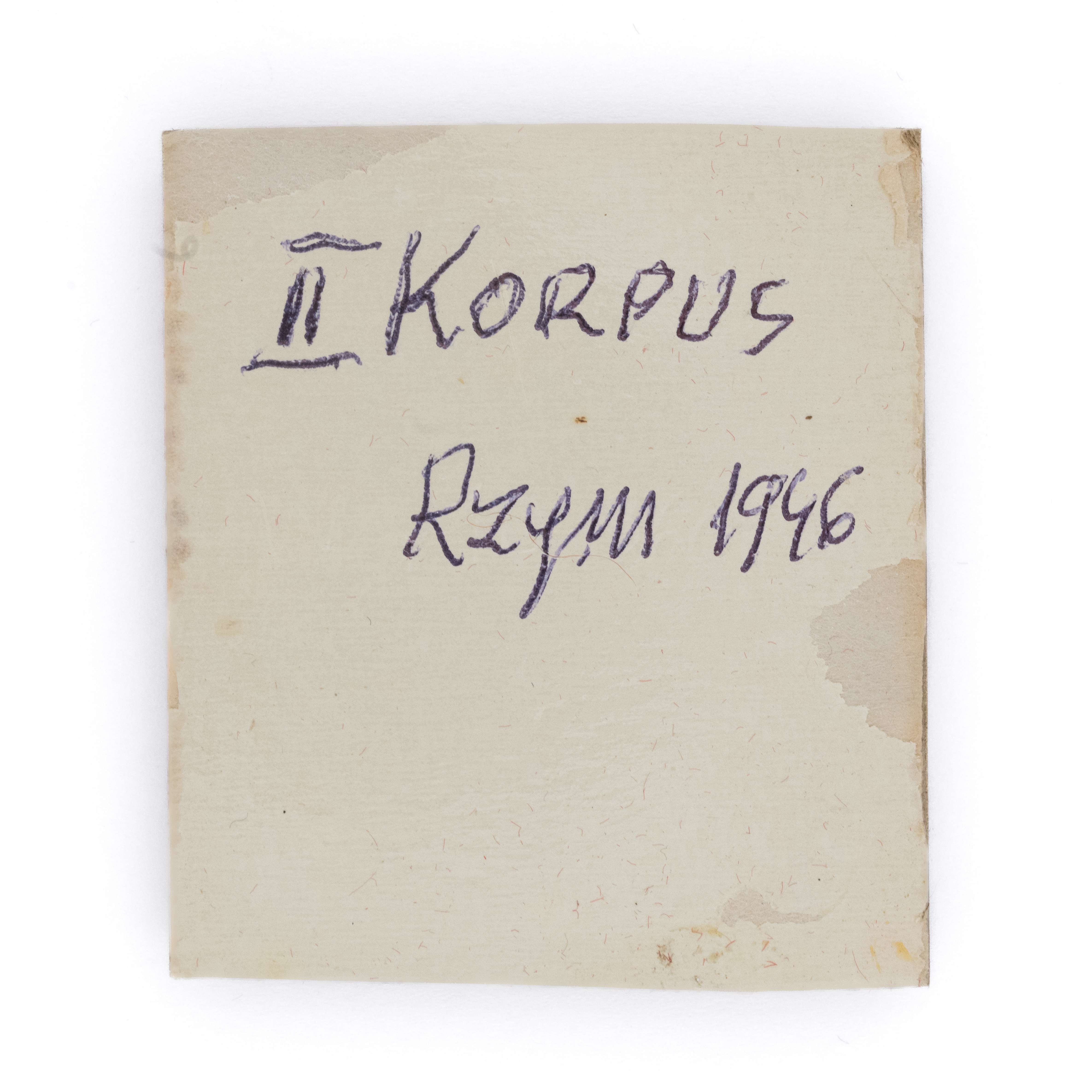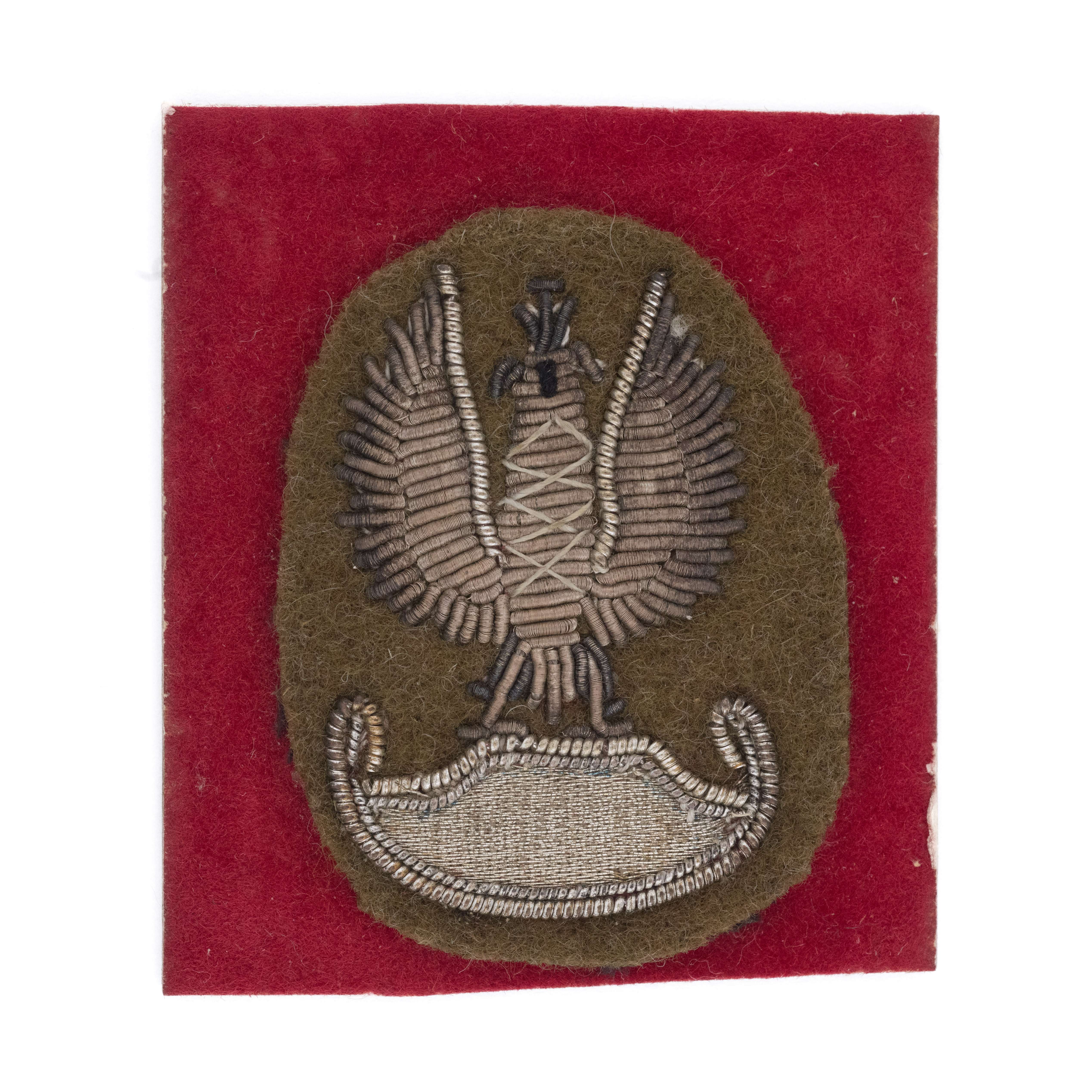 Orzeł haftowany bajorkiem. 37 x 49mm. Haft ręczny złotym i srebrnym bajorkiem na sukiennej podkładce w kolorze khaki. Umieszczony na tekturowej podkładce oklejonej czerwonym materiałem, na rewersie opis- II KORPUS Rzym 1946. Lit. Tomasz Zawistowski, Orły do czapek w 2 Korpusie Polskim, str. 194-236. Stan bardzo dobry.