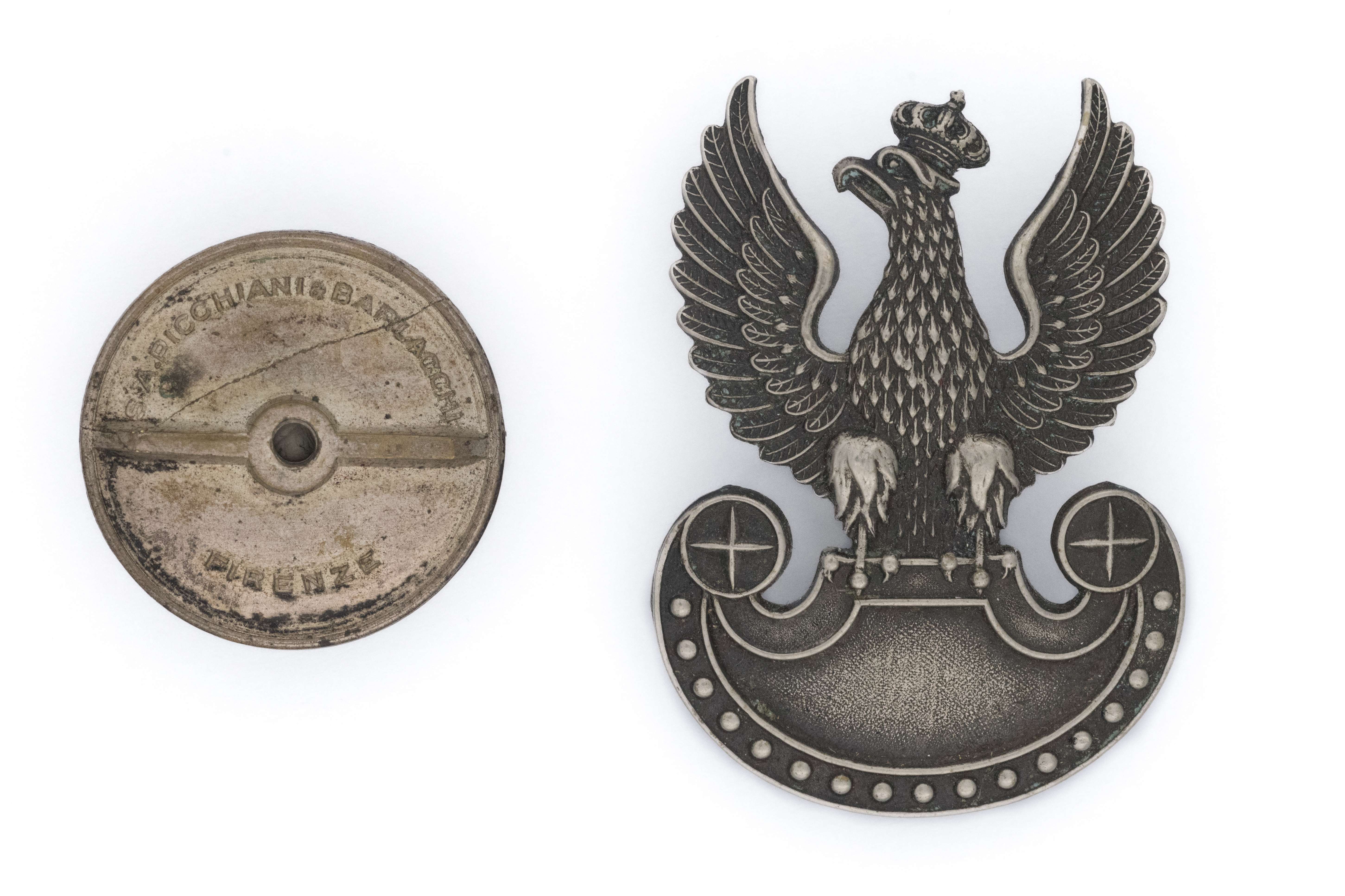 Orzeł firmy Picchiani & Barlacchi. 47x34mm. Wykonany z alpaki. Rewers z kontrą. Mocowany na słupek z nakrętką o średnicy 26,5mm, sygnowaną Picchiani&Barlacchi Firenze- nakrętka posiada charakterystyczną "rysę" od uszkodzonej matrycy. Lit. Tomasz Zawistowski, Orły do czapek w 2. Korpusie Polskim, str.253. Stan bardzo dobry.
