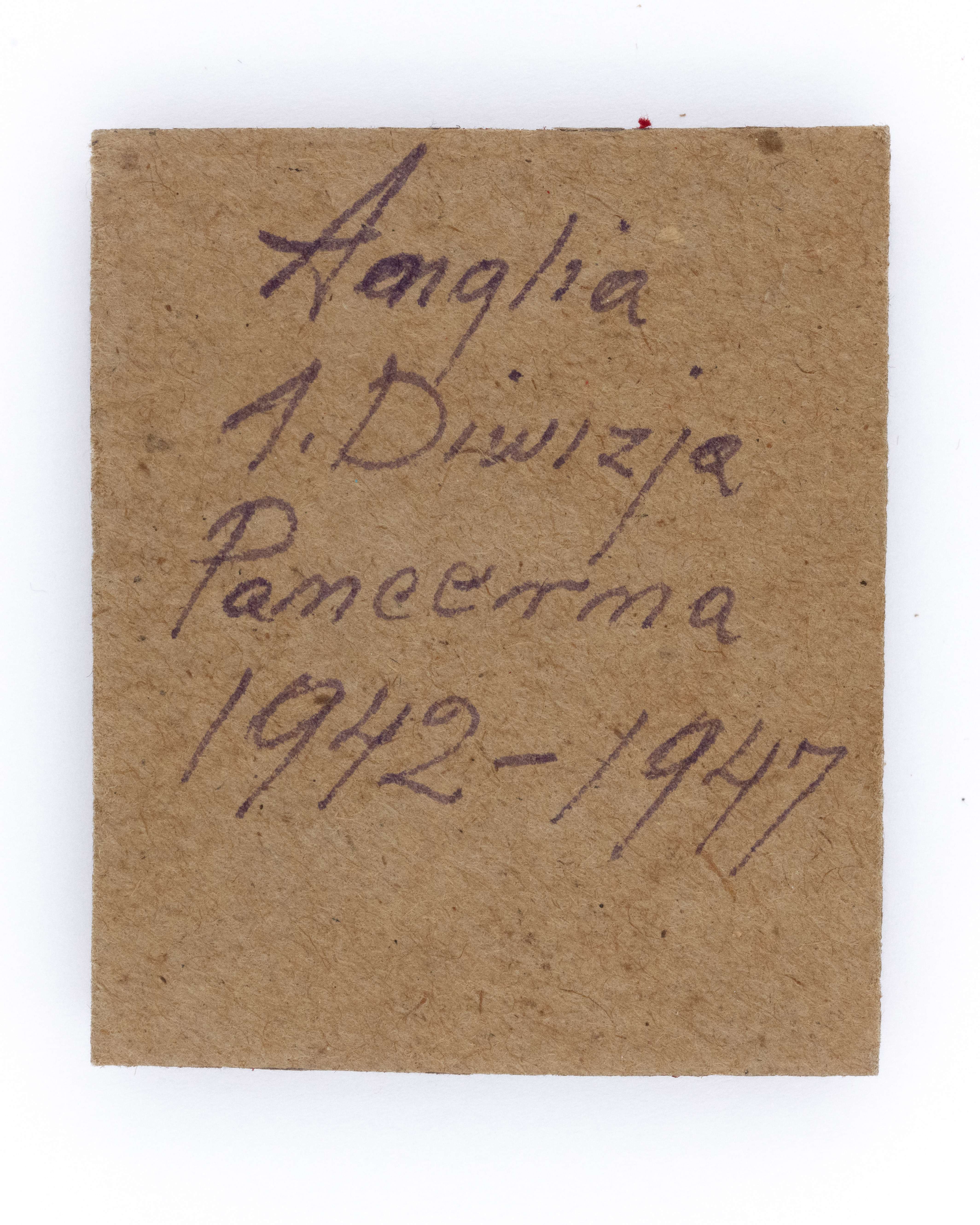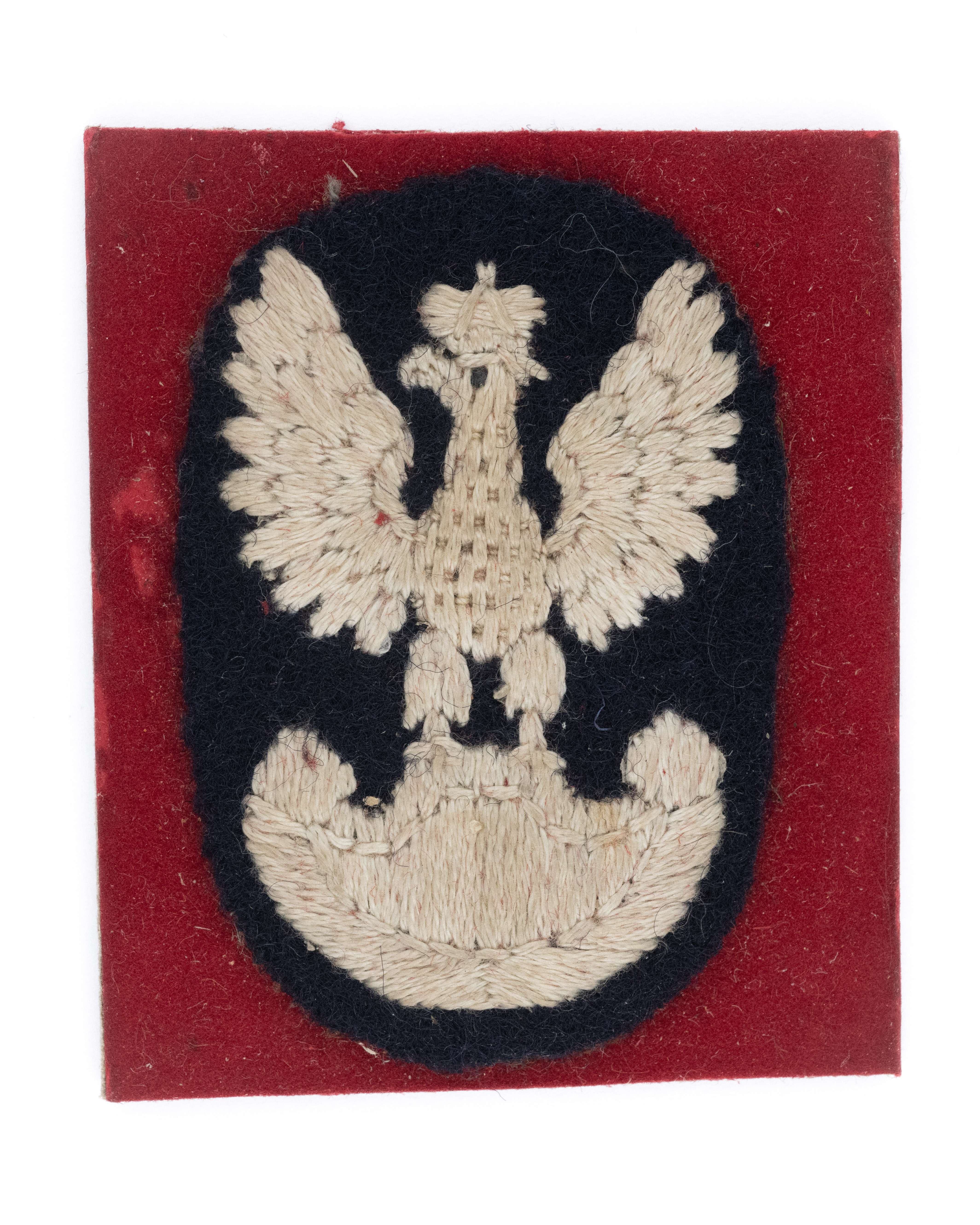 Orzeł haftowany ręcznie. 36 x 53mm. Haft ręczny bawełnianą białą nicią na sukiennym podkładzie w kolorze czarnym. Umieszczony na tekturowej podkładce oklejonej czerwonym materiałem, na rewersie opis- Anglia 1. Dywizja Pancerna 1942-1947. Stan bardzo dobry.