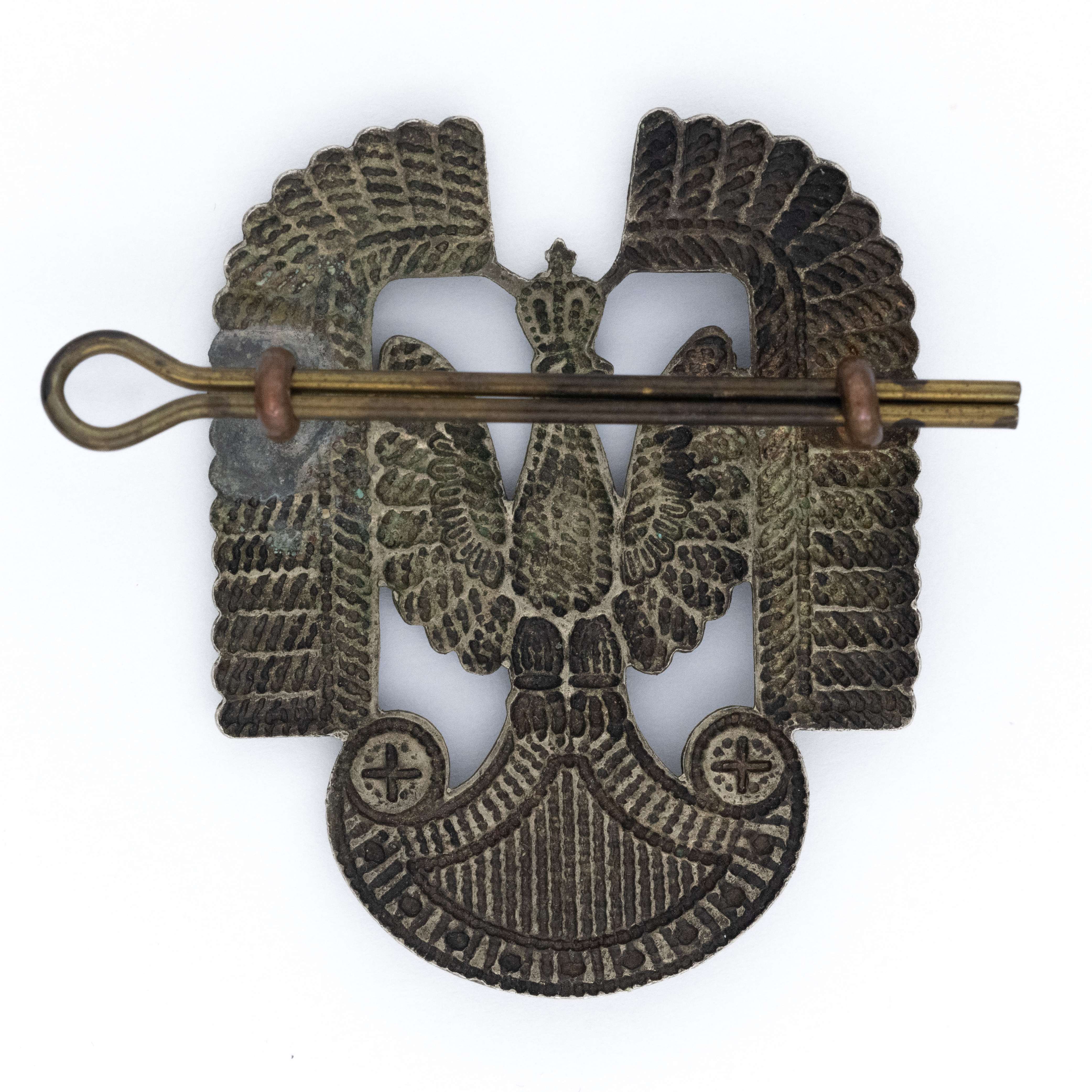 Orzeł lotniczy o powierzchni odwzorowującej rysunek bajorka. 47x38mm. Wykonany w mosiądzu, srebrzony. Rewers z kontrą. Mocowany na dwie omegi z przetyczką. Lit. Tomasz Zawistowski, Polskie orły do czapek w latach 1939-45, str. 115-118. Stan bardzo dobry.
