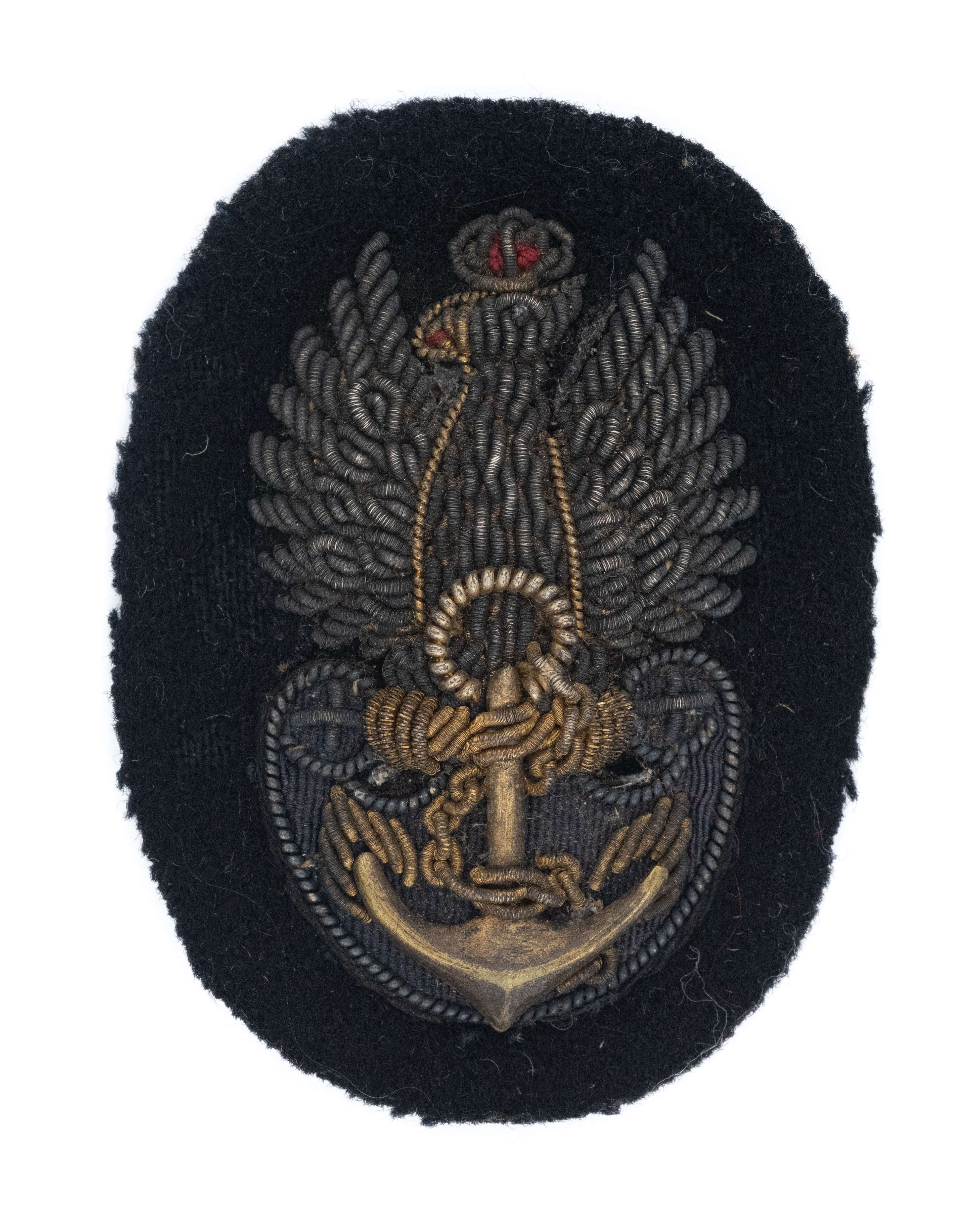 Orzeł bosmanów i podchorążych Polska Marynarka Wojenna. 58 x 43mm. Haft ręczny bajorkiem złotym i srebrnym na sukiennej podkładce w kolorze granatowym. Rewers niezaklejony. Lit. Tomasz Zawistowski, Polskie orły do czapek w latach 1939-1945 str. 128. Stan bardzo dobry.